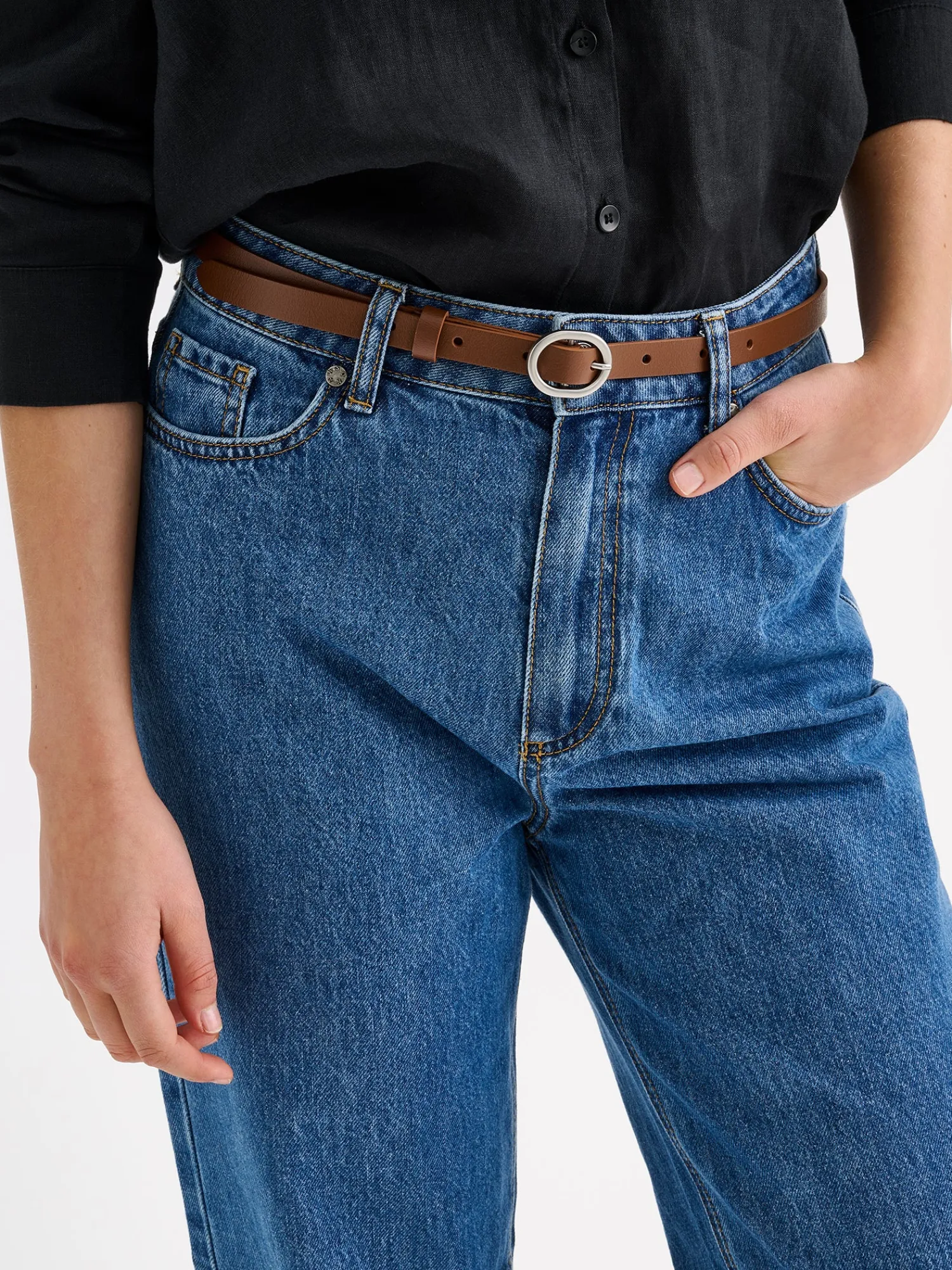 Naisten klassinen ruskea nahasta valmistettu Joanne-vyö. Vyössä on seitsemän reikää itselle sopivan koon säätämistä varten – vyötä voi käyttää sekä lantiolla että vyötäröllä. Vyössä on metallinen pyöreä solki, joka on matta hopean värinen. Tuote on valmistettu sertifioidusta nahasta. Vyön leveys on noin 1,6 cm. Vyötä on saatavilla kahdessa eri pituudessa.