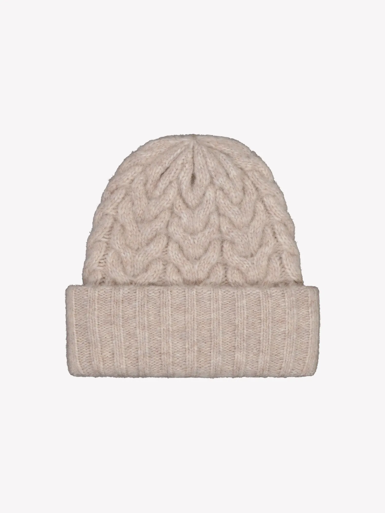 Naisten muhkea beige Kierre-neulepipo kauniilla palmikko kuviolla. Pipon reunassa on käännettävä, joustava ribbineulos. Neulos on laadukasta sertifioitua villa-polyamidisekoitetta. Neuleen hoito-ohjeet löydät