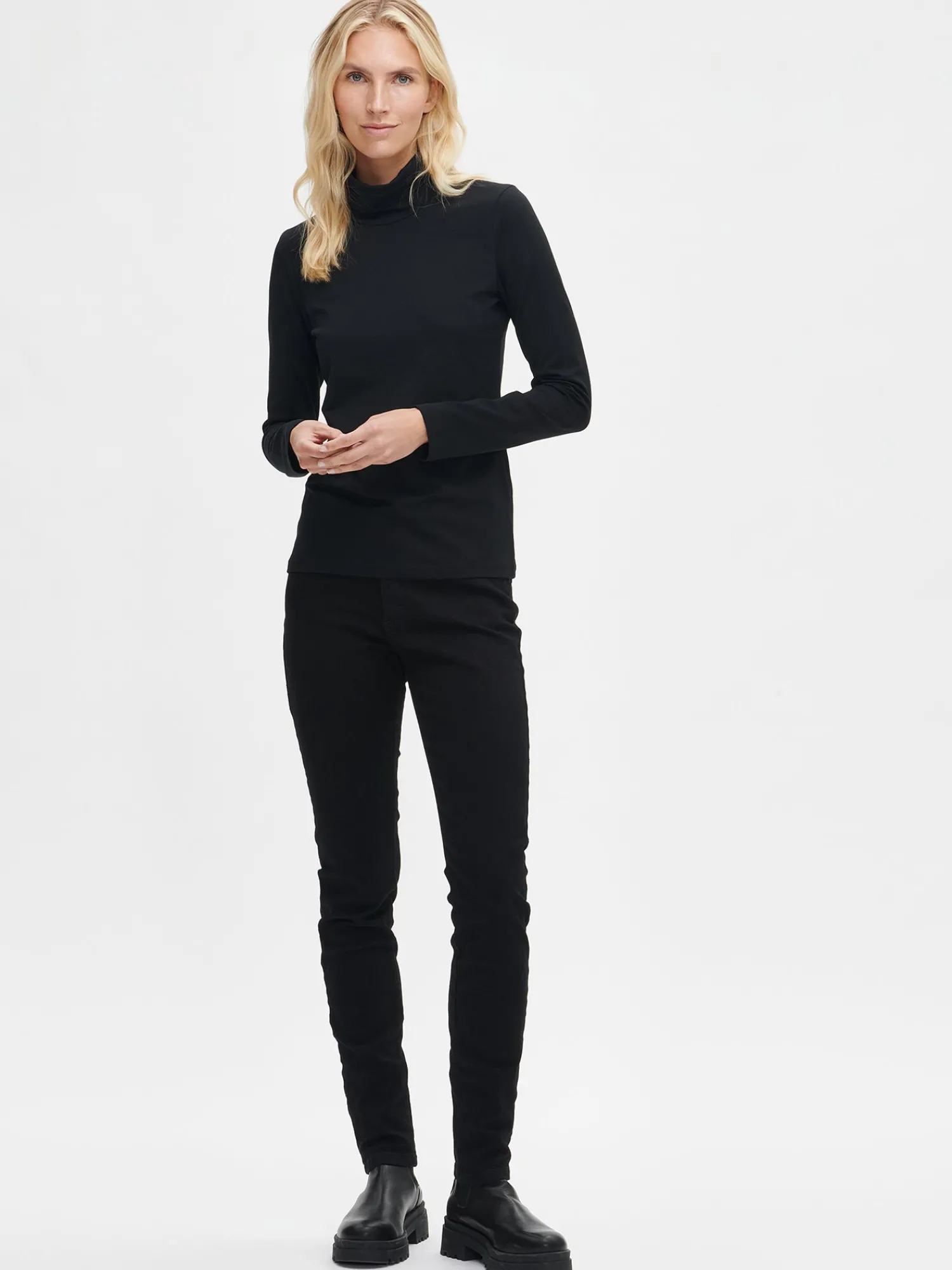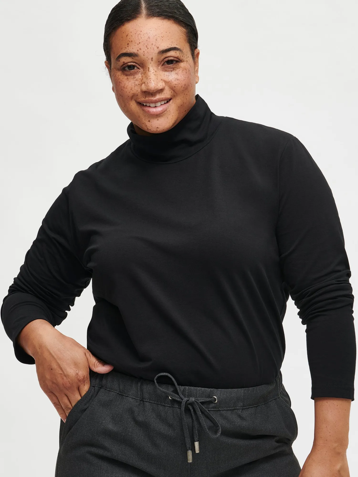 Naisten musta Mari-poolopusero. Istuva poolo on ajaton klassikko, johon haluaa pukeutua vuodesta toiseen. Monikäyttöisen poolon voi pukea myös lyhythihaisen mekon tai paidan alle. Istuvassa matalakauluksellisessa poolopuserossa on täyspitkät hihat. Puseron pituus koossa M on noin 65 cm. Poolon materiaali on miellyttävää ja joustavaa luomupuuvilla-elastaani-neulosta.