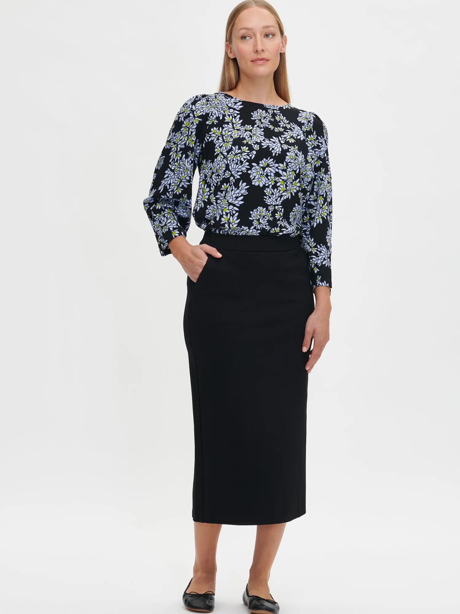 Naisten klassinen musta Amanda-hame. Ajaton hame on helppo yhdistää erilaisiin yläosiin ja se onkin yksi vaatekaapin monipuolisimmista vaatteista. Suoralinjaisessa hameessa on joustava vyötärökaitale, sivuissa taskut ja helmassa keskellä takana halkio. Hameen pituus koossa M on noin 84 cm. Materiaali on laadukasta, mattapintaista, pehmeän tuntuista ja helppohoitoista viskoosi-polyamidi-elastaani-neulosta. Materiaalille on ominaista 3-5 % kutistuminen.