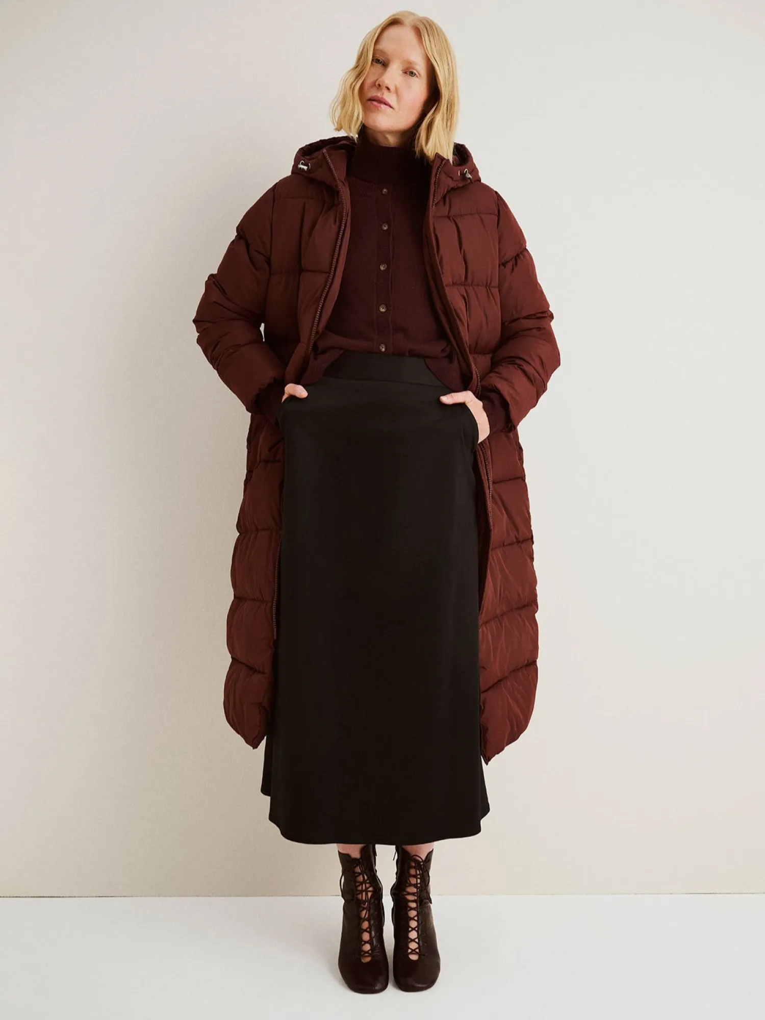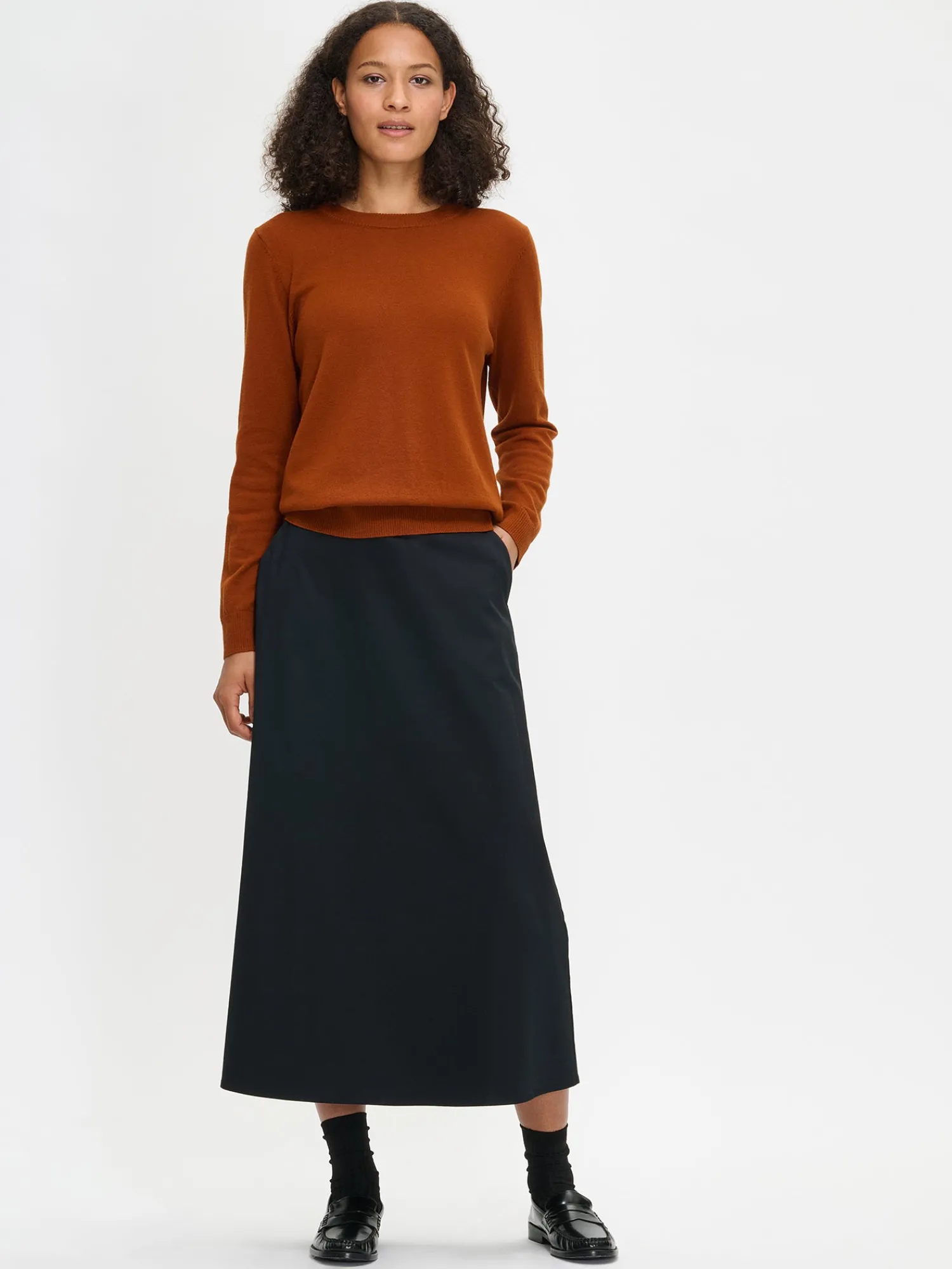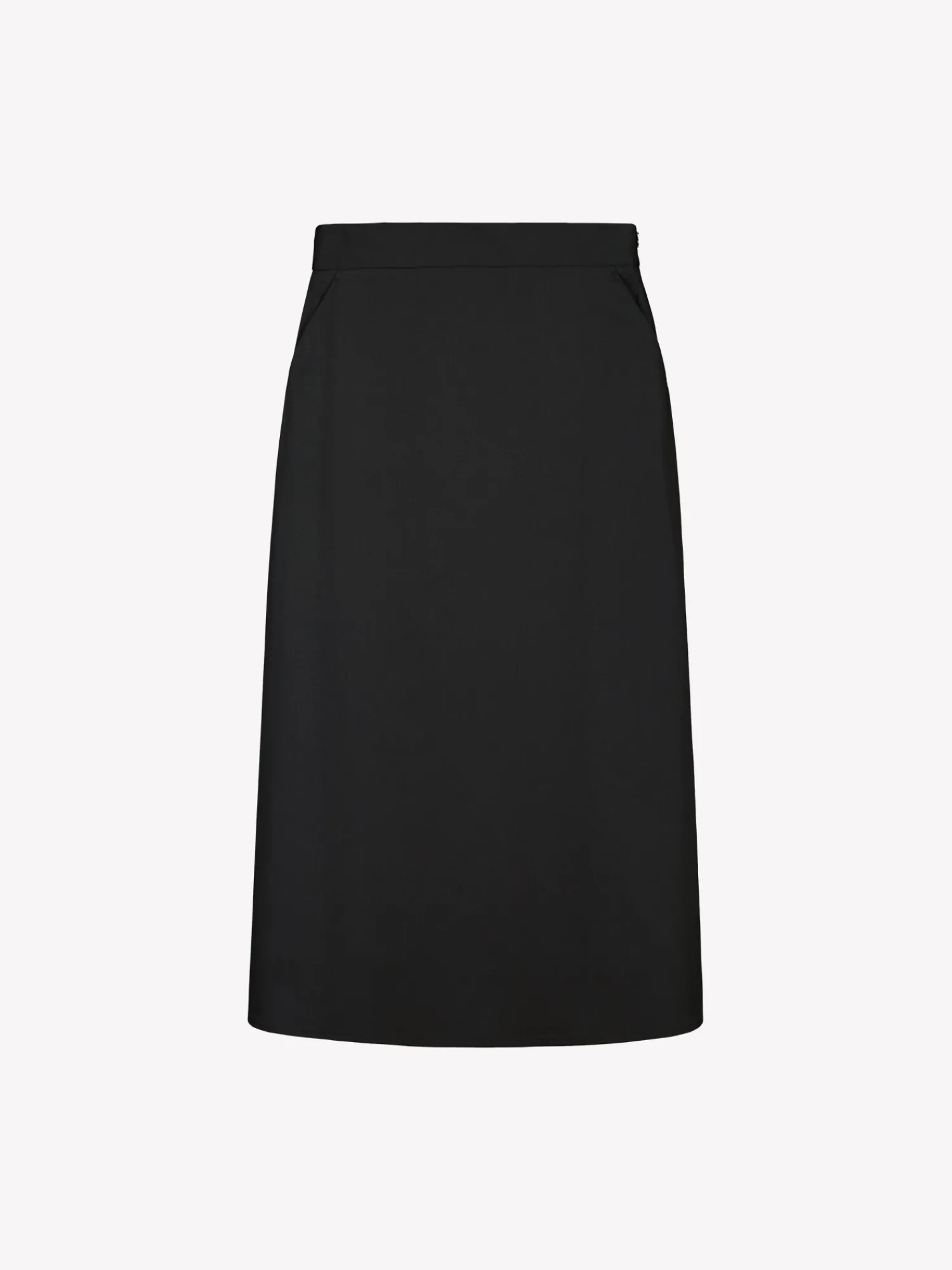 Naisten yksivärinen musta Milla-hame. A-linjaisessa vuoritetussa hameessa on leveä vyötärökaitale, sivutaskut ja sivussa piilovetoketju. Hameen pituus koossa 38 on noin 85 cm. Materiaali on kudottua puuvilla-satiinia, jossa mukana elastaania antamassa joustoa. Vuoren materiaali on laskeutuvaa polyester-kangasta.