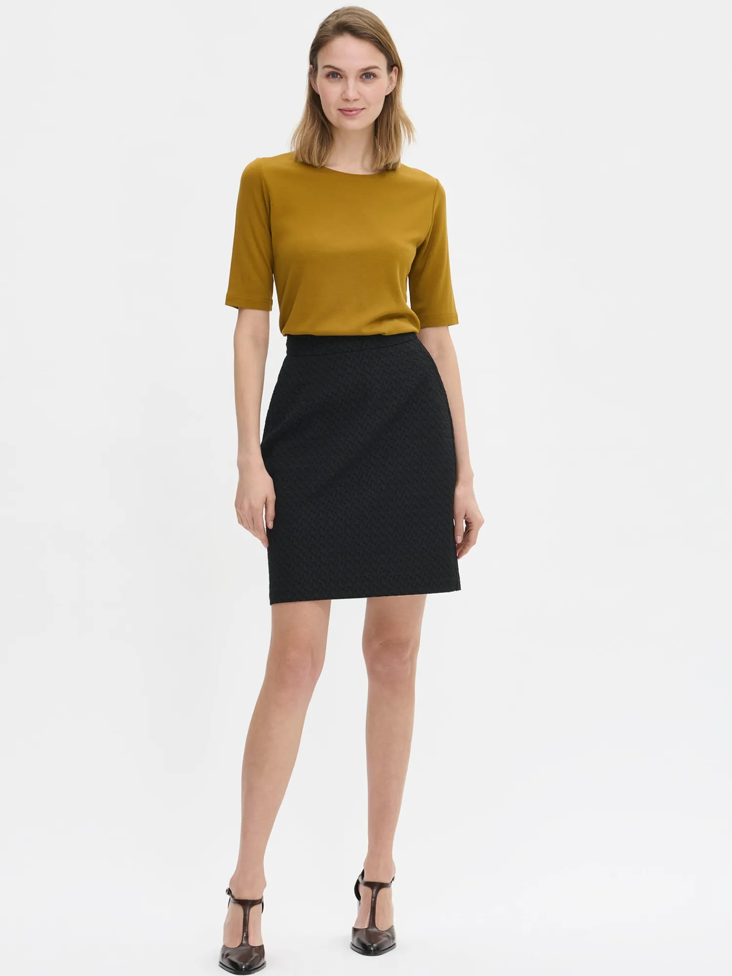 Naisten tyylikäs musta kuviopintainen Reliefi-hame. Tyylikäs hame on täydellinen niin arkeen kuin juhlaan – yhdistä se vaikka saman sarjan Reliefi-puseroon. Hameessa on kiinteä vyötärö, sivutaskut ja takana piilovetoketju. Istuvassa suorahelmaisessa hameessa on muotolaskokset edessä ja takana sekä takahalkio. Hame on vuoritettu. Hameen pituus koossa 38 on noin 55 cm. Materiaali on miellyttävän tuntuista kudottua polyesteri-viskoosi-elastaani -kangasta, jossa on kaunis pintastruktuuri. Materiaalille on ominaista 3-5% kutistuminen ensimmäisessä pesussa. Suosittelemme pesua ennen käyttöä, koska tuotteesta saattaa irrota väriä ennen ensimmäistä pesua.