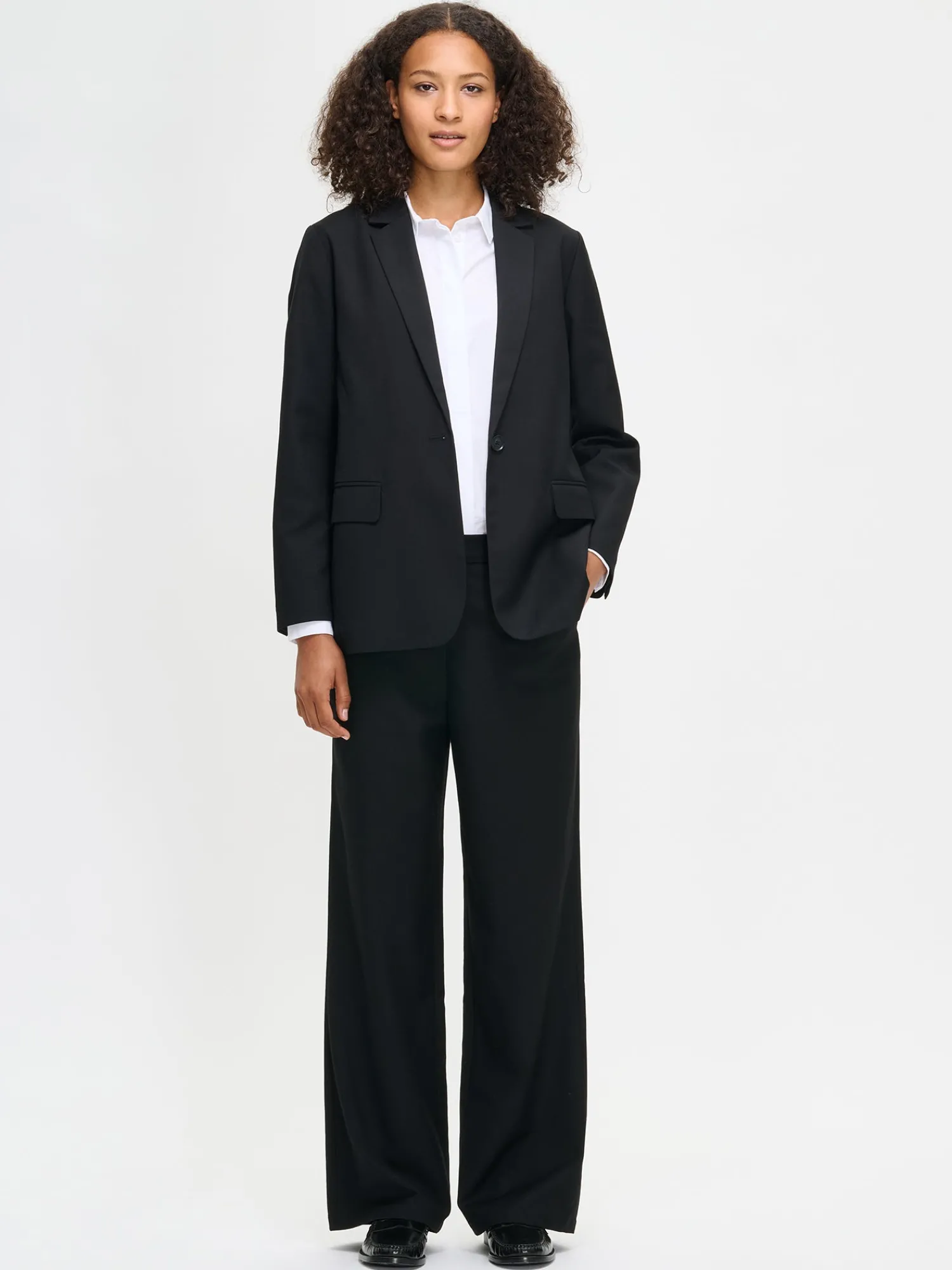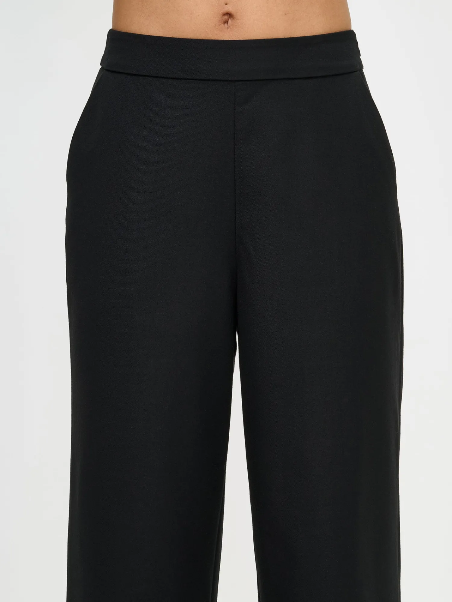 Naisten mustat tyylikkäät suorat Bea-housut. Klassiset housut on helppo yhdistää erilaisiin yläosiin – viimeistele kokonaisuus yhteensopivalla Bea-jakulla. Yksivärisissä kangashousuissa on joustava vyötärörakenne, vyölenkit ja taskut sivuissa. Housut ovat täyspitkät ja lahkeen sisäpituus koossa M on noin 78 cm. Päällimateriaali on polyesteri-viskoosi-villa -sekoitetta ja vuori polyesteria.