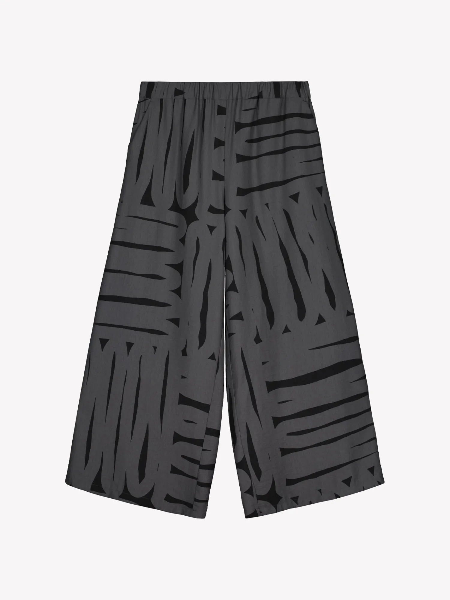 Naisten kuosilliset harmaat Kaiku-housut. Housut sopivat täydellisesti yhteen samanvärisen Kaiku-puseron kanssa. Housuissa on leveät lahkeet, sivuissa taskut ja joustava vyötärö. Housut ovat 7/8 pituiset ja lahkeen sisäpituus koossa 38 on noin 67 cm. Materiaali on laadukasta ja miellyttävän tuntuista, kevyttä twill-sidoksista viskoosi-polyamidikangasta.