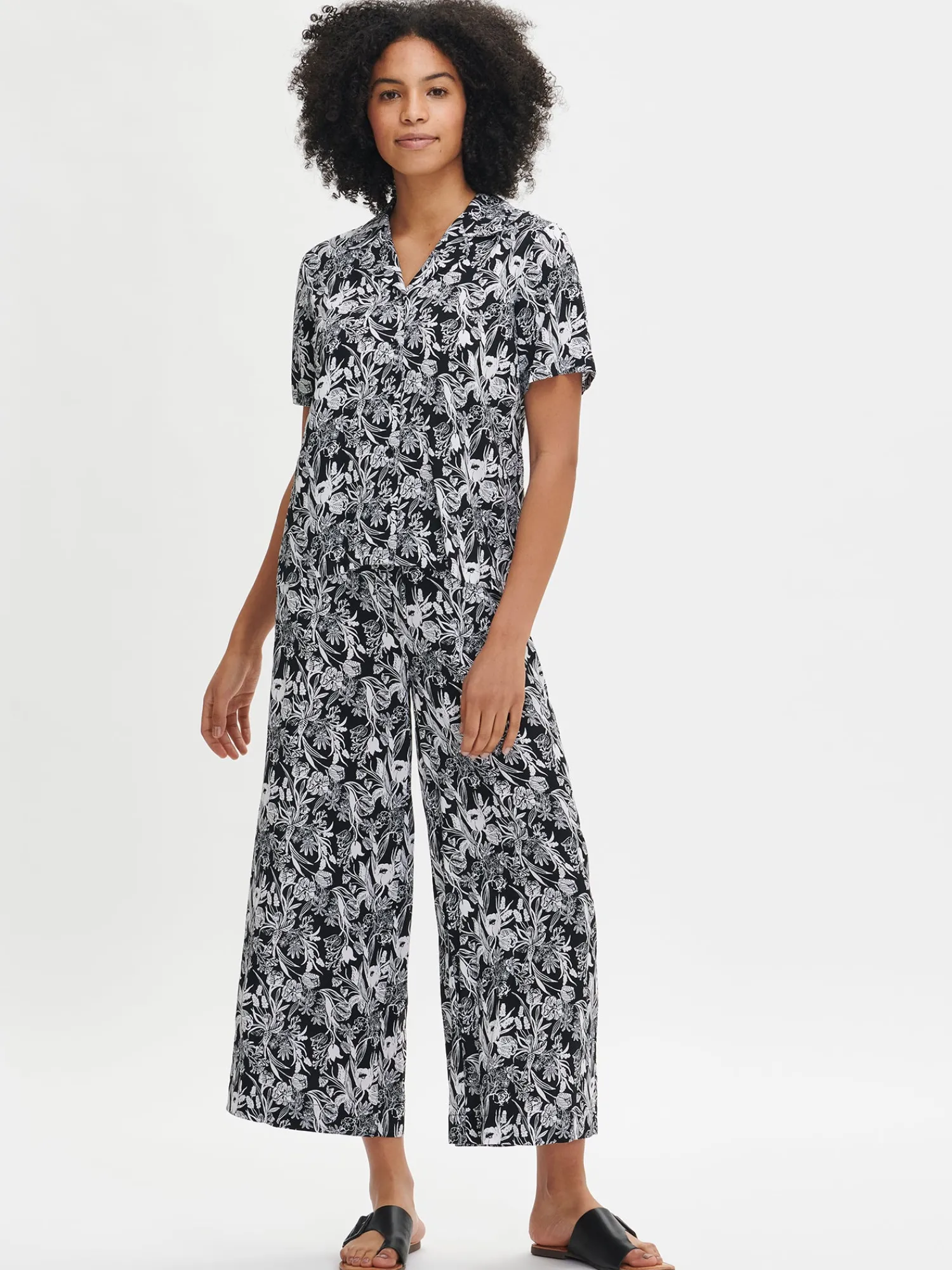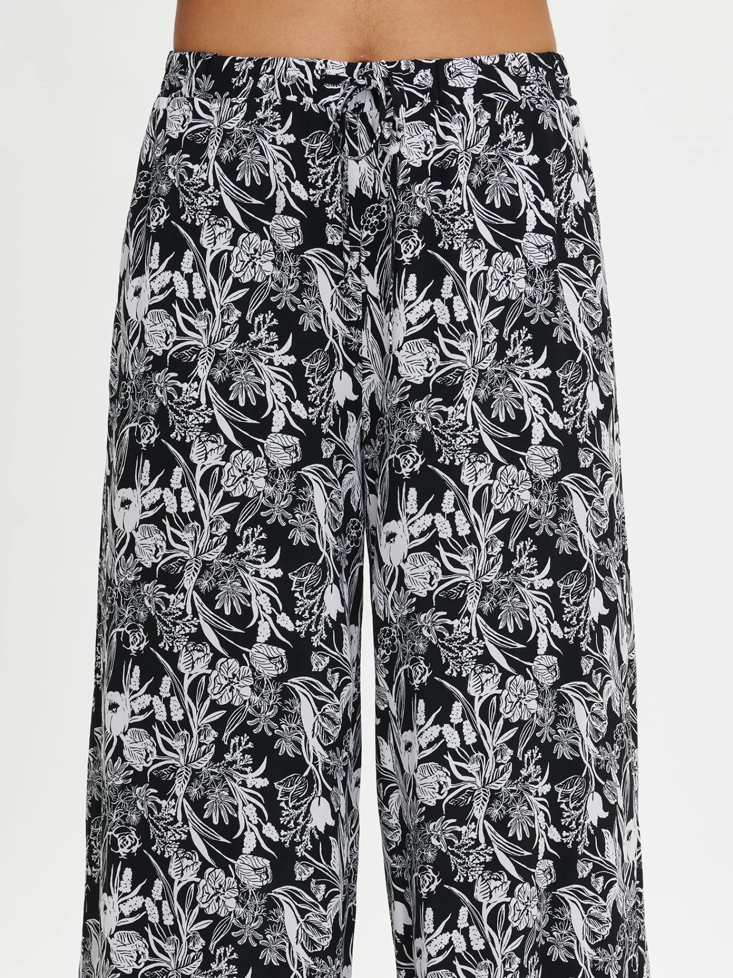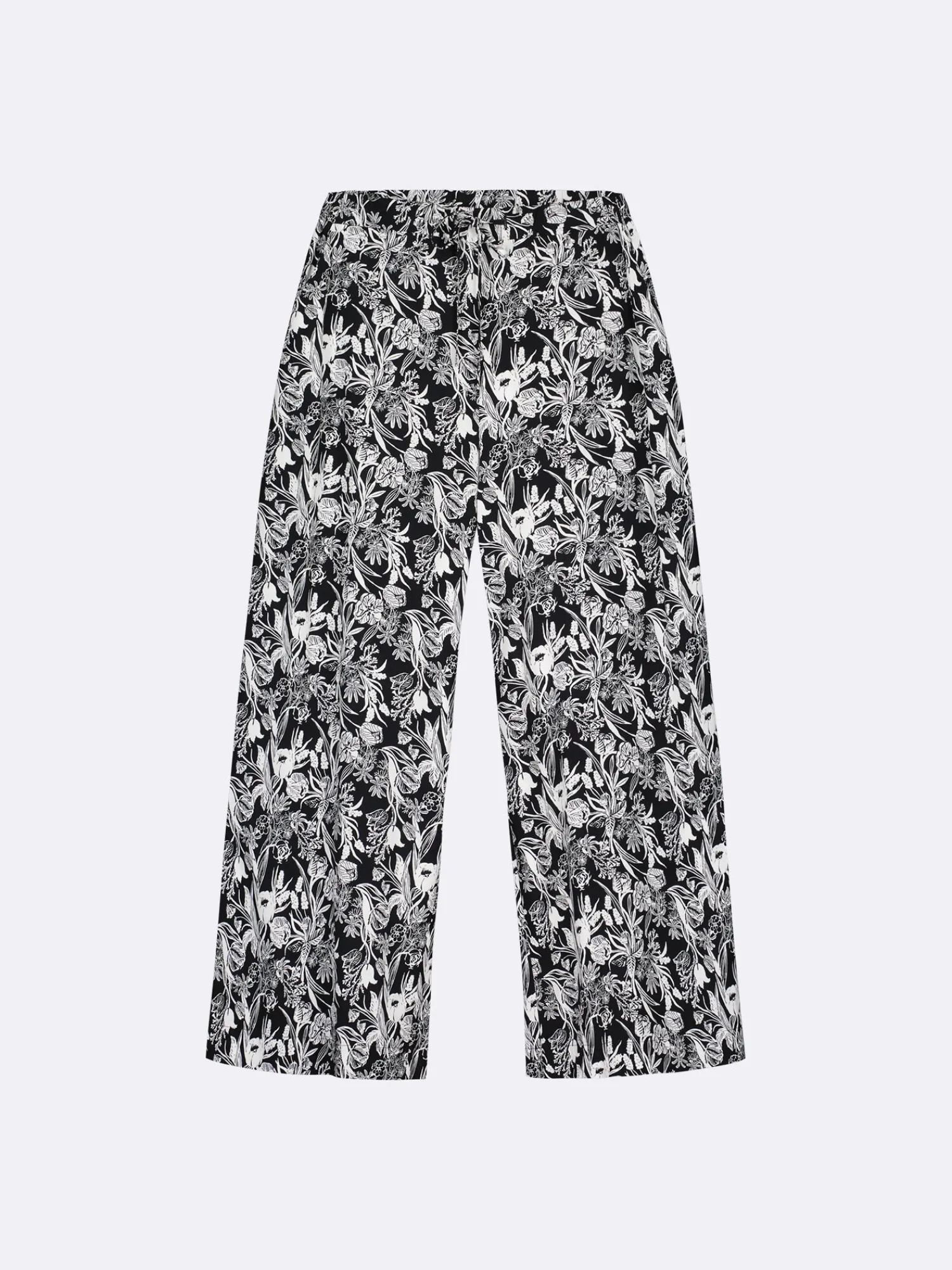 Naisten mustavalkoiset kukkakuvioiset Pieni Floristi-housut sivutaskuilla. Vyötäröllä on mukava kuminauharakenne. Rennot, leveälahkeiset housut ovat tyylikkäästi 7/8-pituiset. Housujen lahkeen sisäpituus koossa 38 on noin 67 cm. Materiaali on kauniisti laskeutuvaa 100 % viskoosikangasta. Materiaalille on ominaista 3-5 % kutistuminen ensimmäisessä pesussa.