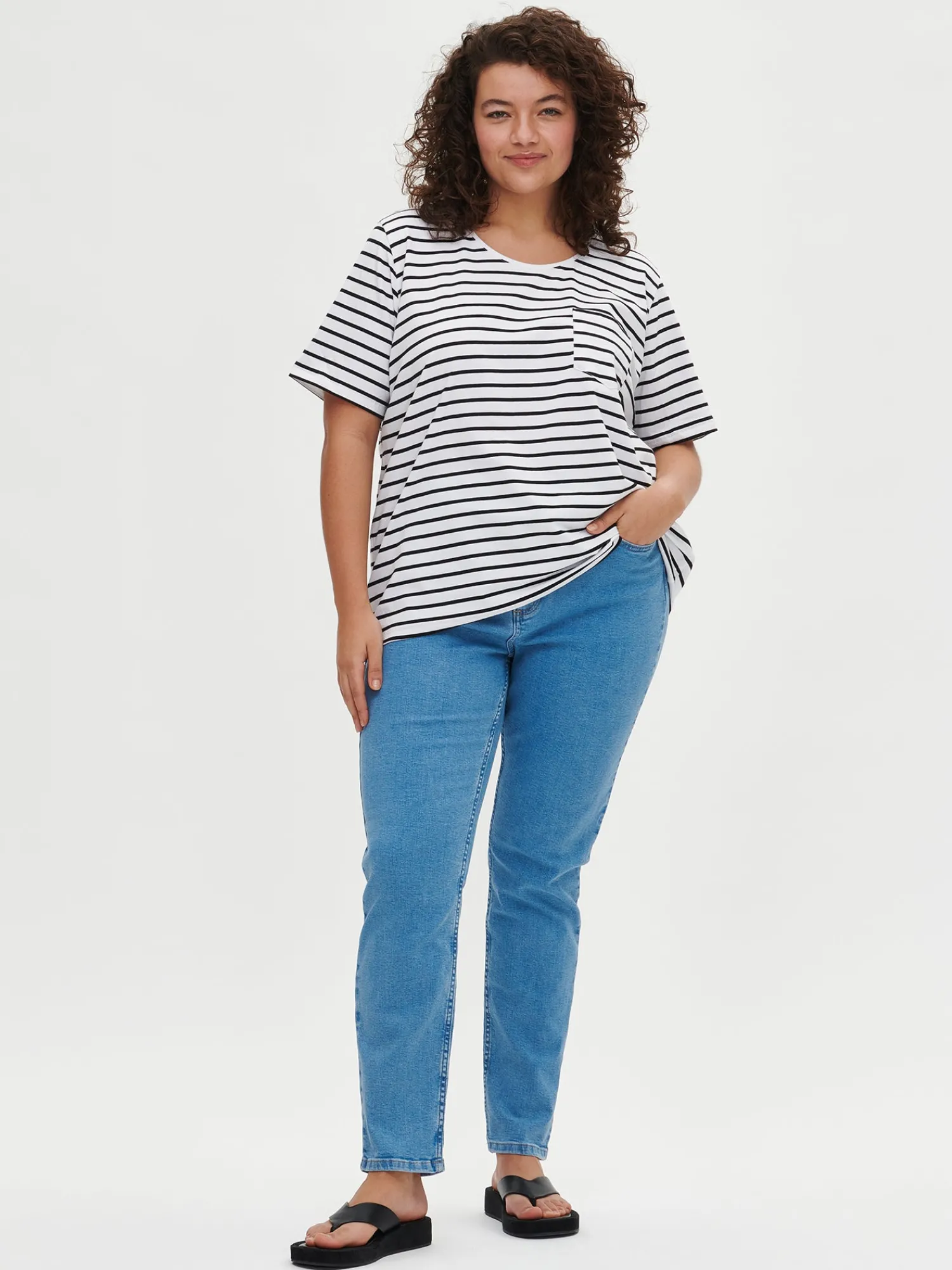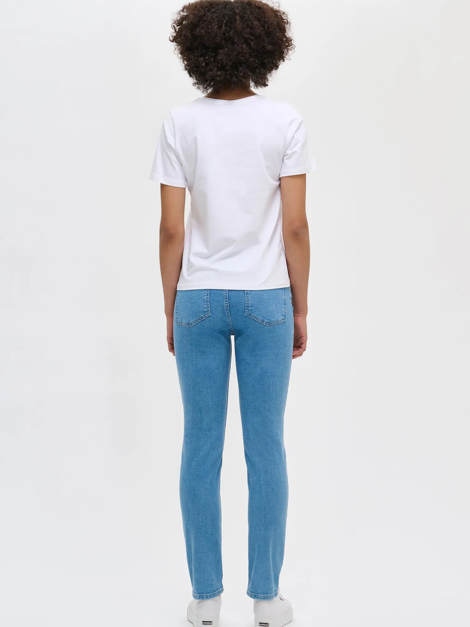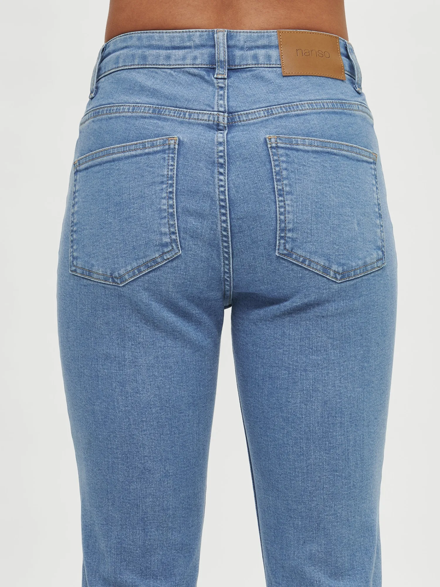 Naisten istuvat vaaleansiniset Pilli-farkut, joissa on normaalikorkuinen vyötärö. Tyylikkäät ja mukavat farkut eivät koskaan poistu muodista ja hyvin istuviin farkkuihin haluaa pukeutua aina. Ajattomat Pilli-farkut ovat todellinen vaatekaapin luottovaate. Farkuissa on vyötärökaitale, edessä vetoketju ja nappikiinnitys. Kapeissa farkuissa on taskut edessä sekä takana ja täyspitkät lahkeet. Farkkujen lahkeen sisäpituus koossa 38 on noin 78 cm. Materiaali on kudottua twillsidoksista puuvilla-denimkangasta, johon elastaani tuo joustavuutta ja mukavuutta. 20% kankaaseen käytetystä puuvillasta on kierrätettyä.