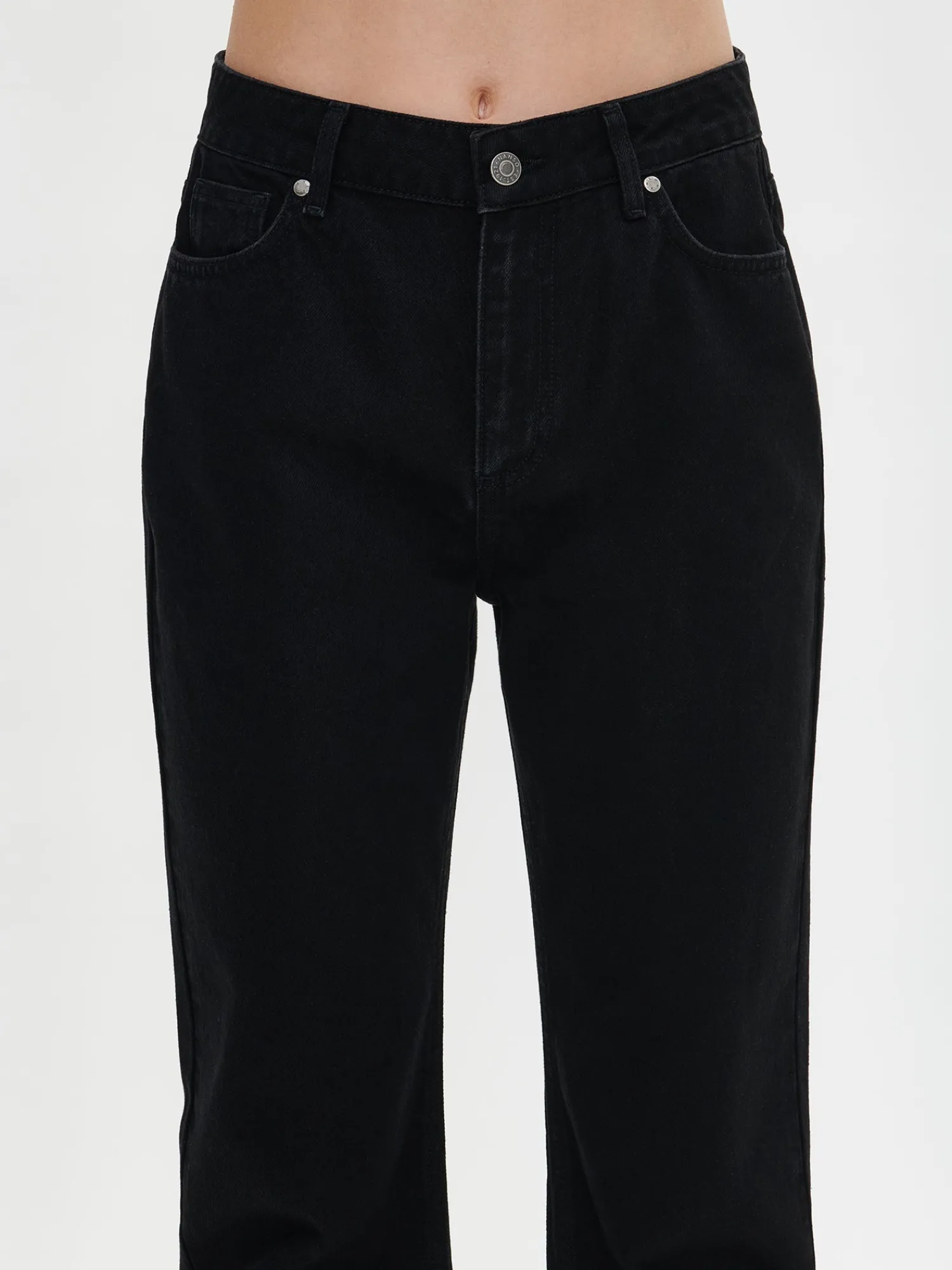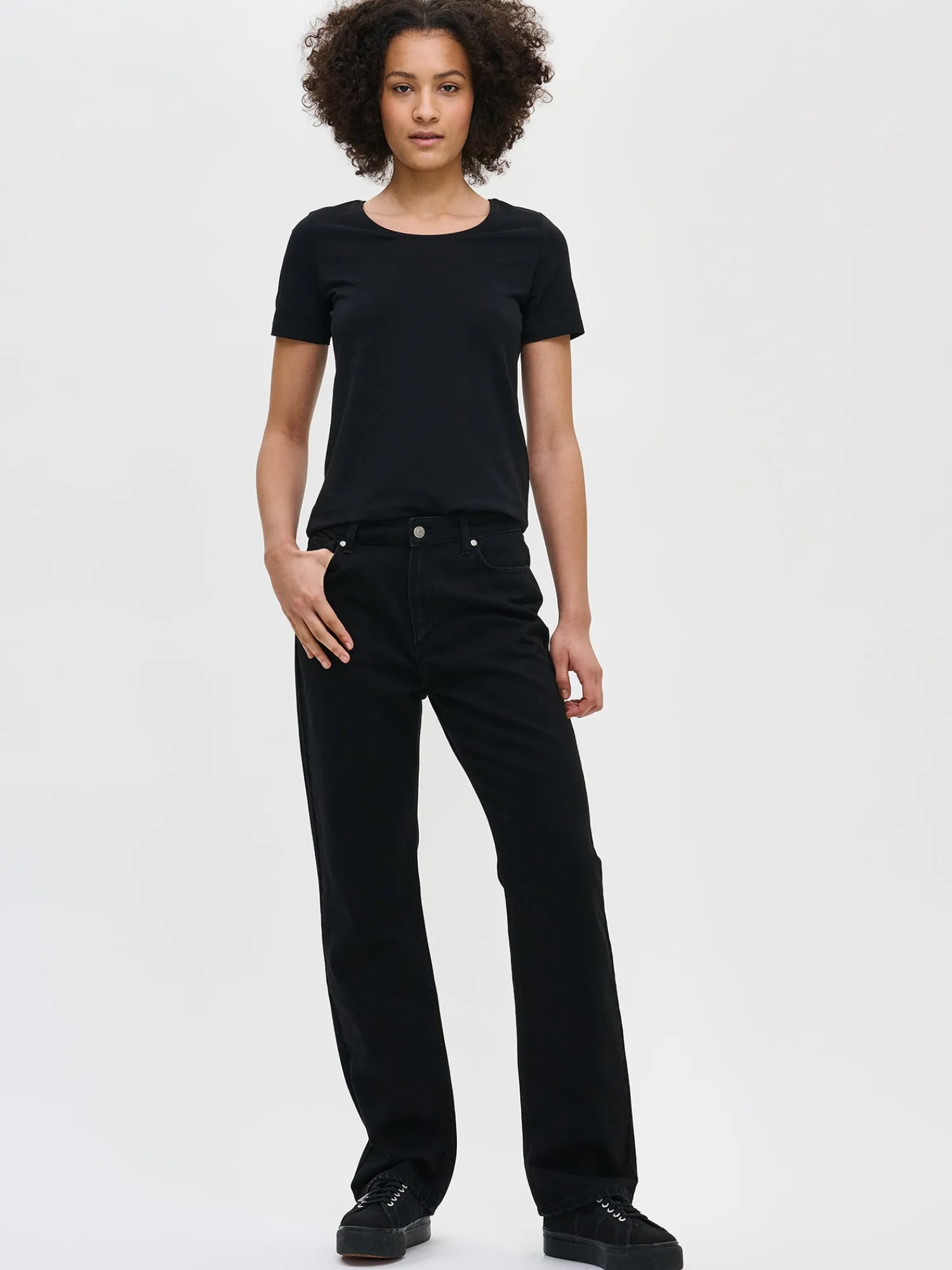 Naisten rennot mustat Suora-farkut, joissa on normaalikorkuinen vyötärö. Klassiset ja mukavat suorat farkut ovat monen asukokonaisuuden runko. Hyvin istuvat farkut ovat vaatekaapin luottovaate, johon on aina ihanaa pukeutua. Suora-farkuissa on vyötärökaitale, edessä vetoketju ja nappikiinnitys. Farkuissa on taskut edessä sekä takana ja täyspitkät suorat lahkeet. Farkkujen lahkeen sisäpituus koossa 38 on noin 80 cm. Materiaali on kudottua twillsidoksista puuvilla-denimkangasta. 20% kankaaseen käytetystä puuvillasta on kierrätettyä.