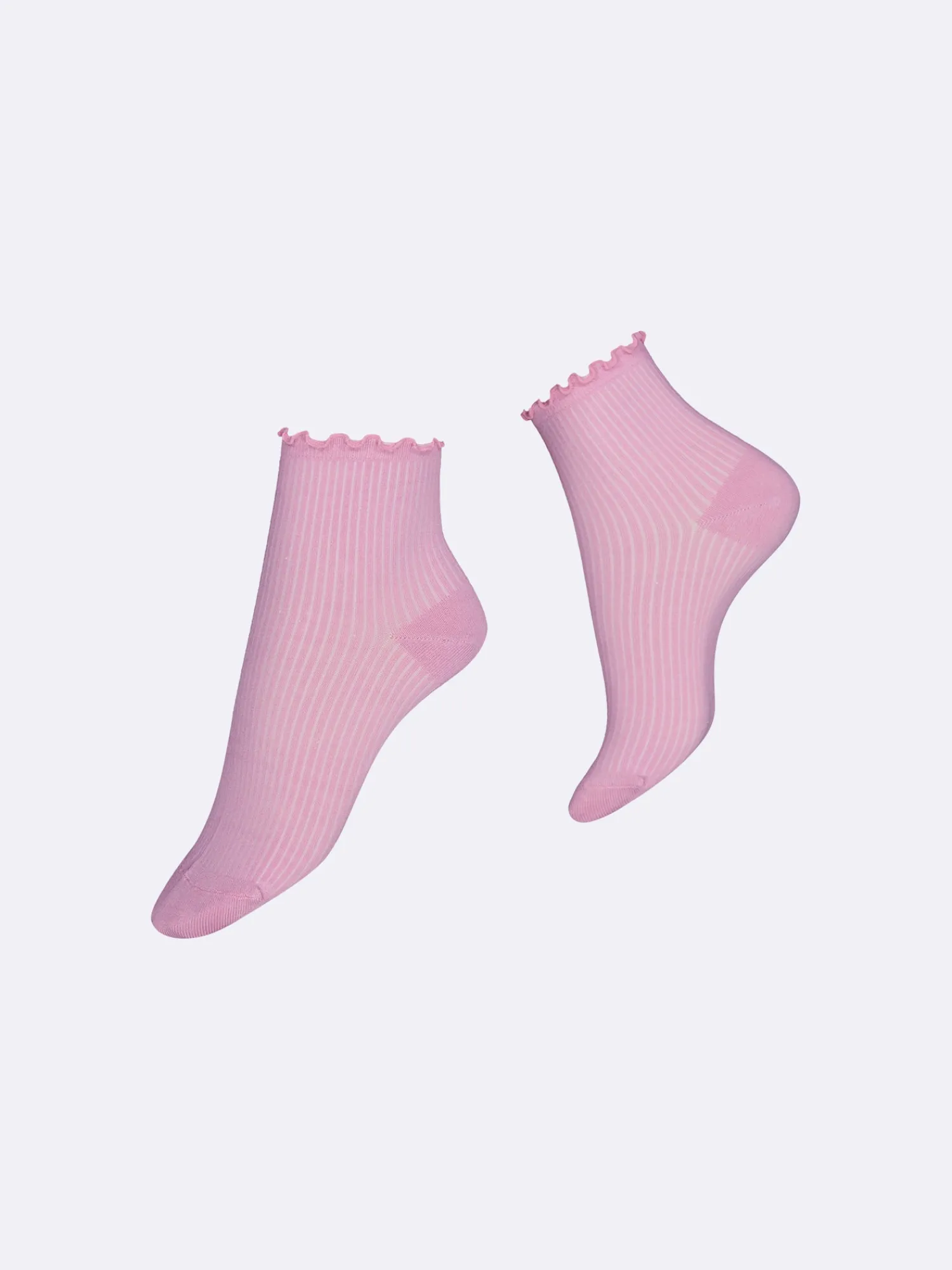 Voguen ihanat pinkit nilkkasukat trendikkäällä frillareunalla. Lyhytvartiset sukat ovat pehmeää bambuviskoosisekoitetta. Sukat ovat täydelliset yhdistettäväksi tennareiden kanssa.
