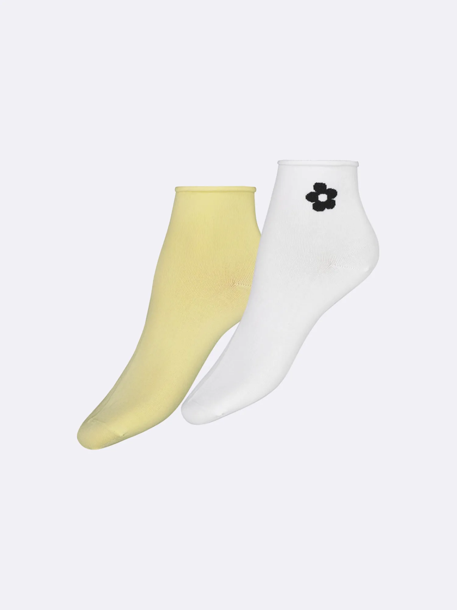 Voguen korkealaatuiset lyhytvartiset nilkkasukat luomupuuvillasta. Kahden parin pakkauksessa toisessa parissa on kaunis kukkakuvio nilkalla ja toinen pari on yksivärinen.