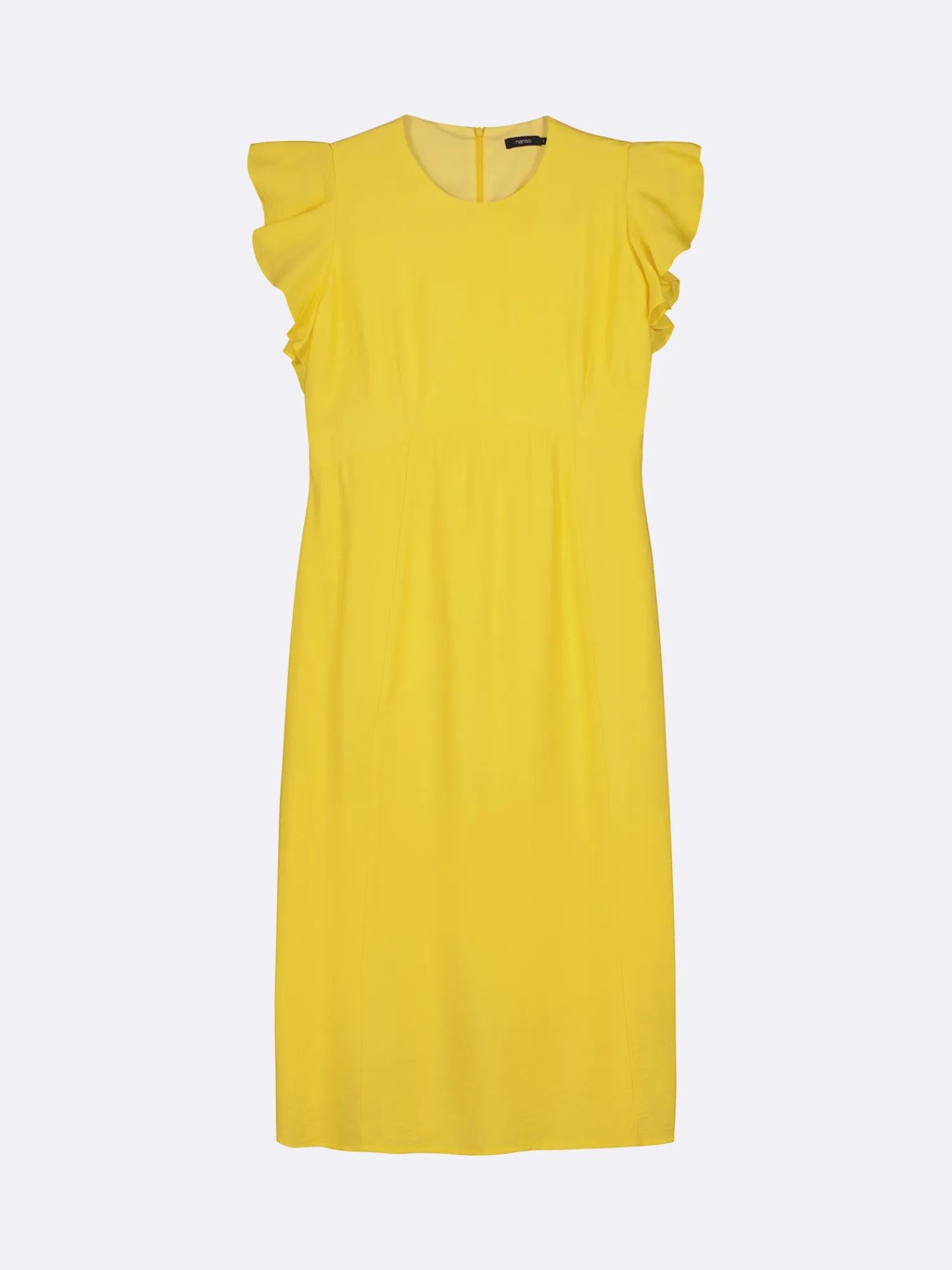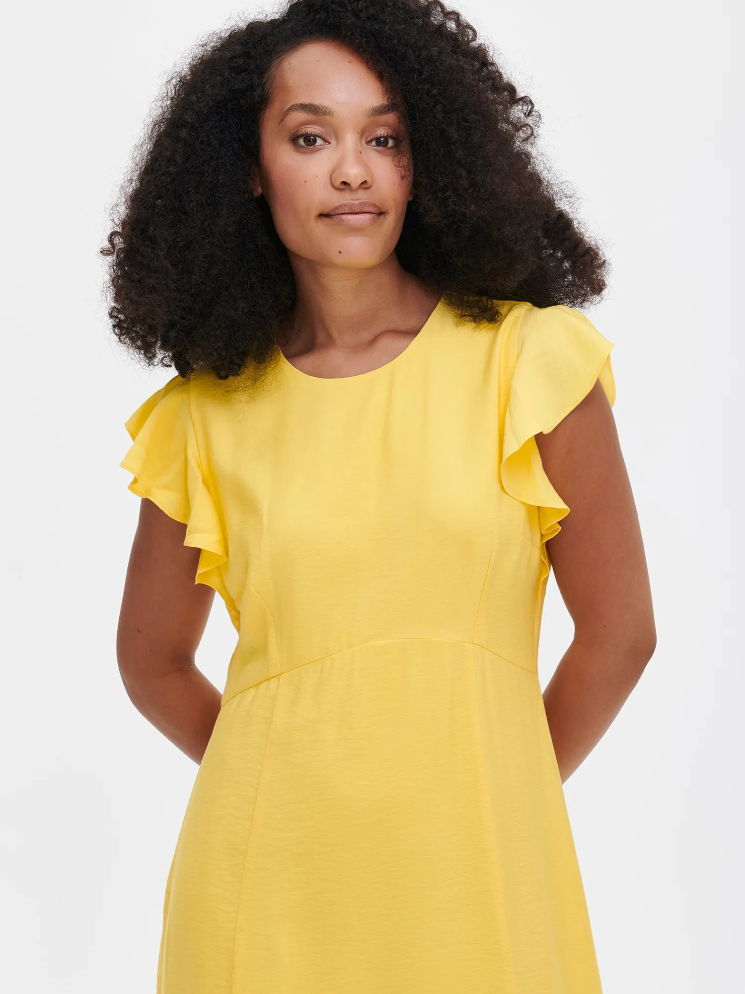 Naisten yksivärinen keltainen Antonia-mekko. Mekossa on pyöreä pääntie, takana piilovetoketju, vuori ja kauniit frillat kädenteillä. Mekko on yläosasta istuva ja helma kauniisti kellottuva. Mekon pituus koossa 38 on noin 115 cm. Materiaali on kauniisti laskeutuvaa ja kevyttä viskoosi-polyamidi sekoitekangasta. Materiaalin viskoosi LENZING™ ECOVERO™ -viskoosia. Materiaalille on ominaista 3-5% kutistuminen ensimmäisessä pesussa.