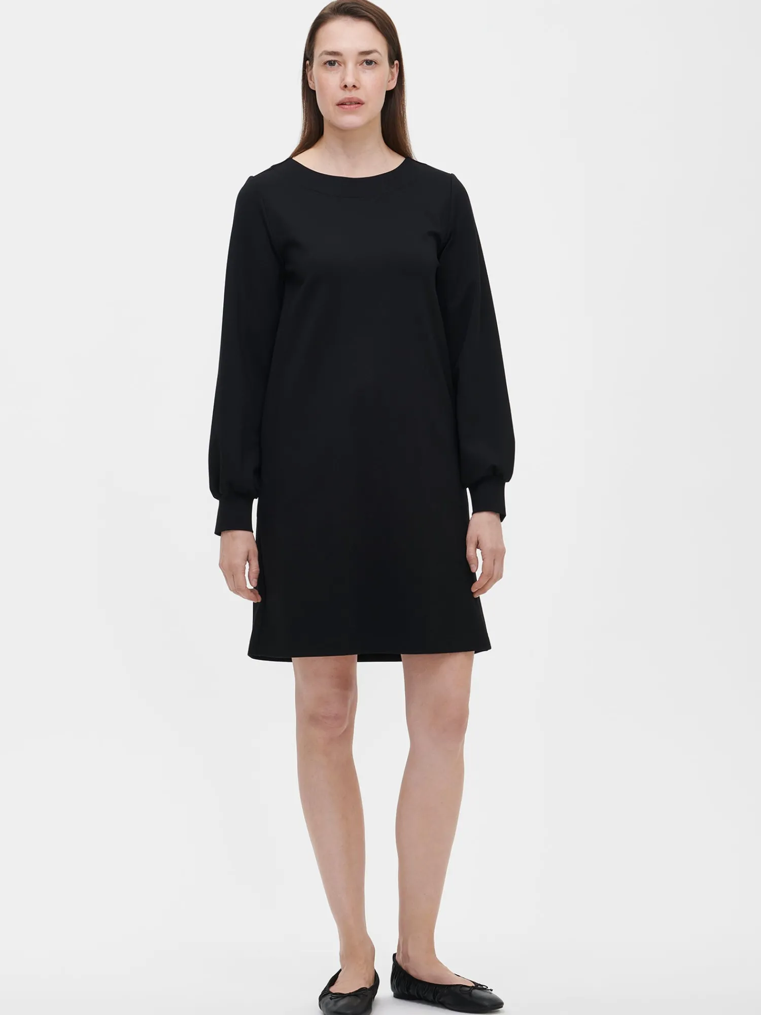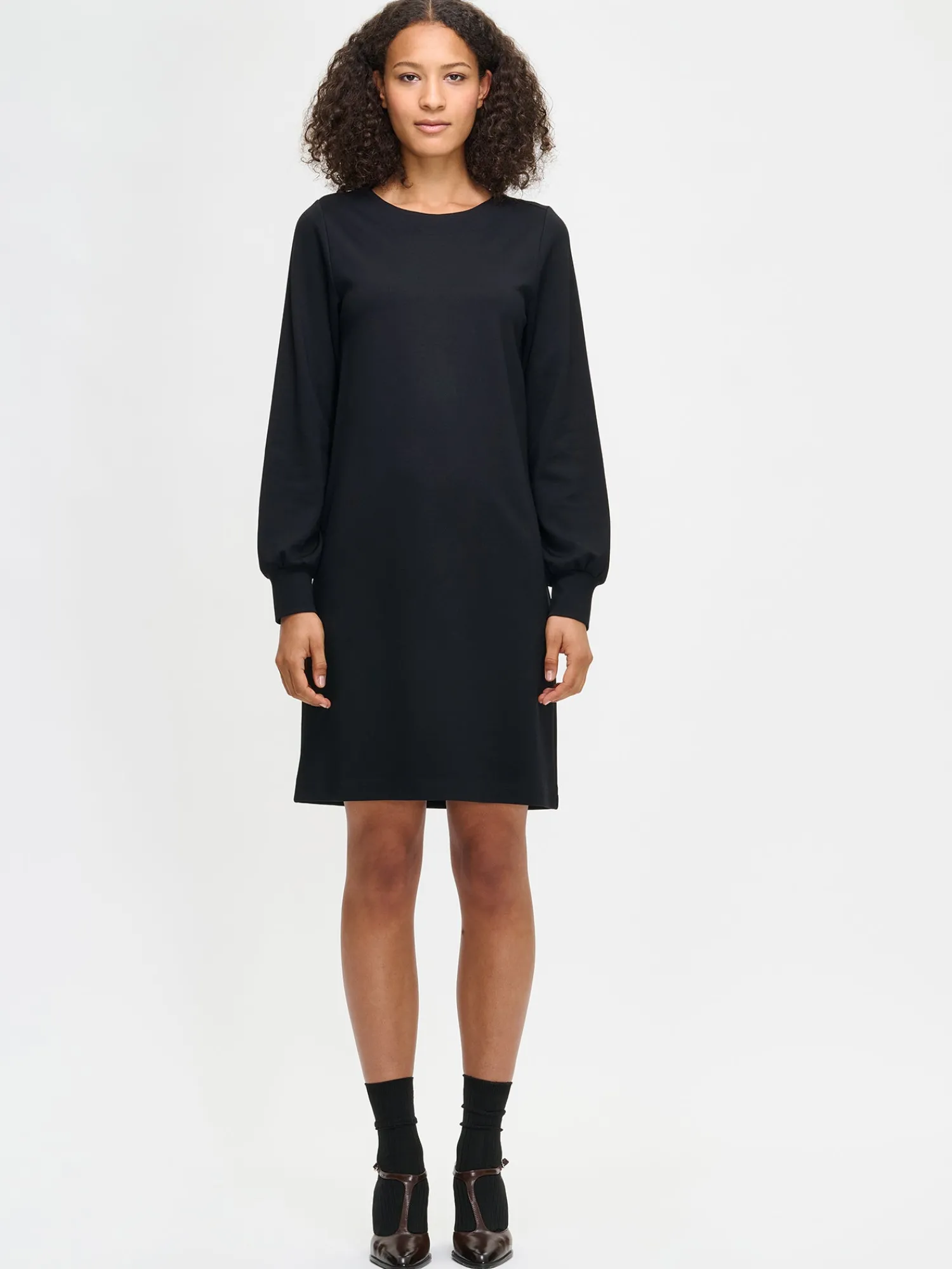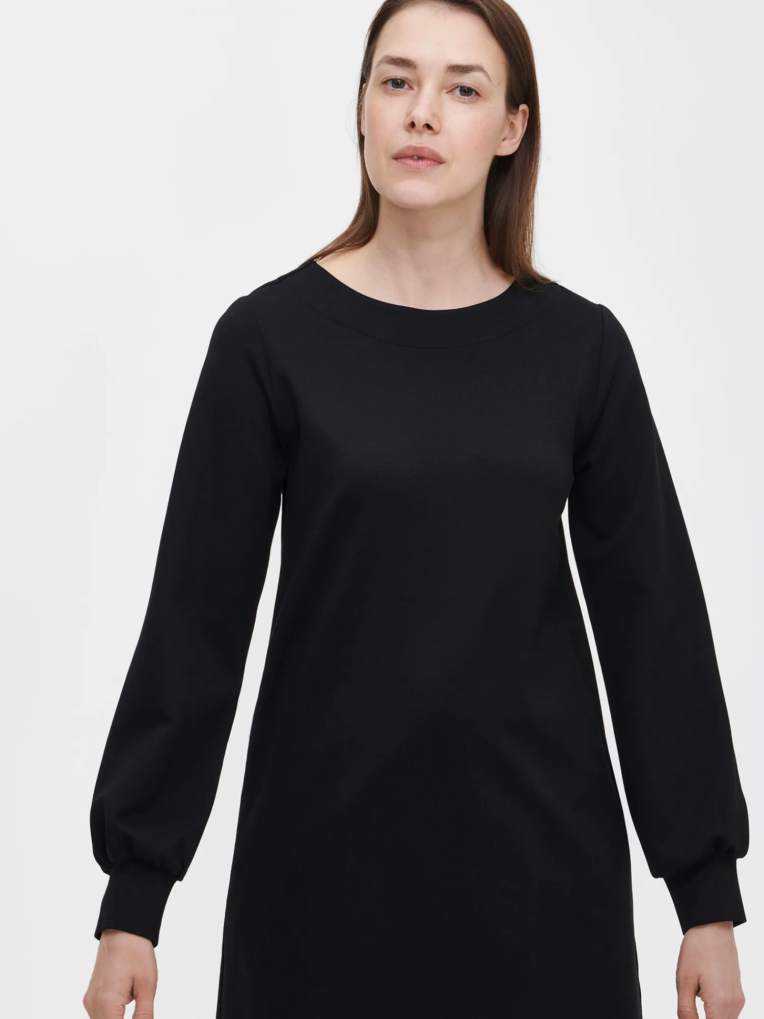 Naisten tyylikäs musta Arkki-mekko. Mekossa on ovaali pääntie, joka on huoliteltu alavaralla. A-linjaisessa mekossa on sivutaskut ja suora helma. Täyspitkät hihat poimuttuvat kauniisti hihansuun leveän kaksinkertaisen kaitaleen yläpuolelle. Mekon pituus koossa 38 on noin 95 cm. Materiaali on laadukasta ja miellyttävän tuntuista viskoosi-polyamidi-elastaani-neulosta. Viskoosineulos on sähköistymätöntä ja helppohoitoista. Materiaalille on ominaista 3-5 % kutistuminen ensimmäisessä pesussa.