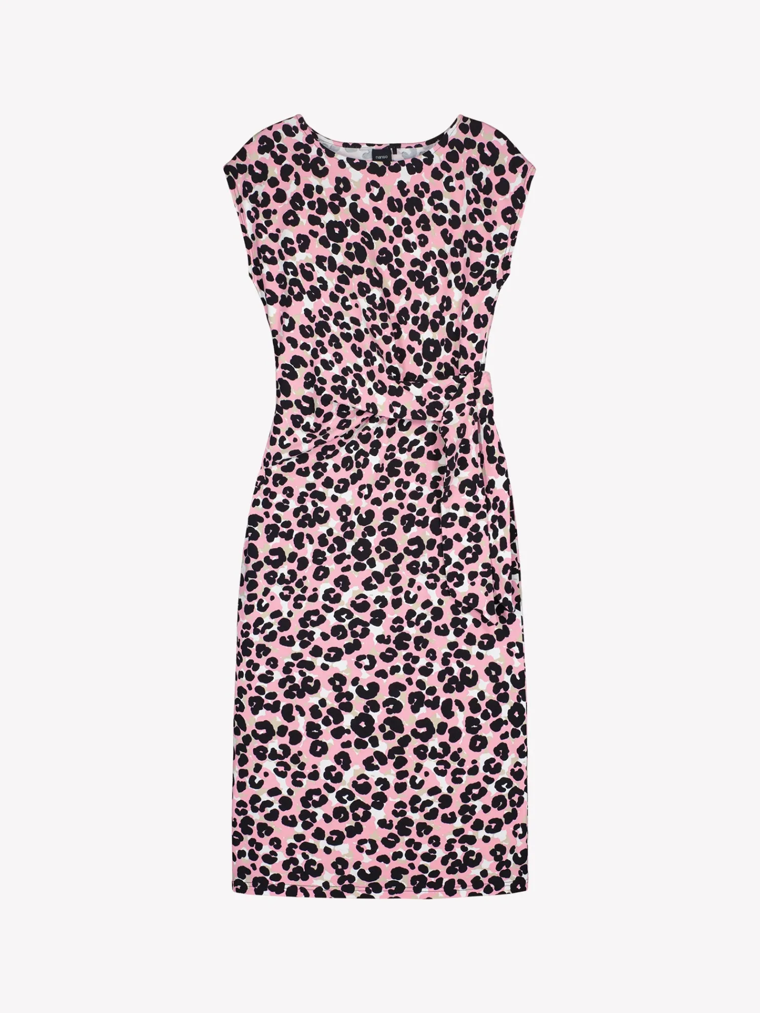 Naisten vaaleanpunainen Babette-mekko leopardikuviolla. Mekossa on kantilla viimeistelty venepääntie ja holkkihihat. Suoralinjaisessa mekossa on kauniina yksityiskohtana vyötärölle muotoa tuova nauhoilla solmittava solmuke. Mekon pituus koossa M on noin 120 cm. Materiaali on laadukasta ja helppohoitoista puuvilla-elastaani-neulosta, joka pysyy hyvänä pesusta toiseen.