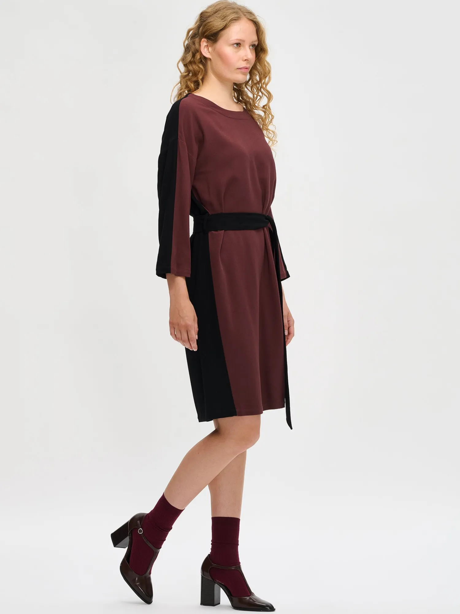 Naisten tummanruskea-musta Fiine-mekko. Mekossa on hieman laskettu olkalinja ja suorat väljät hiha, jotka ovat pituudeltaan 3/4 mittaiset. Mekko on kaksivärinen ja vyötäröllä on vyö, jonka saa solmittua kauniille rusetille. Mekon pituus koossa 38 on noin 102 cm. Materiaali on kauniisti laskeutuvaa 100 % viskoosikreppikangasta. Materiaalille on ominaista 3-5 % kutistuminen ensimmäisessä pesussa.