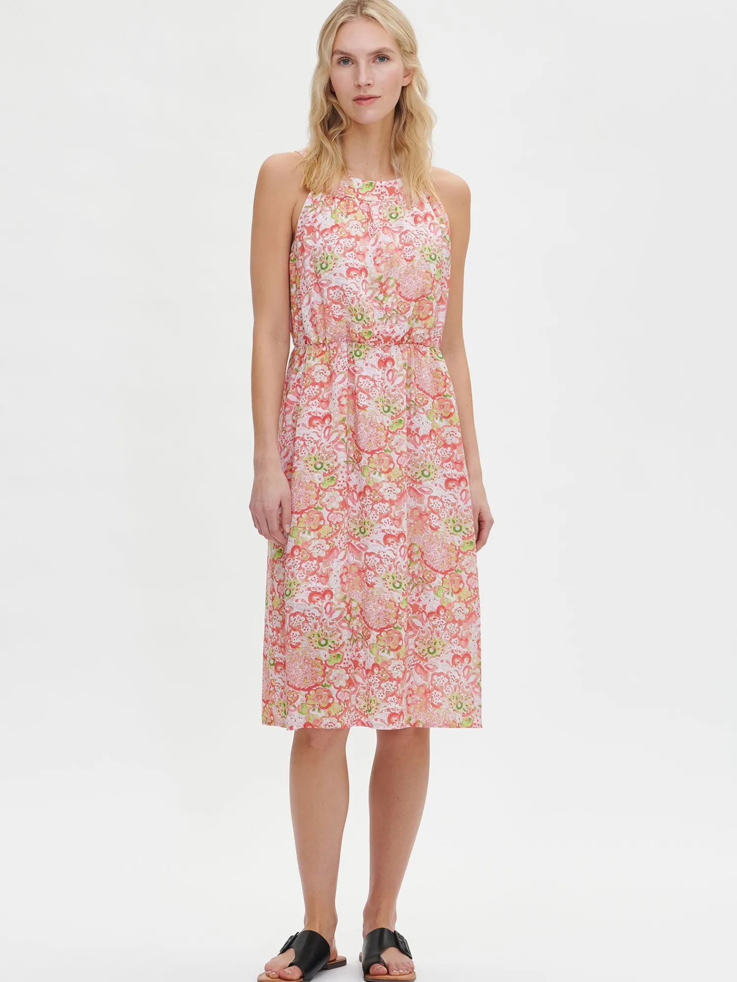Naisten ihastuttava monivärinen Kreeta-mekko. Kauniissa mekossa on pyöreä pääntie, jonka edessä on poimutusta ja takana rusettihalkio. Hihattoman mekon vyötäröllä on kuminauha ja sivuissa on taskut. Mekon helma kellottuu kauniisti. Mekko on vuoritettu yläosasta polven korkeudelle. Mekon pituus koossa 38 on noin 110 cm. Materiaali on kevyttä ja läpikuultavaa miellyttävän tuntuista LYOCELL TENCEL™ -kangasta. Materiaalille on ominaista 3-5% kutistuminen ensimmäisessä pesussa.