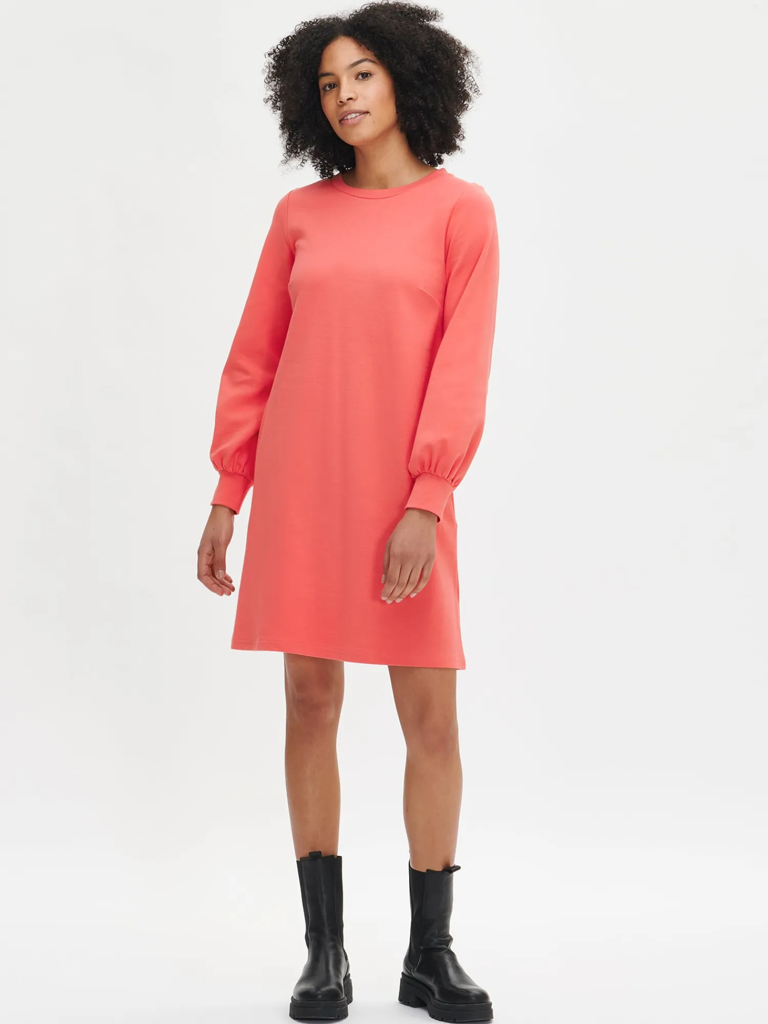 Naisten rento pitkähihainen punainen Leija-mekko. A-linjaisessa mekossa on pyöreä pääntie, sivuissa taskut ja kauniisti hihansuihin poimuttuvat täyspitkät hihat. Mekon pituus koossa M on noin 95 cm. Materiaali on miellyttävän tuntuista, paksumpaa interlock-neulosta.