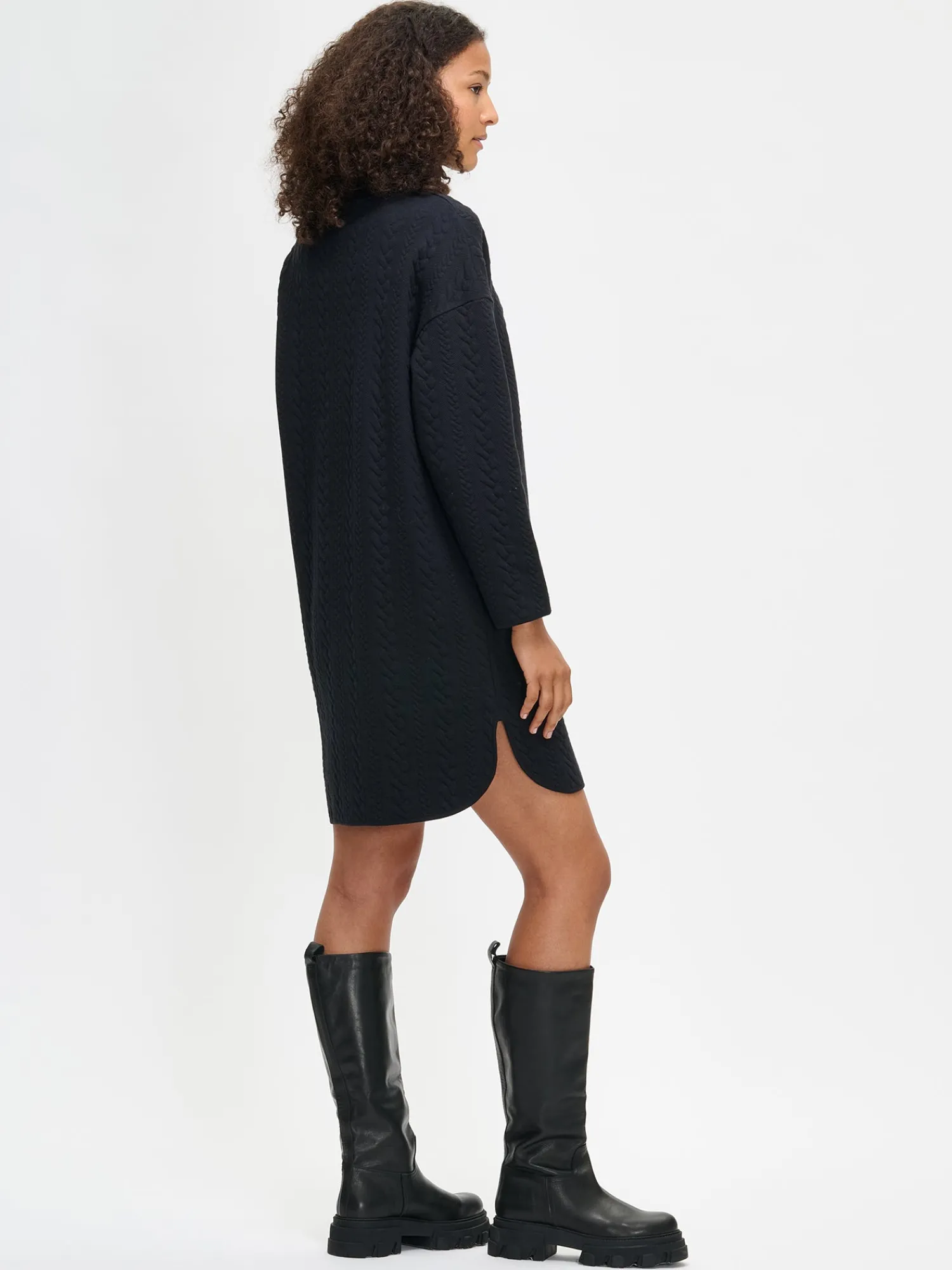 Naisten mukava musta Letti-mekko poolokauluksella. Mekossa on pudotettu olkalinja, täyspitkät hihat ja sivutaskut. Helmassa on pyöristetyt halkiot. Mekon pituus koossa M on noin 97 cm. Ryhdikäs palmikkomaisesti pintakuvioitu materiaali on miellyttävää puuvilla-elastaanineulosta. Materiaalille on ominaista 3-5% kutistuminen ensimmäisessä pesussa.