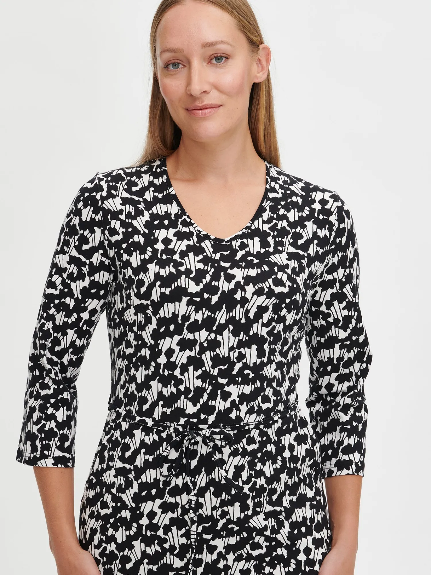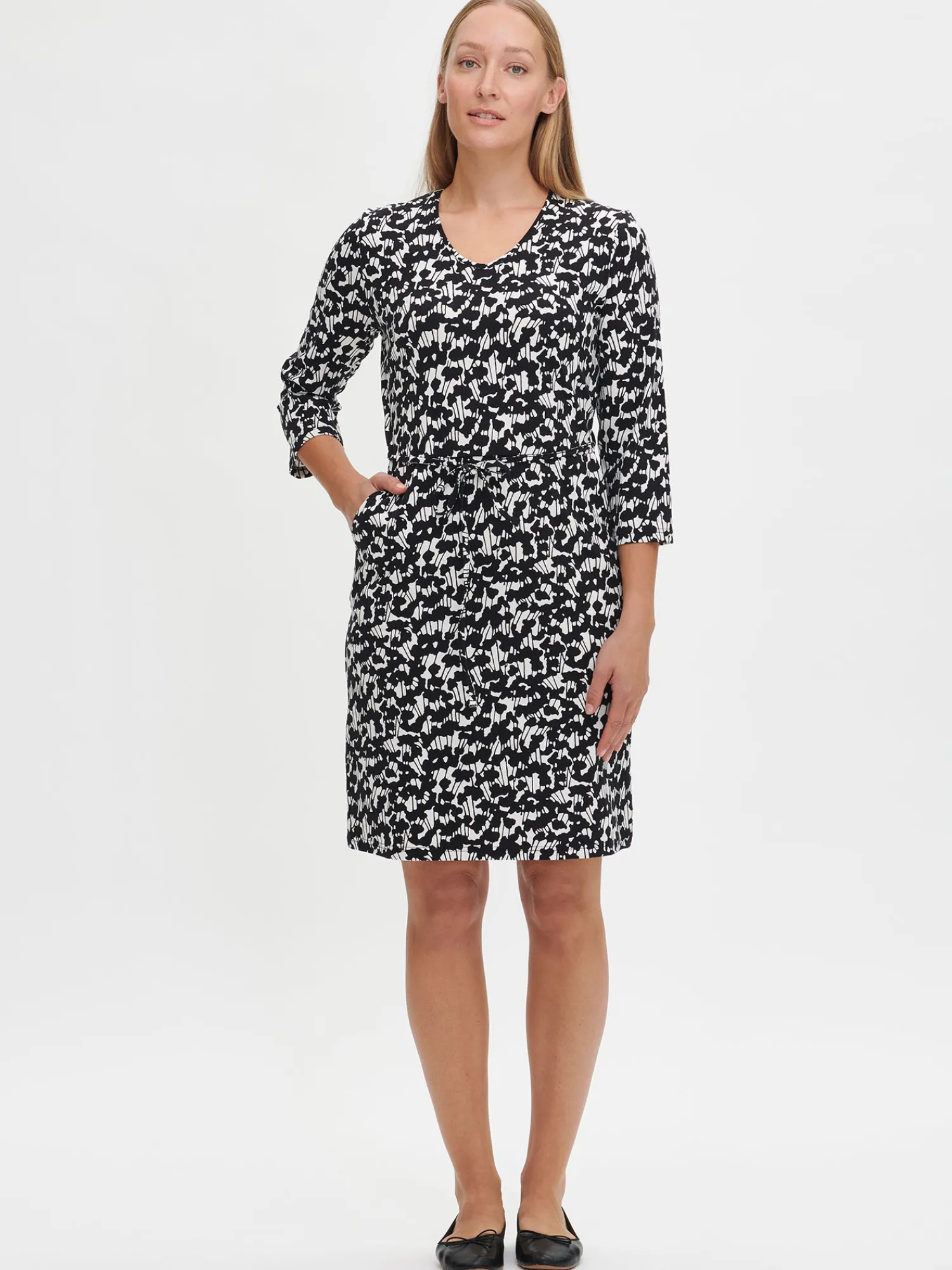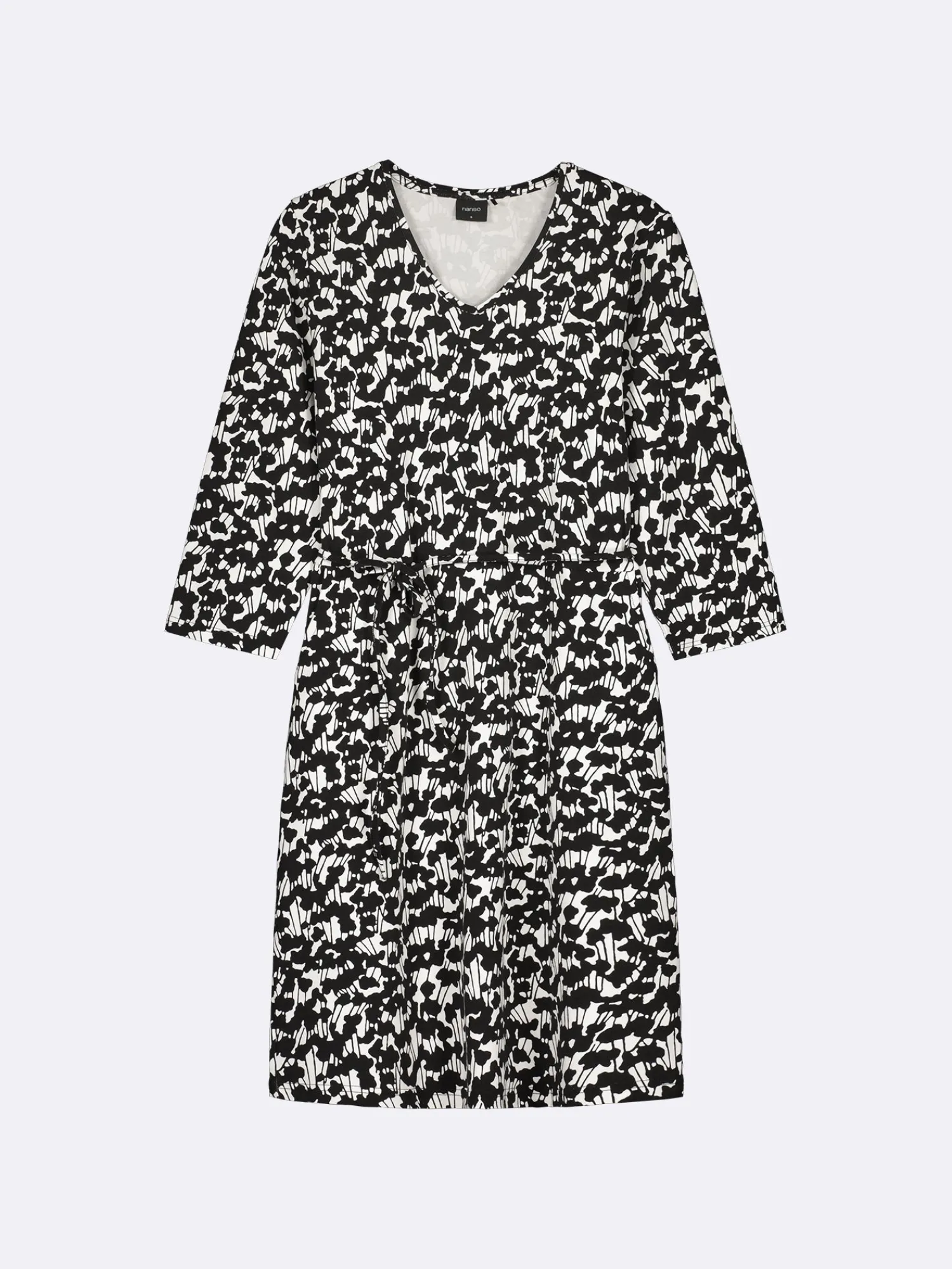 Naisten rento, kuosillinen mustavalkoinen Liito-mekko. Monikäyttöisessä mekossa on tereellä viimeistelty V-pääntie ja 3/4-pituiset hihat. Vyötäröllä on poikkisauma, sivuissa taskut ja mekon vyötäröllä on kapea irrotettava vyö. Mekon pituus koossa M on noin 100cm. Materiaali on miellyttävän tuntuista ja helppohoitoista puuvilla-elastaani-neulosta.