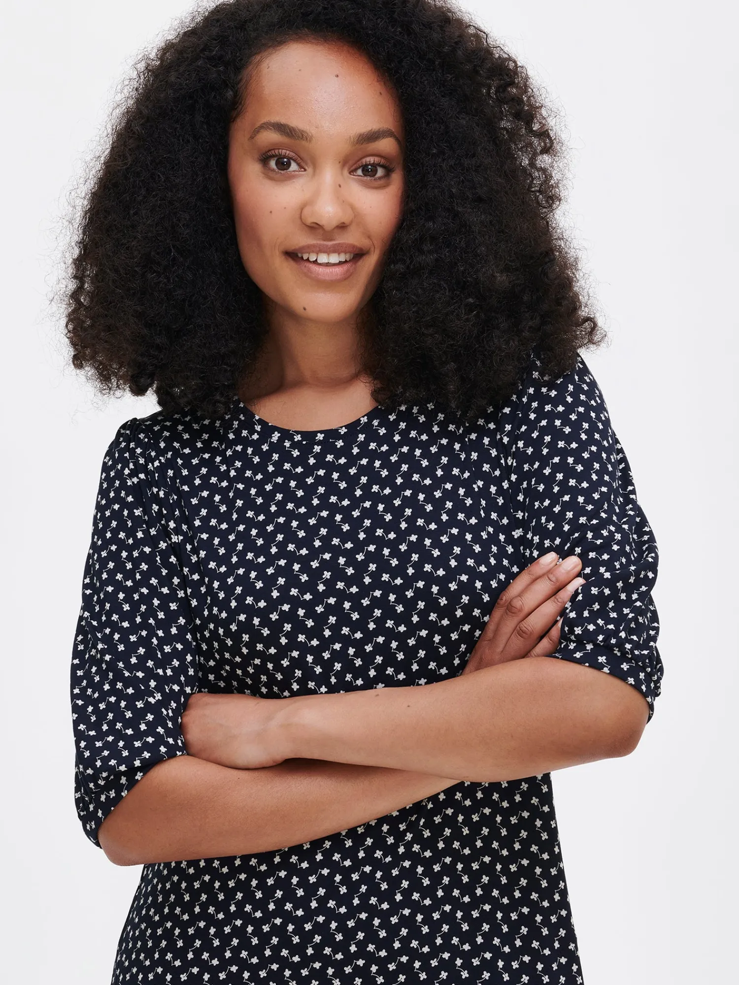 Naisten kuosillinen tummansininen lyhyt Liliana-mekko. Mekossa on tereellä viimeistelty pyöreä pääntie, sivutaskut ja kevyesti kellottuva helma. 2/4 pituiset hihat poimuttuvat olalta sekä hihansuun kaitaleen yläpuolelta. Mekon pituus koossa M on noin 95 cm. Kauniisti laskeutuvan mekon materiaali on laadukasta ja miellyttävän tuntuista viskoosi-elastaani-neulosta. Viskoosineulos on sähköistymätöntä ja helppohoitoista. Tuote on valmistettu LENZING™ ECOVERO™ -viskoosista. Materiaalille on ominaista 3-5 % kutistuminen ensimmäisessä pesussa.