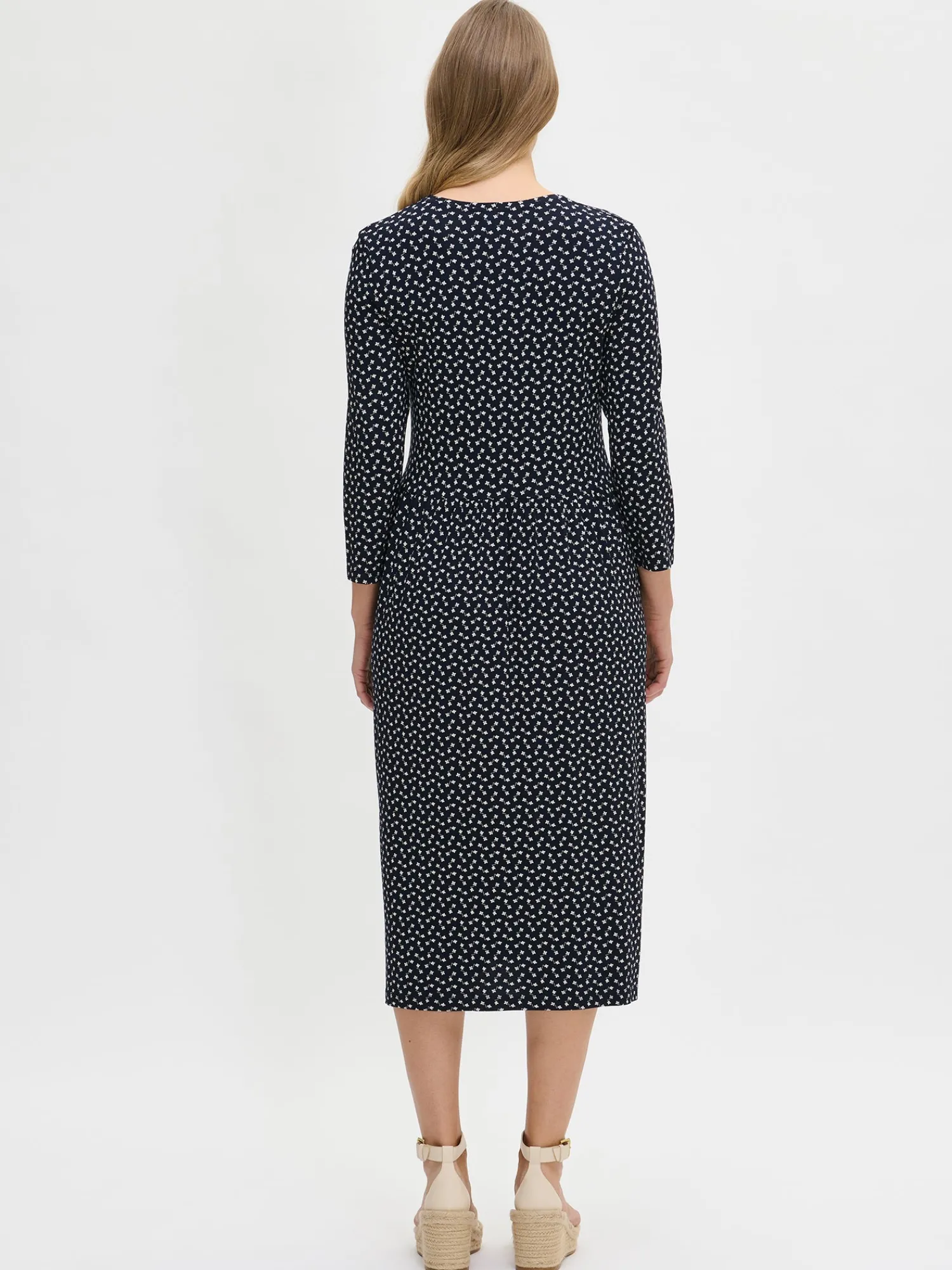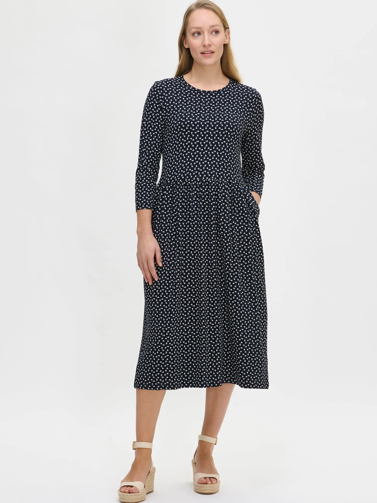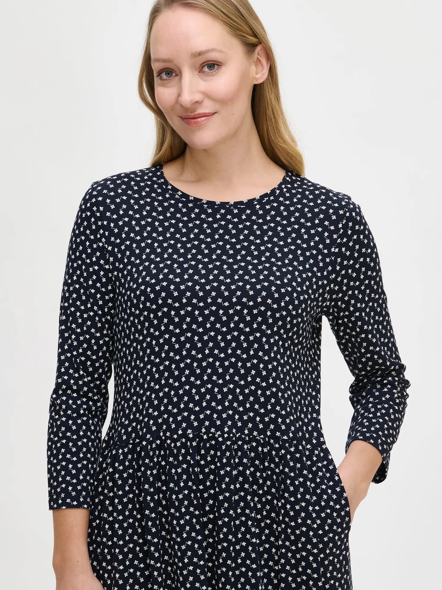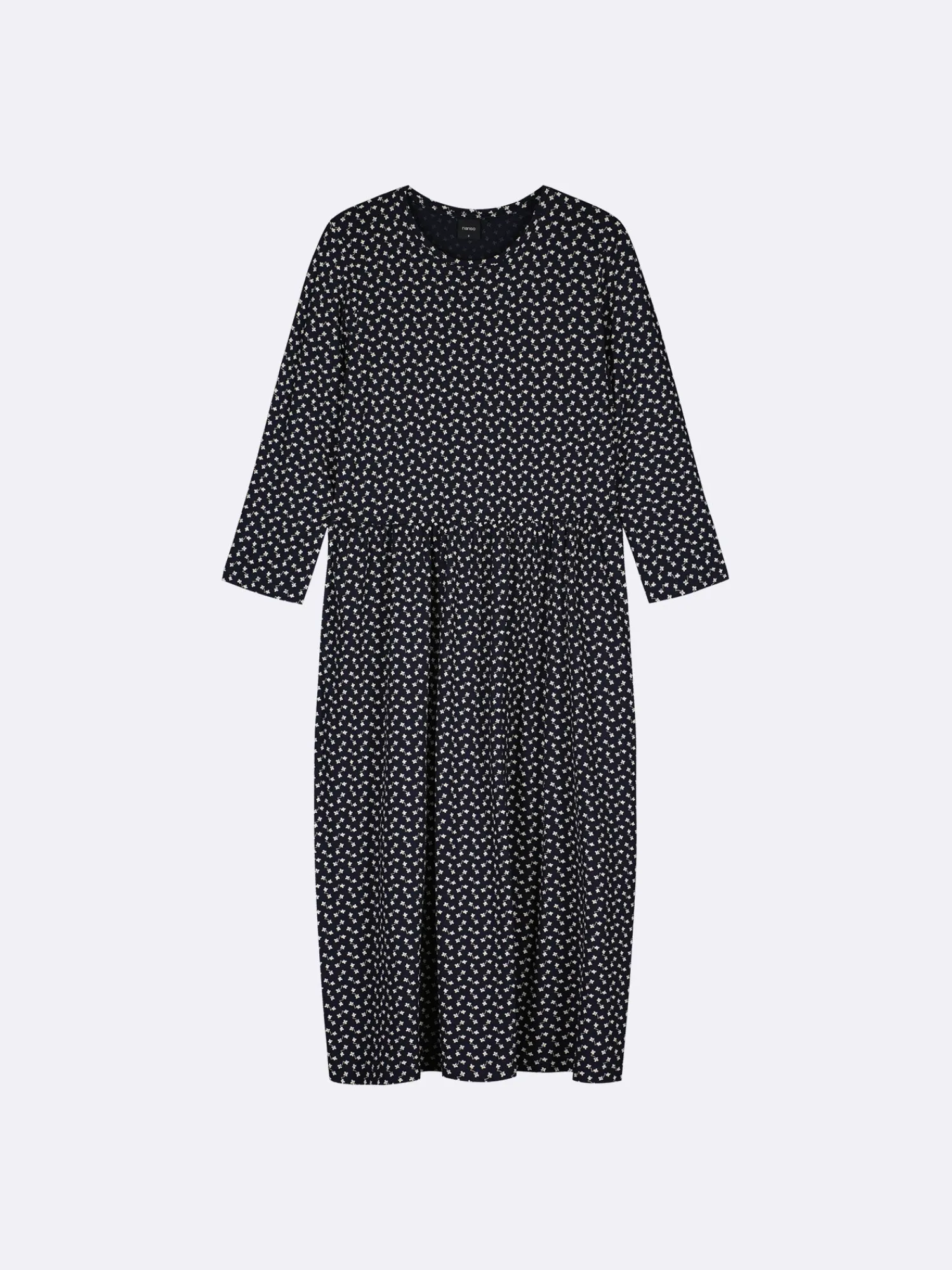 Naisten kuosillinen tummansininen Liliana-mekko. Mekossa on tereellä viimeistelty pyöreä pääntie, 3/4 pituiset hihat ja sivutaskut. Helma poimuttuu vyötärön leikkaussaumaan. Mekon pituus koossa M on noin 115 cm. Kauniisti laskeutuvan mekon materiaali on laadukasta ja miellyttävän tuntuista viskoosi-elastaani-neulosta. Viskoosineulos on sähköistymätöntä ja helppohoitoista. Tuote on valmistettu vastuullisemmasta LENZING™ ECOVERO™ -viskoosista. Materiaalille on ominaista 3-5 % kutistuminen ensimmäisessä pesussa.