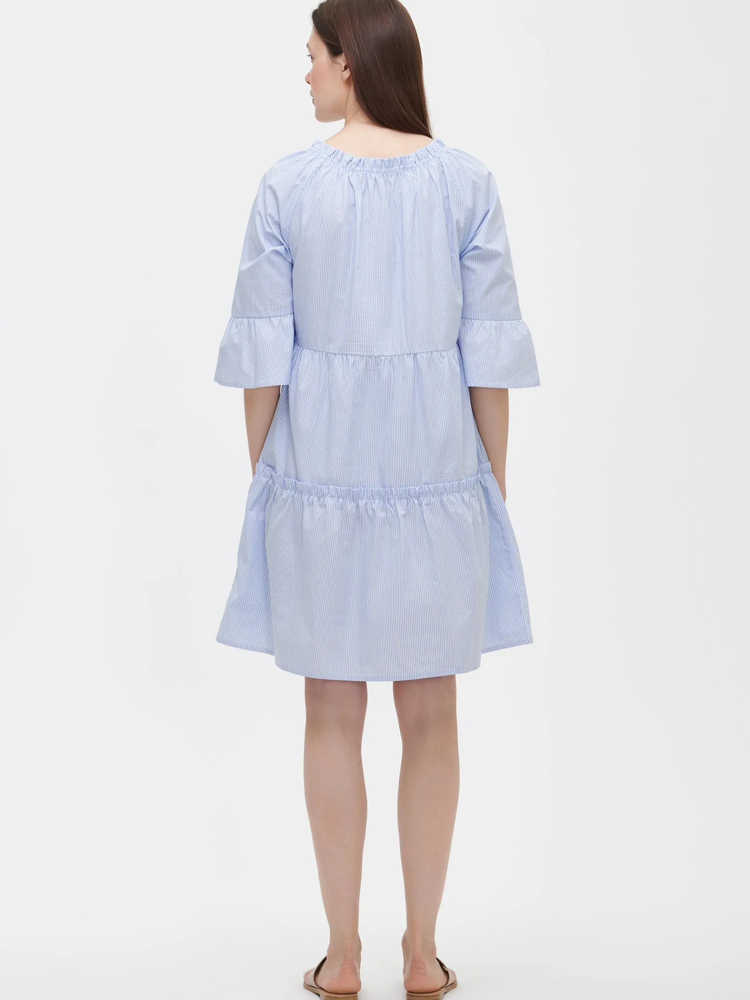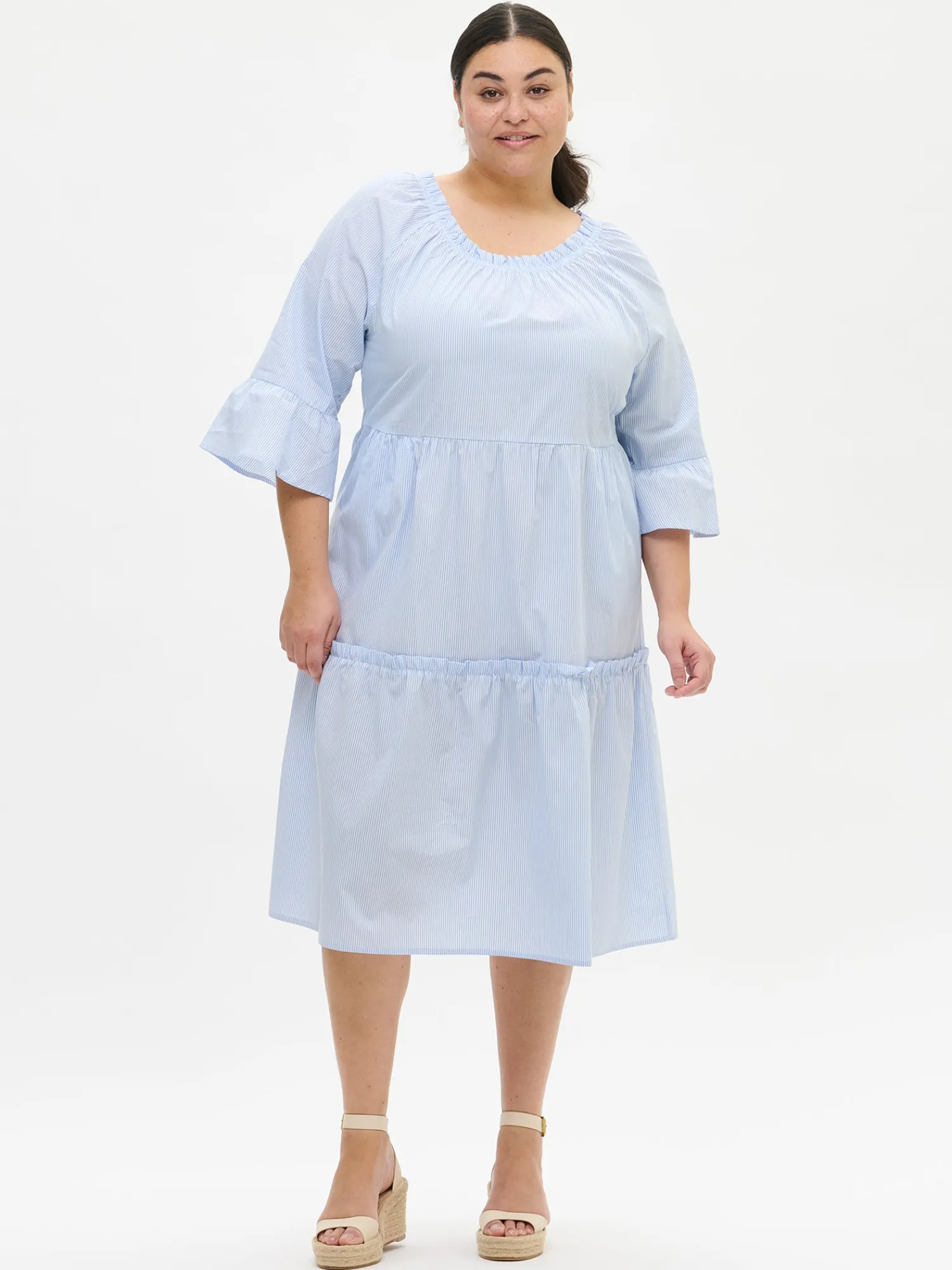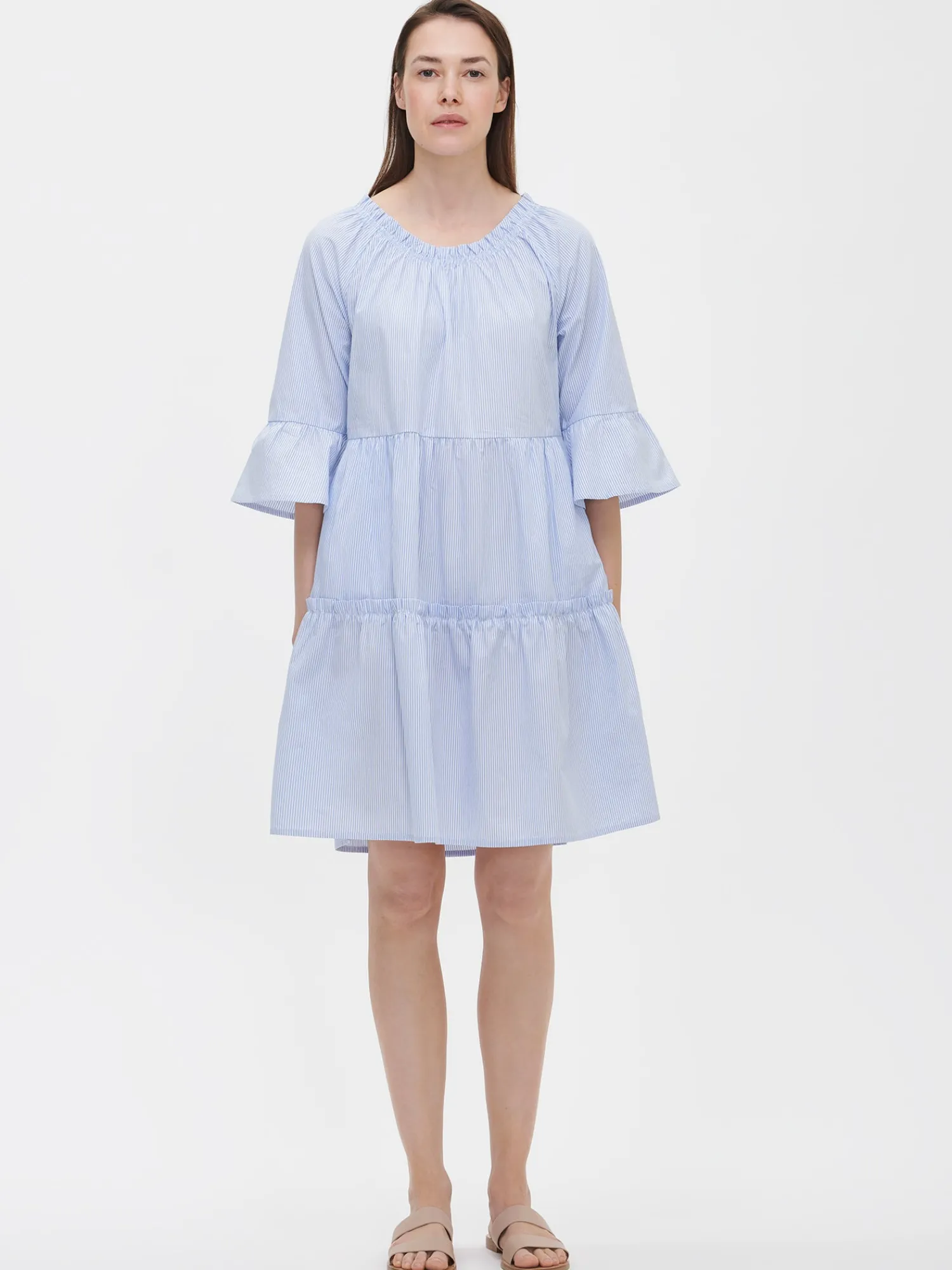 Naisten raidallinen sininen Luotsi-mekko. Kauniissa mekossa on joustava rypytetty pääntie. Mekon 3/4 pituisissa raglanhihoissa on poimutetut kaitaleet hihansuissa ja mekon leikkaussaumoissa on myös kaunis poimutus. Mekon sivuissa on taskut. Mekon pituus koossa 38 on noin 112 cm. Materiaali on kevyttä, mutta ryhdikästä kudottua puuvillakangasta.