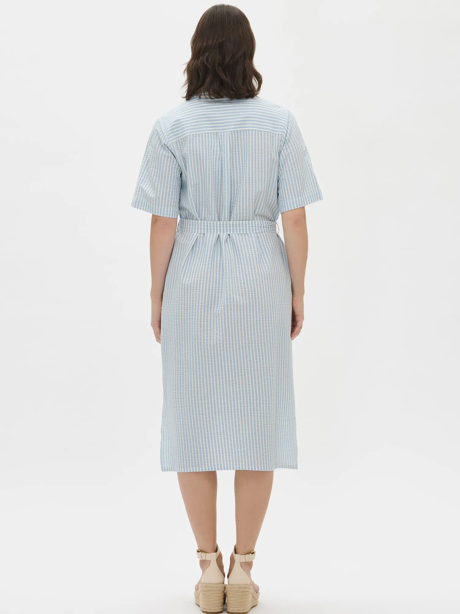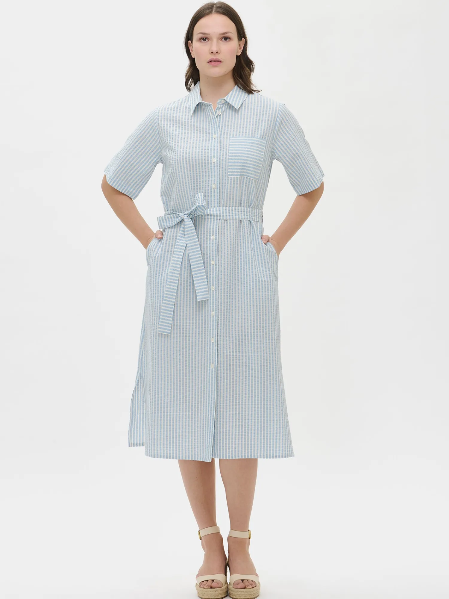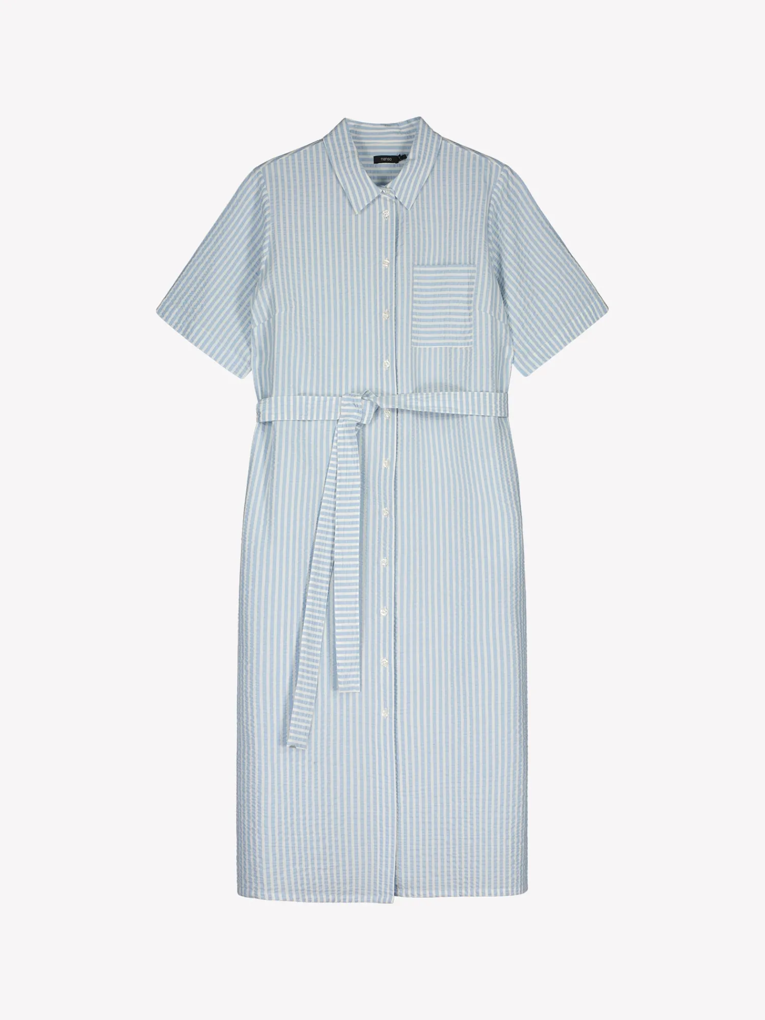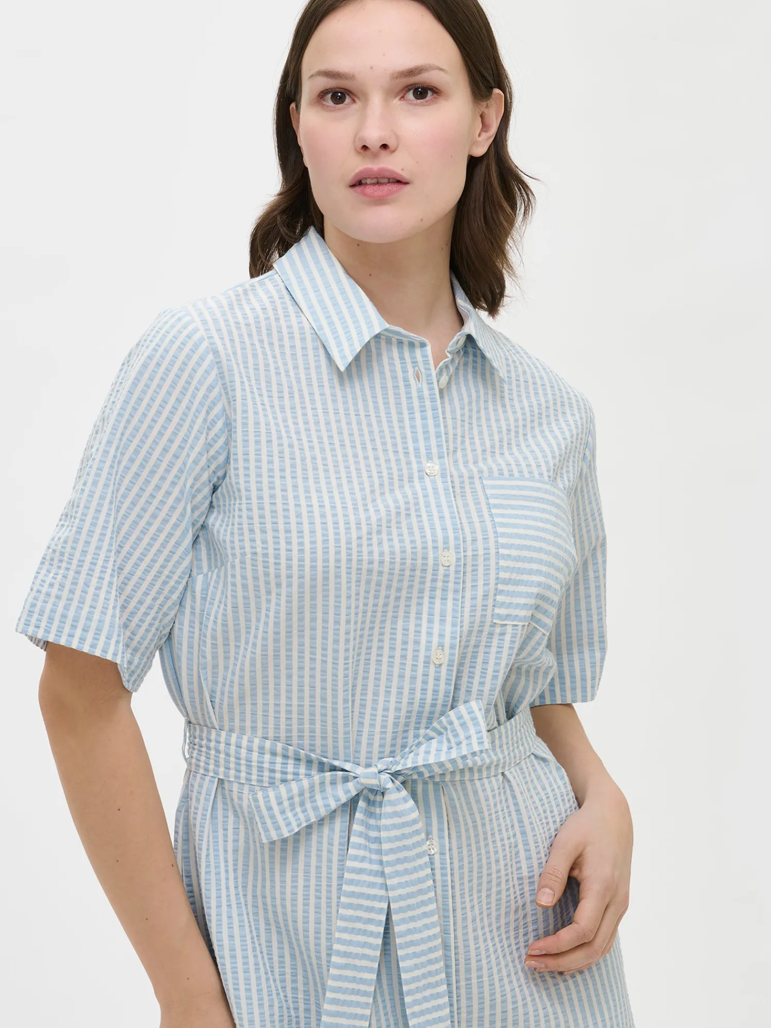 Naisten raidallinen vaaleansininen Marea-paitamekko. Raikas raitamekko on klassinen ja ajaton luottovaate kesään. Rennossa mekossa on pudotettu olkalinja, kaulus ja napit edessä. Mekossa on yksi rintatasku ja sivutaskut. Leveät hihat ovat 2/4 pituiset. Vyötäröllä on irrotettava vyö ja helmassa pitkät halkiot. Mekon pituus koossa 38 on noin 120 cm. Materiaali on kevyttä kudottua puuvilla-viskoosi-elastaanikangasta, jossa on kaunis pintastruktuuri.