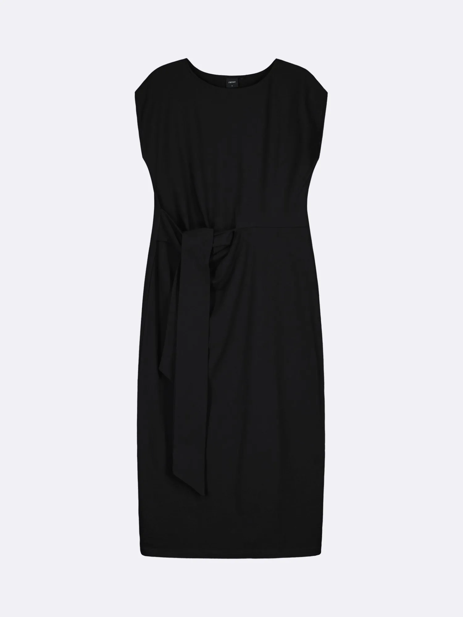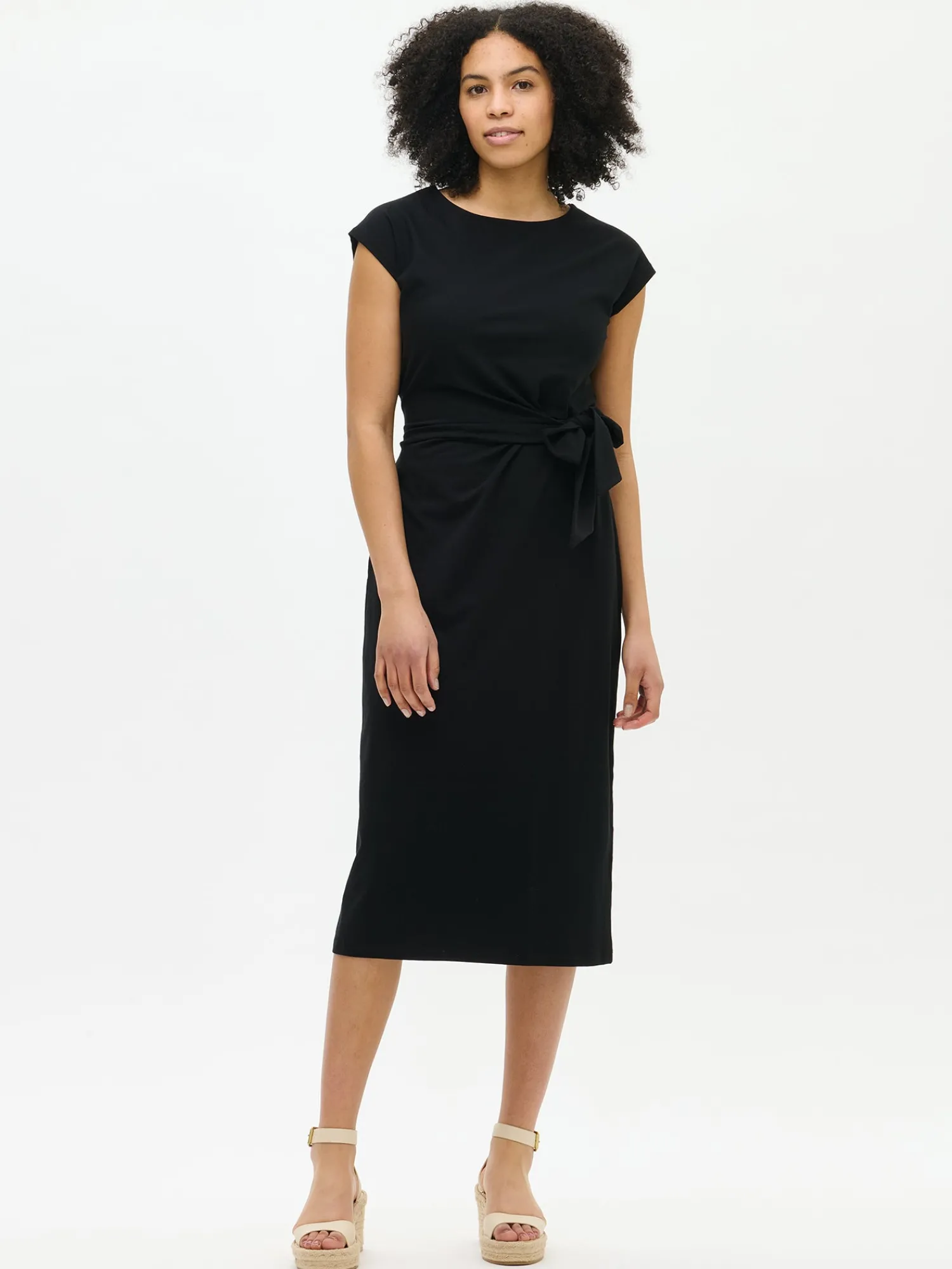 Naisten musta Marleena-mekko solmittavalla solmukkeella. Mekossa on kantilla viimeistelty venepääntie ja holkkihihat. Suoralinjaisessa mekossa on kauniina yksityiskohtana vyötärölle muotoa tuova nauhoilla solmittava solmuke. Mekon pituus koossa M on noin 120 cm. Materiaali on laadukasta ja helppohoitoista puuvilla-elastaani-neulosta, joka pysyy hyvänä pesusta toiseen.