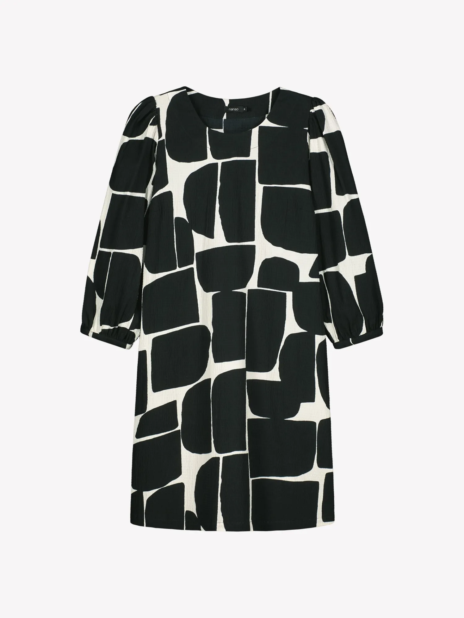 Naisten kuviollinen Muuri-mekko. Mekossa on alavaralla viimeistelty pyöreä pääntie. 3/4 pituiset hihat poimuttuvat runsaasti olalla ja säädettävän listan yläpuolelta. Sivusaumoissa on käytännölliset taskut. Mekon pituus koossa 38 on noin 95 cm. Laadukas kudottu puuvillakangas, jossa on hieman elastaania, antaa ryhdikkyyttä ja mukavaa joustoa. Ajaton Muuri-mekko on tyylikäs valinta, joka toimii sellaisenaan tai asustettuna niin arjessa kuin juhlassakin.