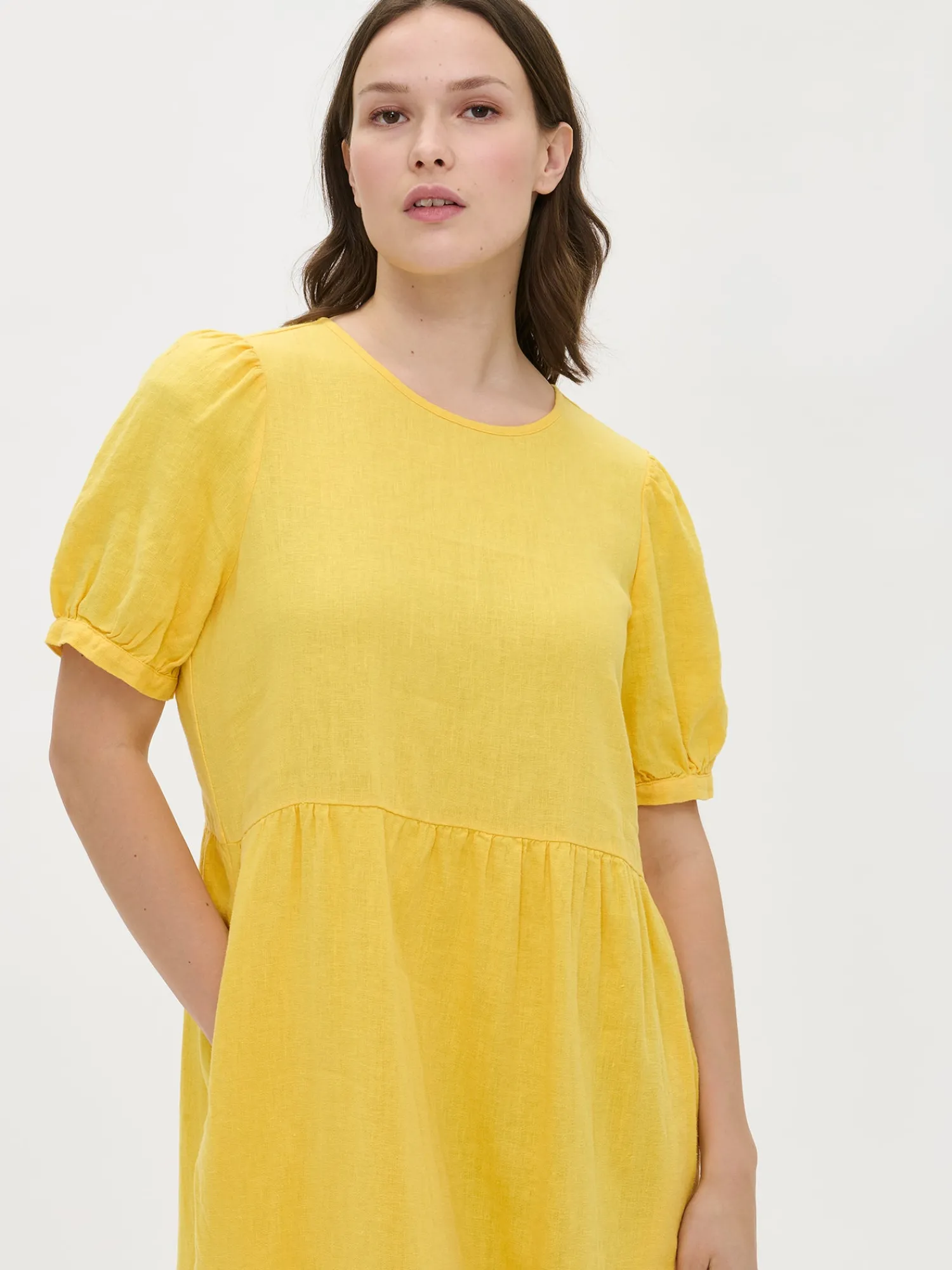 Naisten kaunis keltainen Sarastus-pellavamekko volyymisilla frillakerroksilla ja lyhyillä puhvihihoilla, joissa on napit säätövaralla. Tyylikäs ja rento Sarastus-pellavamekko on kesän kestosuosikki vuodesta toiseen. Mekossa on sivutaskut, pyöreä pääntie sekä niskassa pieni halkio ja solmittavat nyörit. Pellavamekon pituus koossa M on noin 130 cm. Materiaali kudottua pellavakangasta, joka on kestävää ja hengittävää. Pellavalle on ominaista luonnollinen pieni rypistyminen. Tuote on esipesty tuotannossa, joten se ei kutistu ensimmäisessä pesussa.