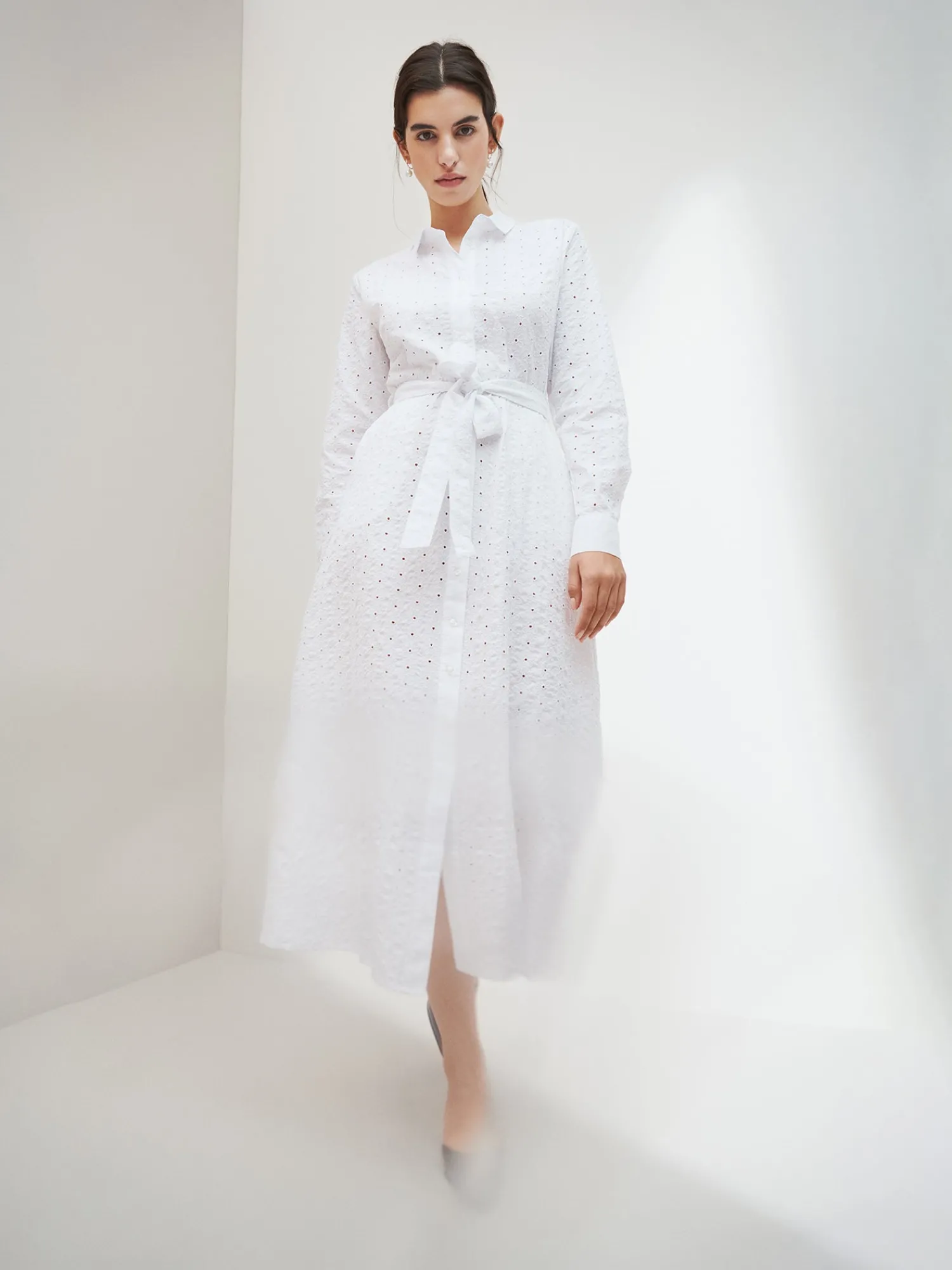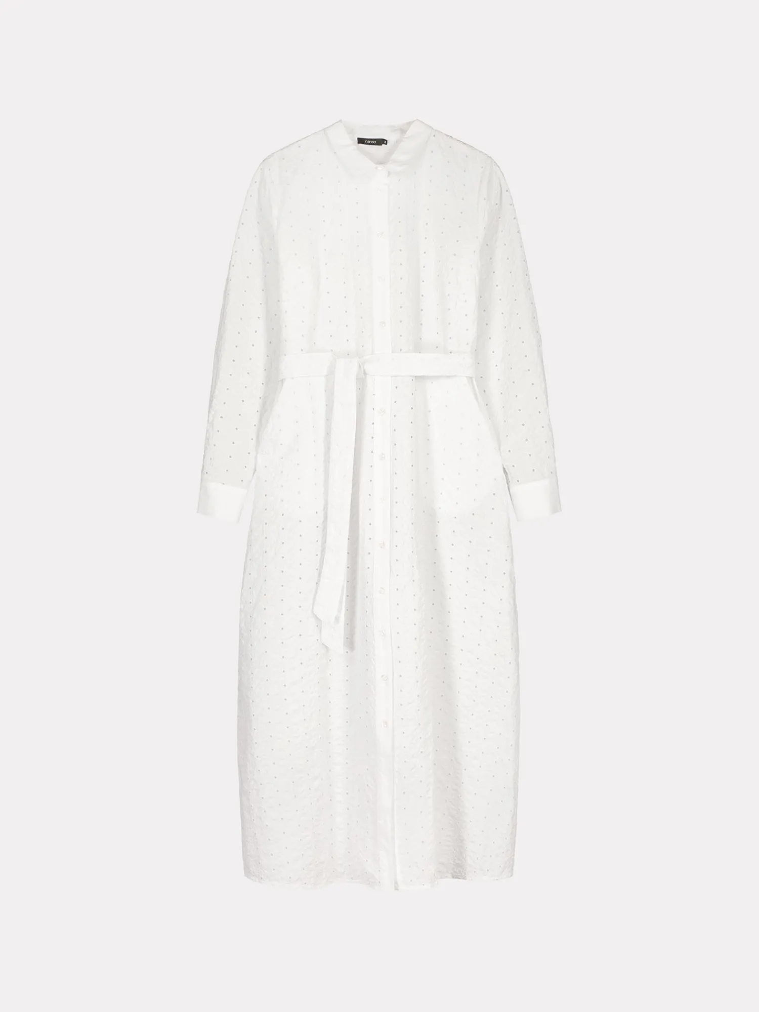 Naisten ihastuttava valkoinen Petra-paitapuseromekko. Tyylikäs mekko on helppo valinta kesän juhliin. Istuvassa paitapuseromekossa on napitus edessä ja hihat ovat täyspitkät. Hihansuissa on nappihalkiot ja mekon vyötäröllä on irroitettava vyö. Mekon sivuissa on taskut. Mekon takana on kaarroke, jonka alapuolella on poimutusta. Mekon pituus koossa 38 on noin 135 cm. Materiaali on kudottua puuvilla-popliinikangasta, jossa on kaunis brodeeraus. Materiaali on kevyttä ja hengittävää. Petra-paitapuseromekko yhdistyy täydellisesti kanssa.