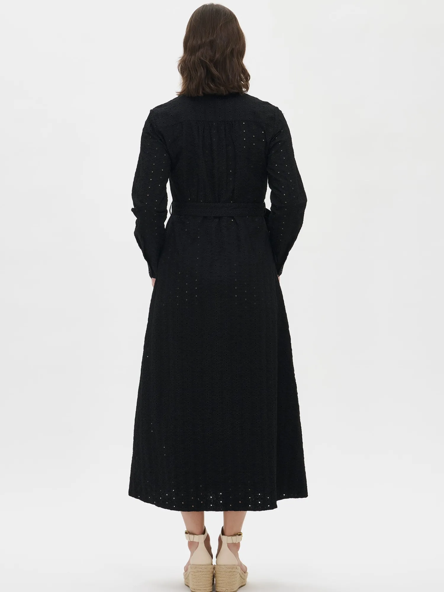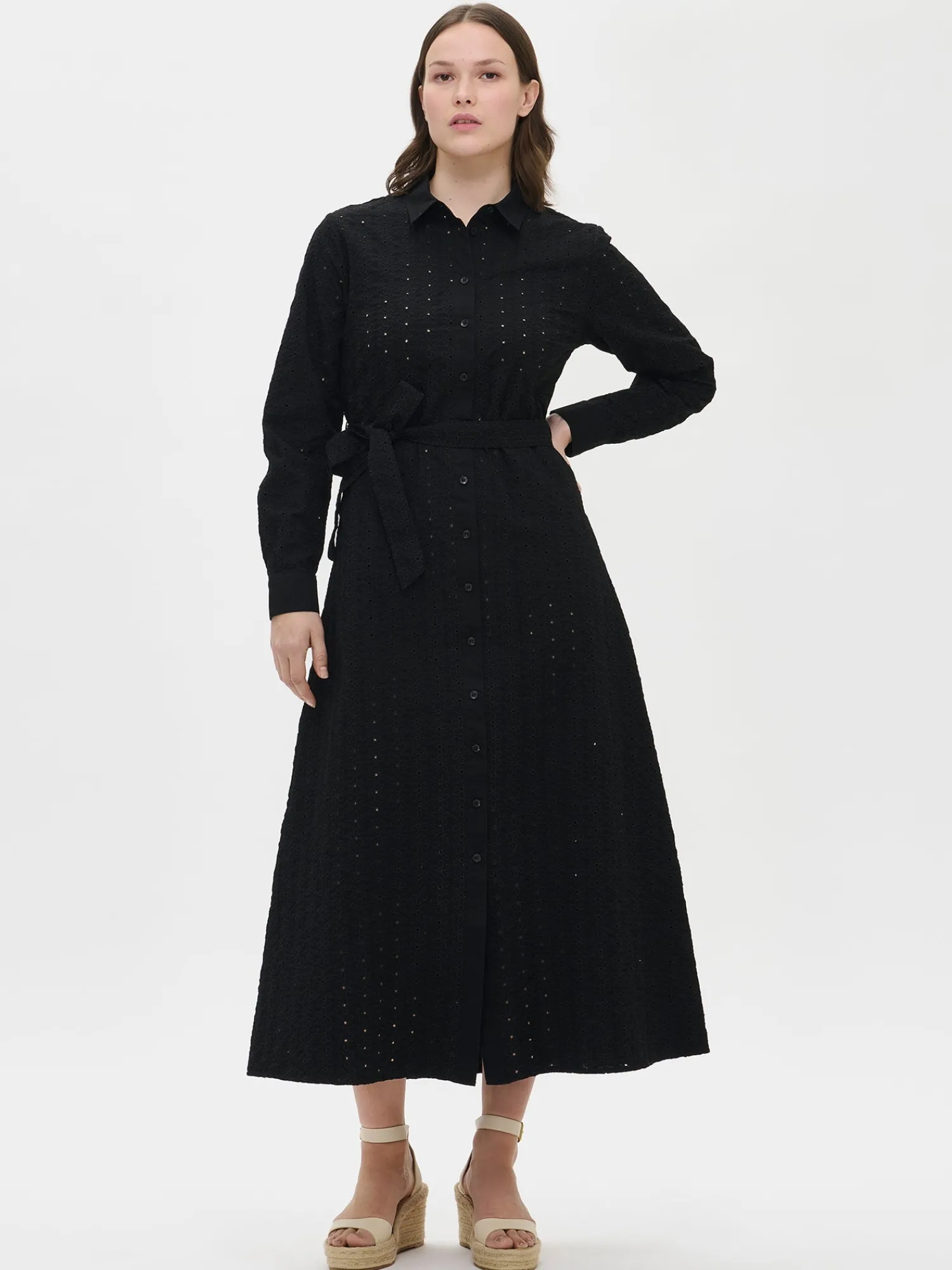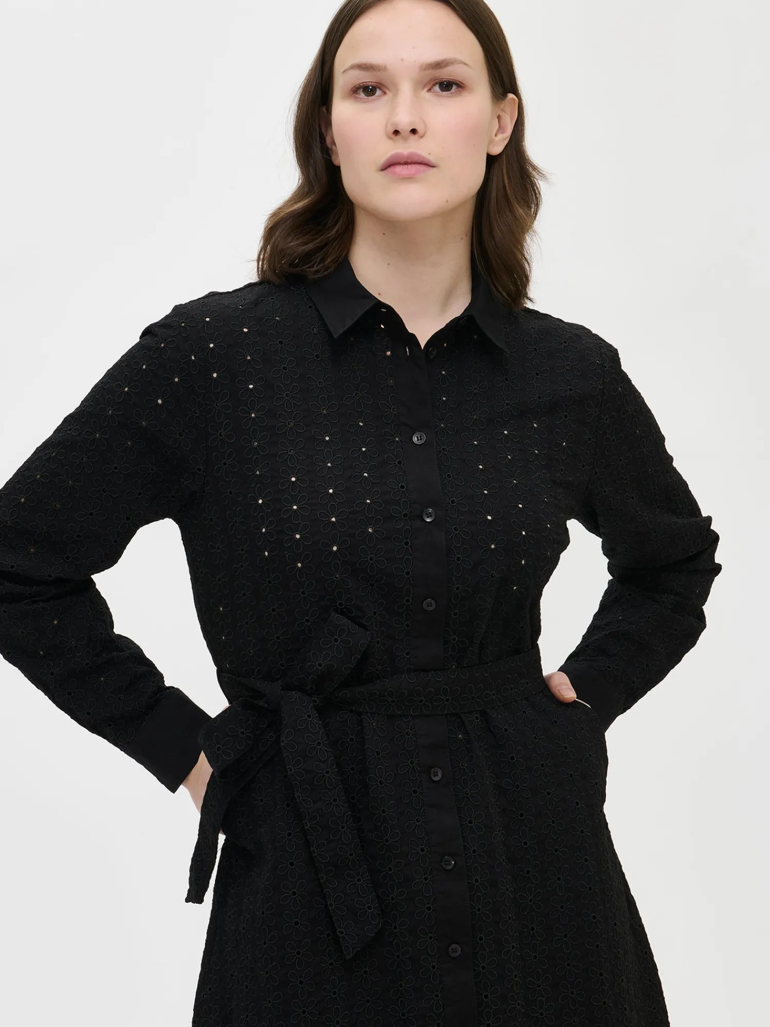 Naisten ihastuttava musta Petra-paitapuseromekko. Istuvassa paitapuseromekossa on napitus edessä ja hihat ovat täyspitkät. Hihansuissa on nappihalkiot ja mekon vyötäröllä on irroitettava vyö. Mekon sivuissa on taskut. Mekon takana on kaarroke, jonka alapuolella on poimutusta. Mekon pituus koossa 38 on noin 135 cm. Materiaali on kudottua puuvilla-popliinikangasta, jossa on kaunis brodeeraus. Materiaali on kevyttä ja hengittävää. Petra-paitapuseromekko yhdistyy täydellisesti kanssa. Tyylikäs mekko on täydellinen valinta kesän juhliin, yhdistäen mukavuuden ja eleganssin vaivattomasti.