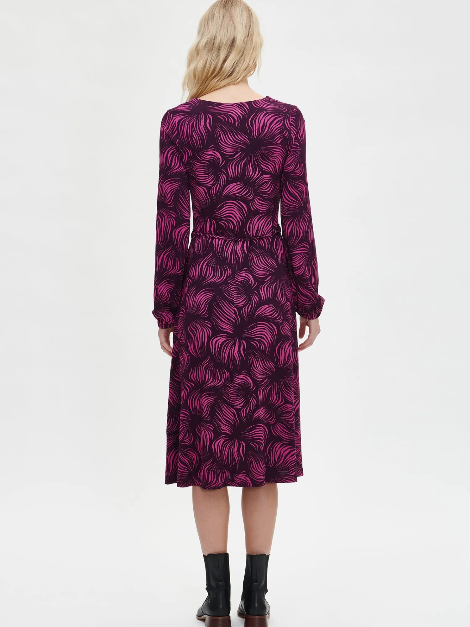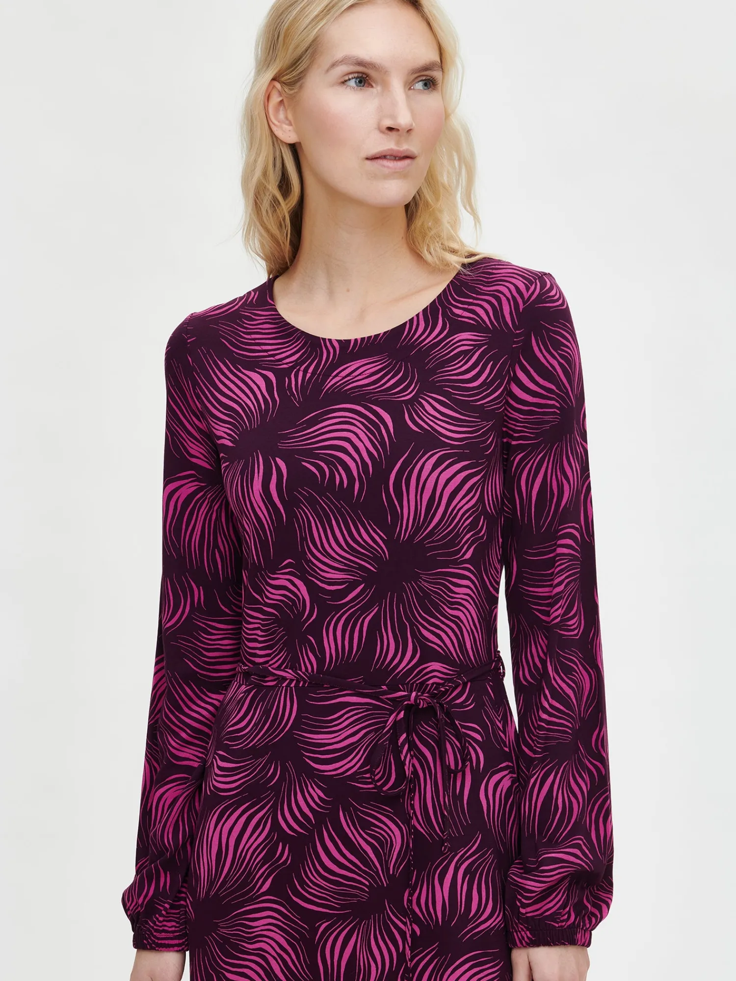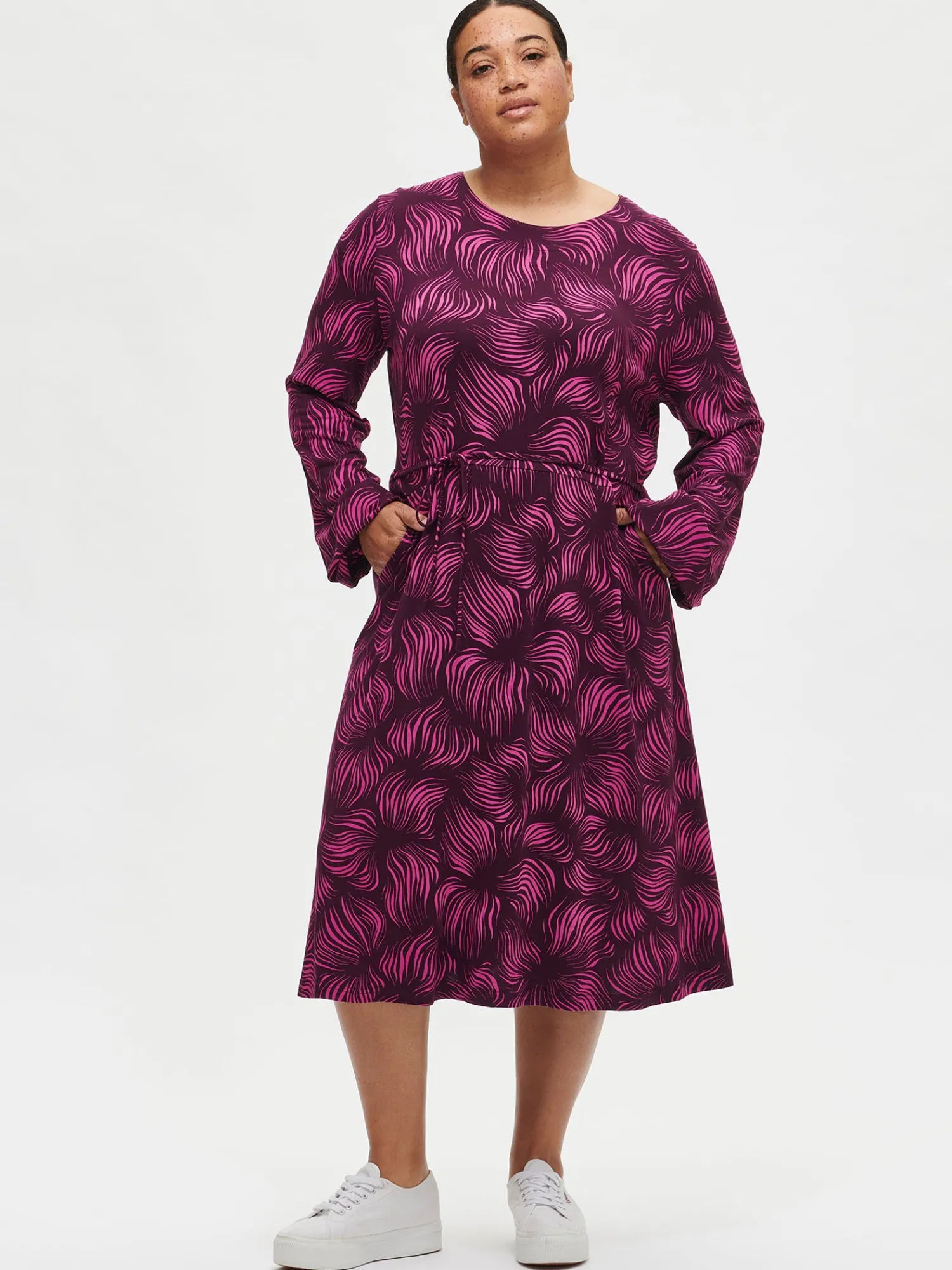 Naisten kuosillinen viininpunainen Pieni Tuija-mekko. Mekossa on alavaralla viimeistelty pyöreä pääntie ja sivutaskut. Täyspitkät hihat poimuttuvat kauniisti hihansuiden kuminauhakäänteeseen. Mekon vyötäröllä on poikkisauma, kapea irroitettava vyö ja kellotettu helma. Mekon pituus koossa M on noin 112 cm. Tuote on valmistettu LENZING™ ECOVERO™-viskoosista. Materiaali on laadukasta, miellyttävän tuntuista ja laskeutuvaa viskoosi-elastaani-neulosta, joka pysyy hyvänä pesusta toiseen. Materiaalille on ominaista 3-5% kutistuminen ensimmäisessä pesussa.