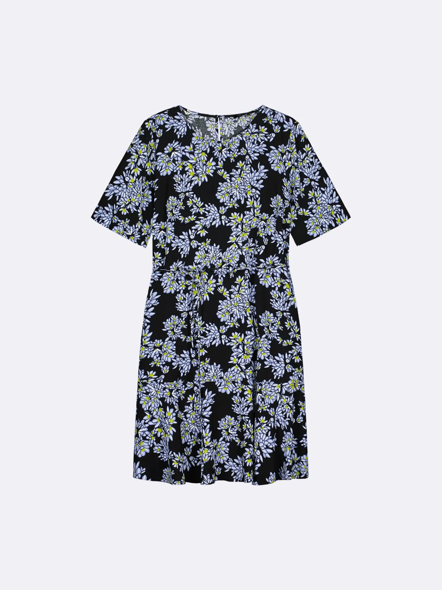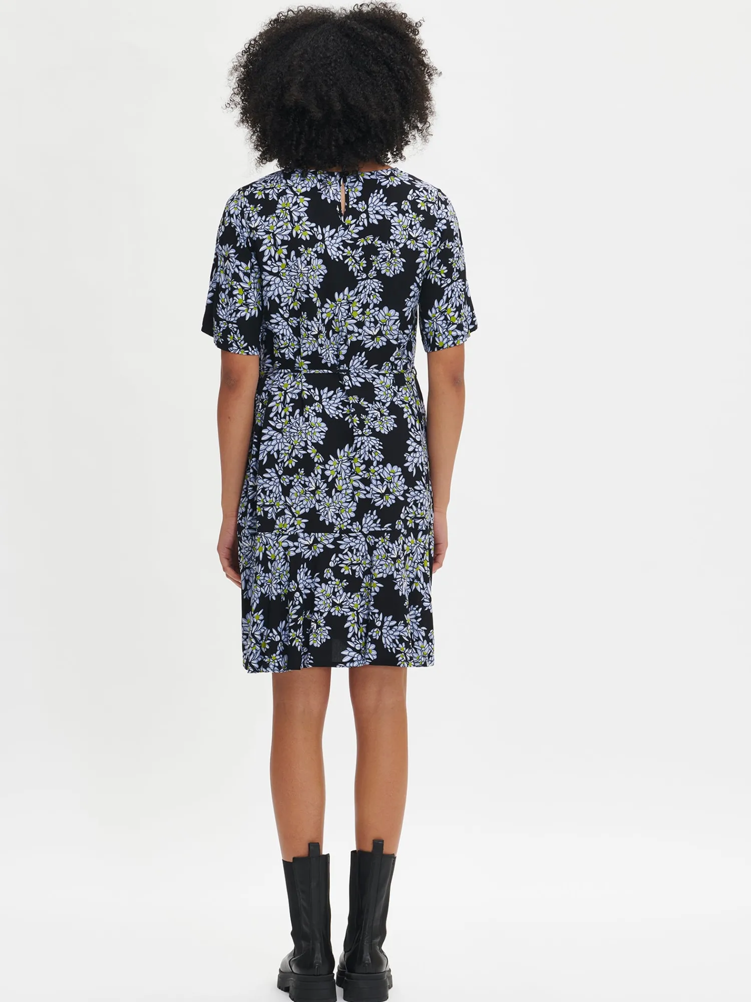 Naisten kuosillinen lyhythihainen Pihlaja-mekko. Mekossa on pyöreä pääntie, jossa nappihalkio takana. Mekon hihat ovat 2/4 pituiset. Mekon sivuissa on taskut ja helmassa kellotus. Mekon vyötäröllä on kapea irrotettava vyö. Mekon pituus koossa 38 on noin 98 cm. Materiaali on kauniisti laskeutuvaa kudottua 100 % viskoosikangasta. Materiaalille on ominaista 3-5 % kutistuminen ensimmäisessä pesussa.