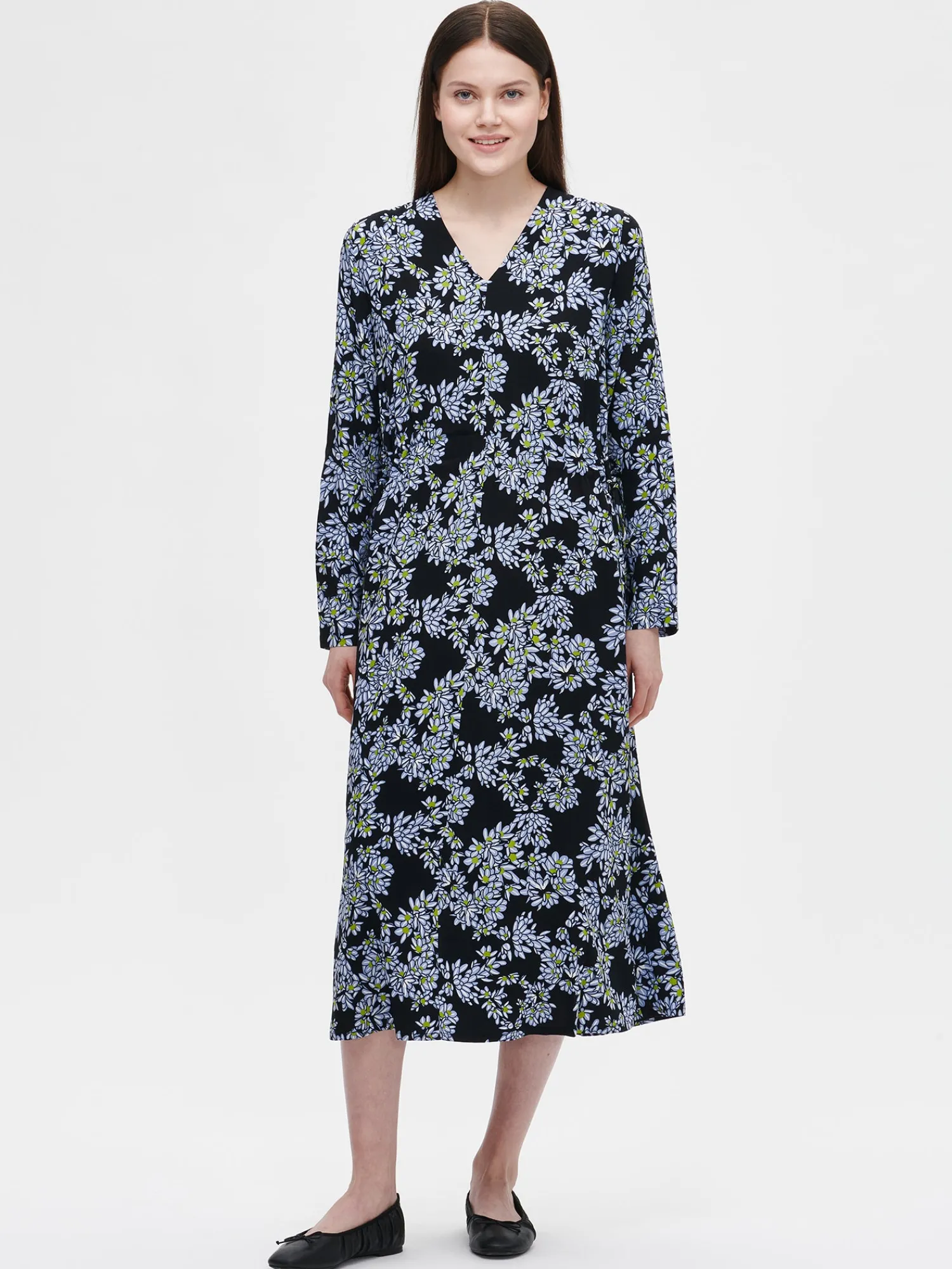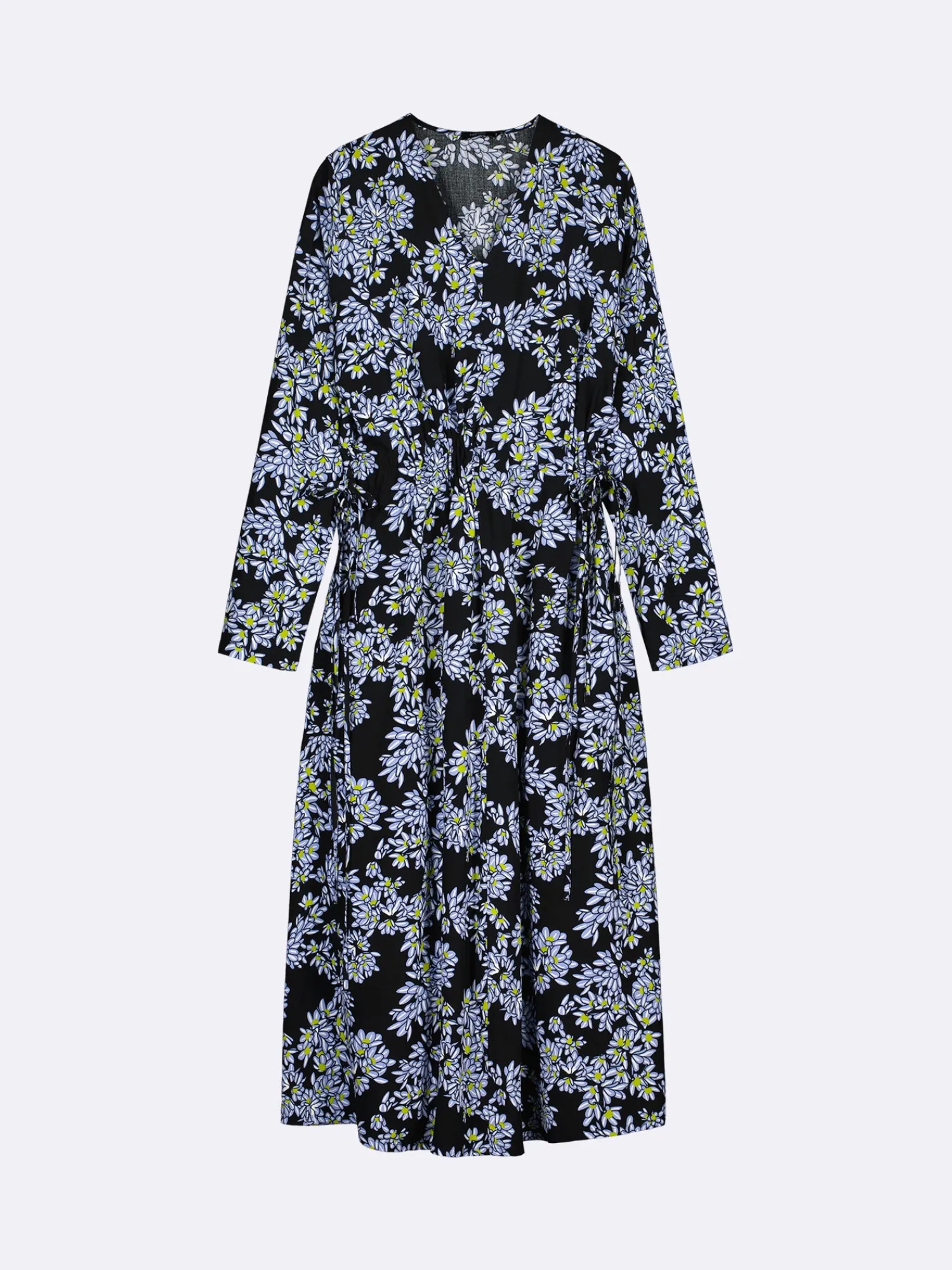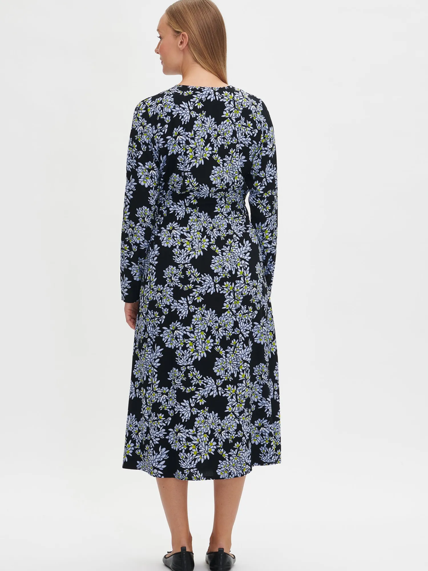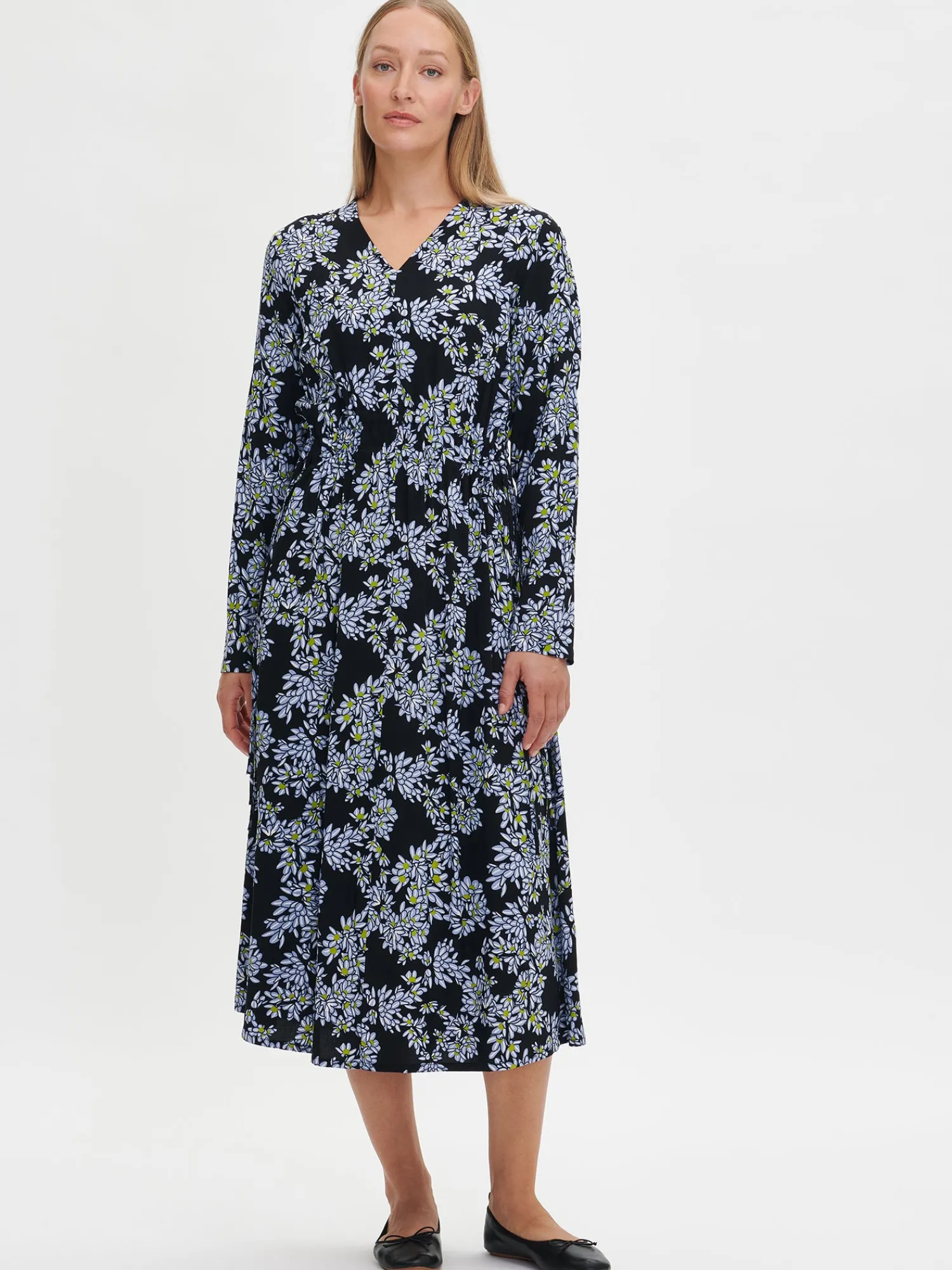 Naisten kuosillinen musta Pihlaja-mekko. Mekossa on V- pääntie, sivutaskut ja täyspitkät hihat. Vyötäröllä on kaksi nyörikujaa, joiden nyörit saa kiristettyä sivuilta. Mekon pituus koossa 38 on noin 125 cm. Materiaali on kauniisti laskeutuvaa kudottua 100 % viskoosikangasta. Materiaalille on ominaista 3-5% kutistuminen ensimmäisessä pesussa.