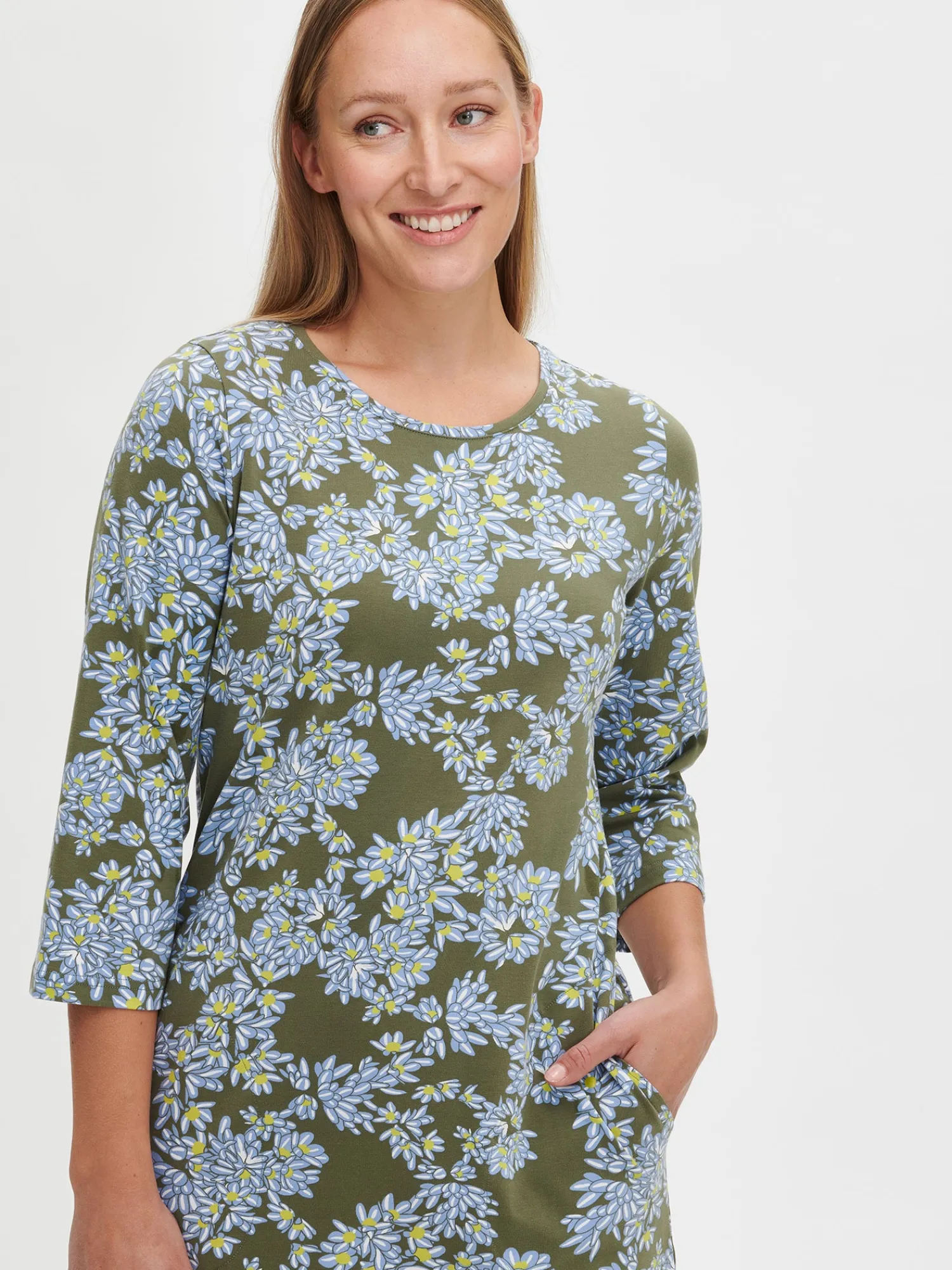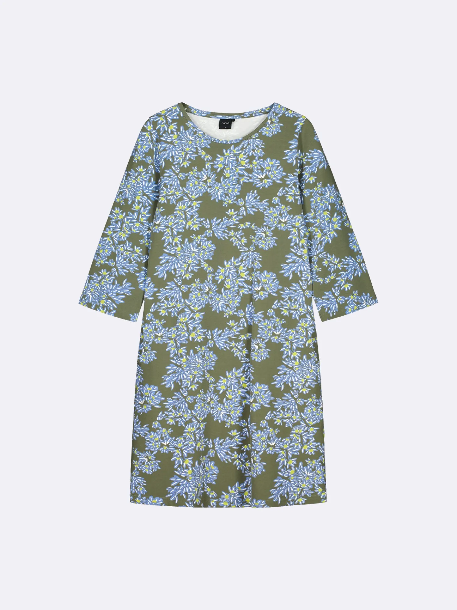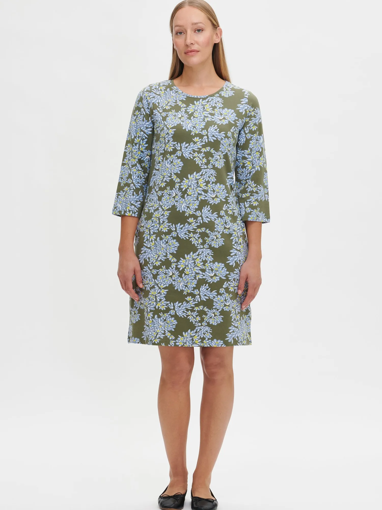 Naisten kuosillinen vihreä Pihlaja-mekko taskuilla. Rentoon ja mukavaan mekkoon on ihanaa pukeutua. Mekossa on tereellä viimeistelty pyöreä pääntie, sivutaskut ja 3/4 pituiset leveät hihat. Mekon pituus koossa M on noin 98 cm. Materiaali on miellyttävän tuntuista ja helppohoitoista puuvilla-elastaani-neulosta.