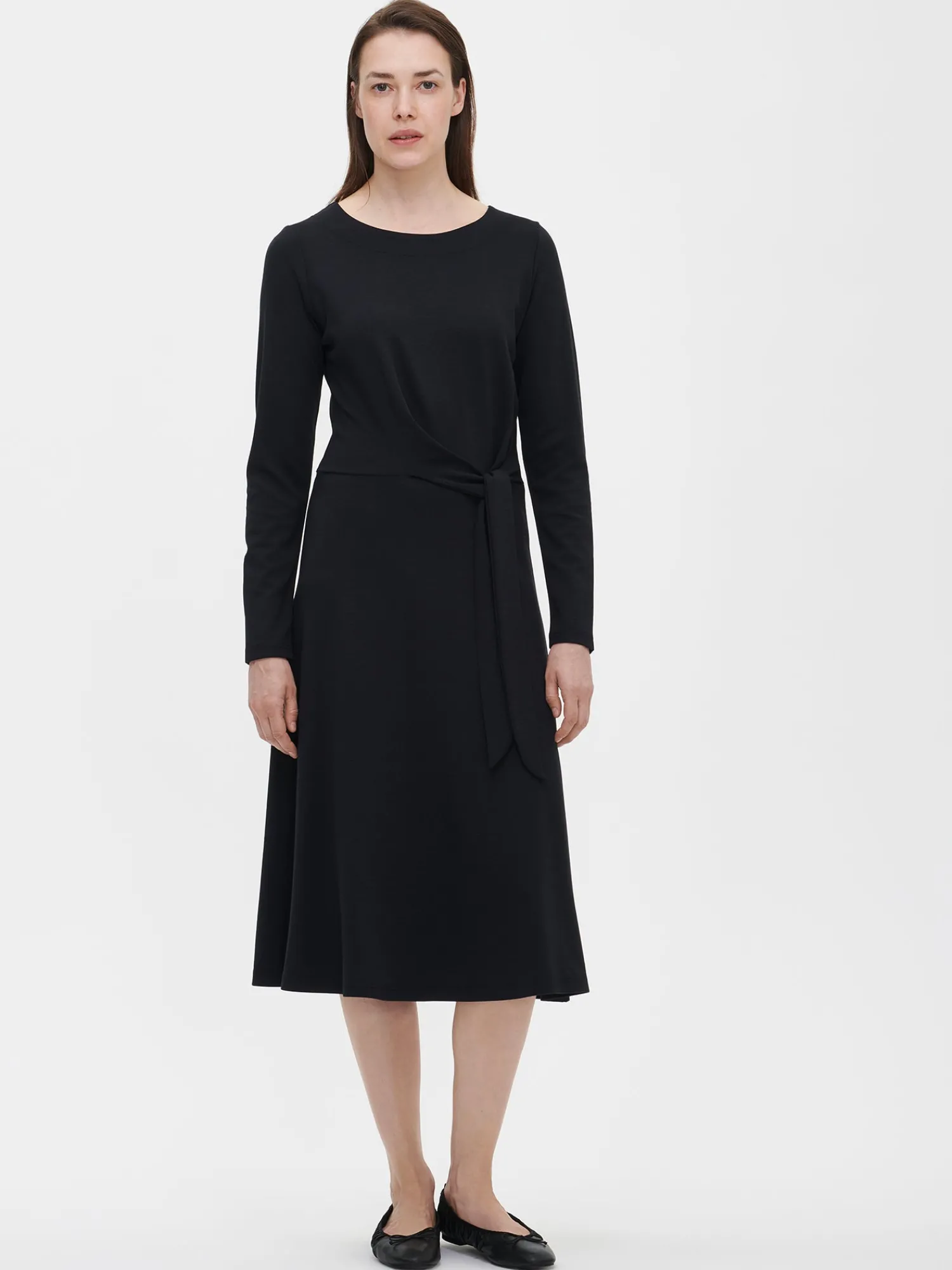 Naisten kaunis musta Piirre-mekko pitkillä hihoilla. Piirre-mekko on luottovaate arkeen. Mekossa on alavaralla huoliteltu ovaali pääntie ja täyspitkät hihat. Mekon vasemmalle sivulle muodostuu kaunis, naisellinen solmuke vyön avulla. Mekon pituus koossa M on noin 115cm. Materiaali on pehmeää, paskumpaa viskoosi-polyamidi-elastaani -neulosta.