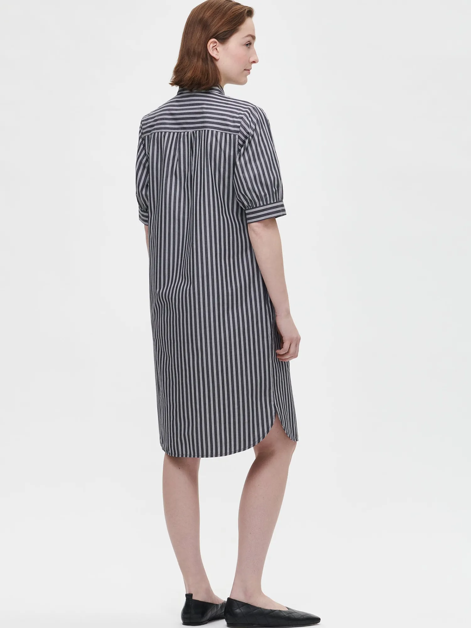 Naisten raidallinen siniharmaa Piirto-paitamekko. Tyylikkään paitamekon voi pukea arkeen tai juhlaan. Mekossa on kaulus, edessä napitus, rintamuotolaskokset ja paikkatasku. 2/4 pituiset hihat poimuttuvat kauniisti hihansuun leveän kaitaleen yläpuolella. Mekossa on sivutaskut ja pyöristetty helma. Mekon pituus koossa 38 on noin 105 cm. Materiaali on kevyttä kudottua puuvillakangasta.