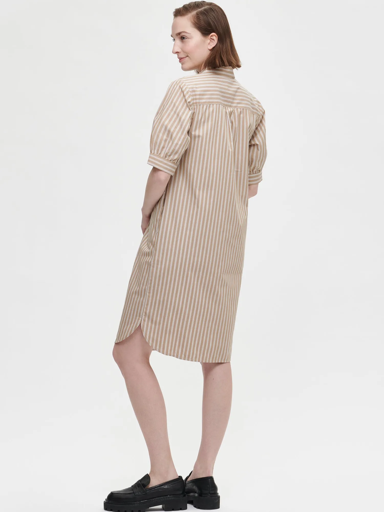 Naisten raidallinen ruskea Piirto-paitamekko. Tyylikkään paitamekon voi pukea arkeen tai juhlaan. Mekossa on kaulus, edessä napitus, rintamuotolaskokset ja paikkatasku. 2/4 pituiset hihat poimuttuvat kauniisti hihansuun leveän kaitaleen yläpuolella. Mekossa on sivutaskut ja pyöristetty helma. Mekon pituus koossa 38 on noin 105 cm. Materiaali on kevyttä kudottua puuvillakangasta.