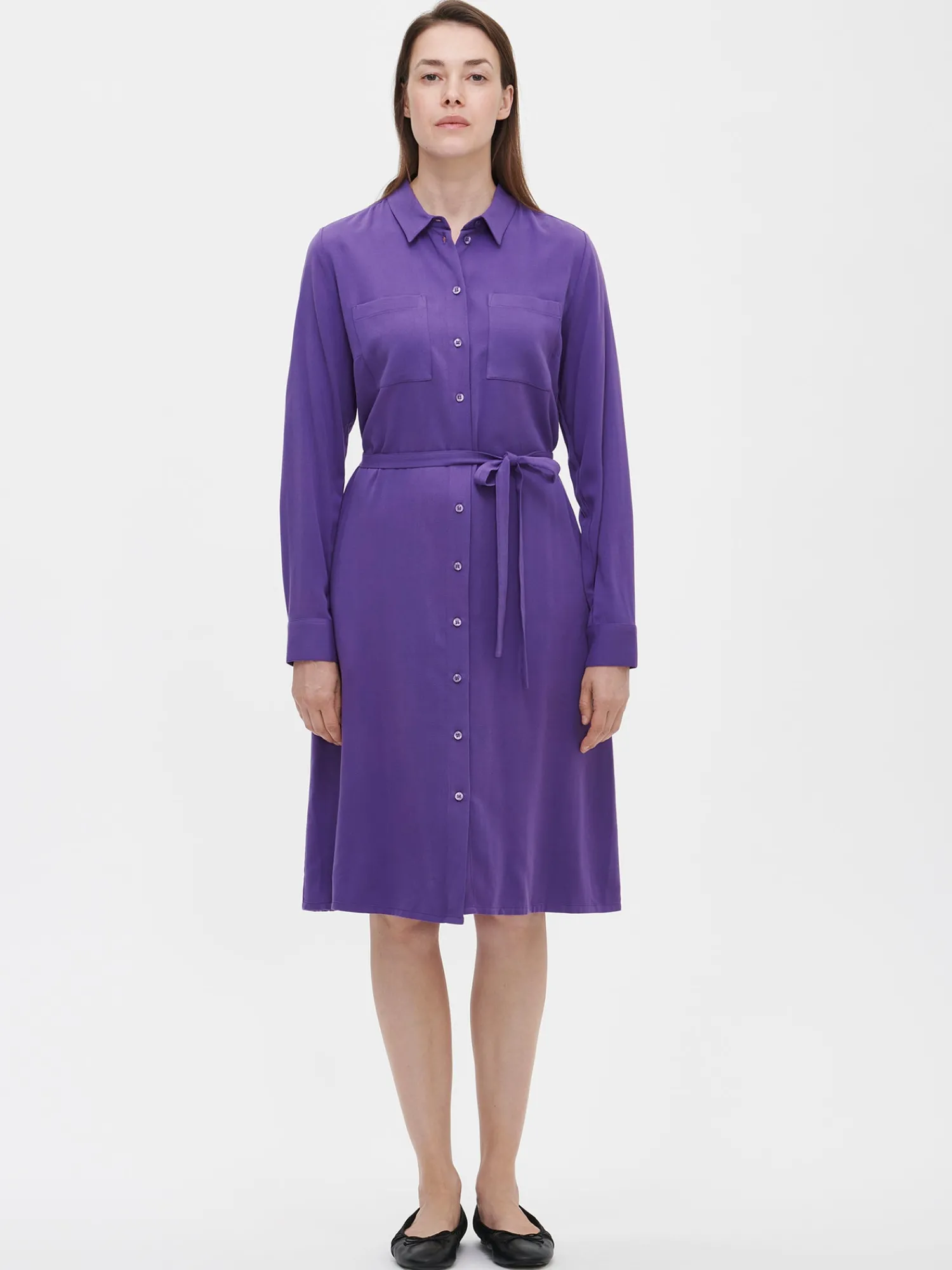 Naisten lila Raami-mekko. Kauluspaitamekko on vaatekaapin ajaton klassikko. Mekossa on edessä napitus, rintataskut, rintamuotolaskokset ja takana laskos. Mekossa on täyspitkät hihat, joiden hihansuissa on nappikalvosimet. Mukana tulee samasta materiaalista valmistettu kapea irtovyö. Mekon pituus koossa 38 on noin 110 cm. Kauniisti laskeutuvan puseron materiaali on laadukasta ja miellyttävän tuntuista twill sidoksista viskoosikangasta. Tuote on valmistettu LENZING™ ECOVERO™ -viskoosista. Materiaalille on ominaista 3-5% kutistuminen ensimmäisessä pesussa.