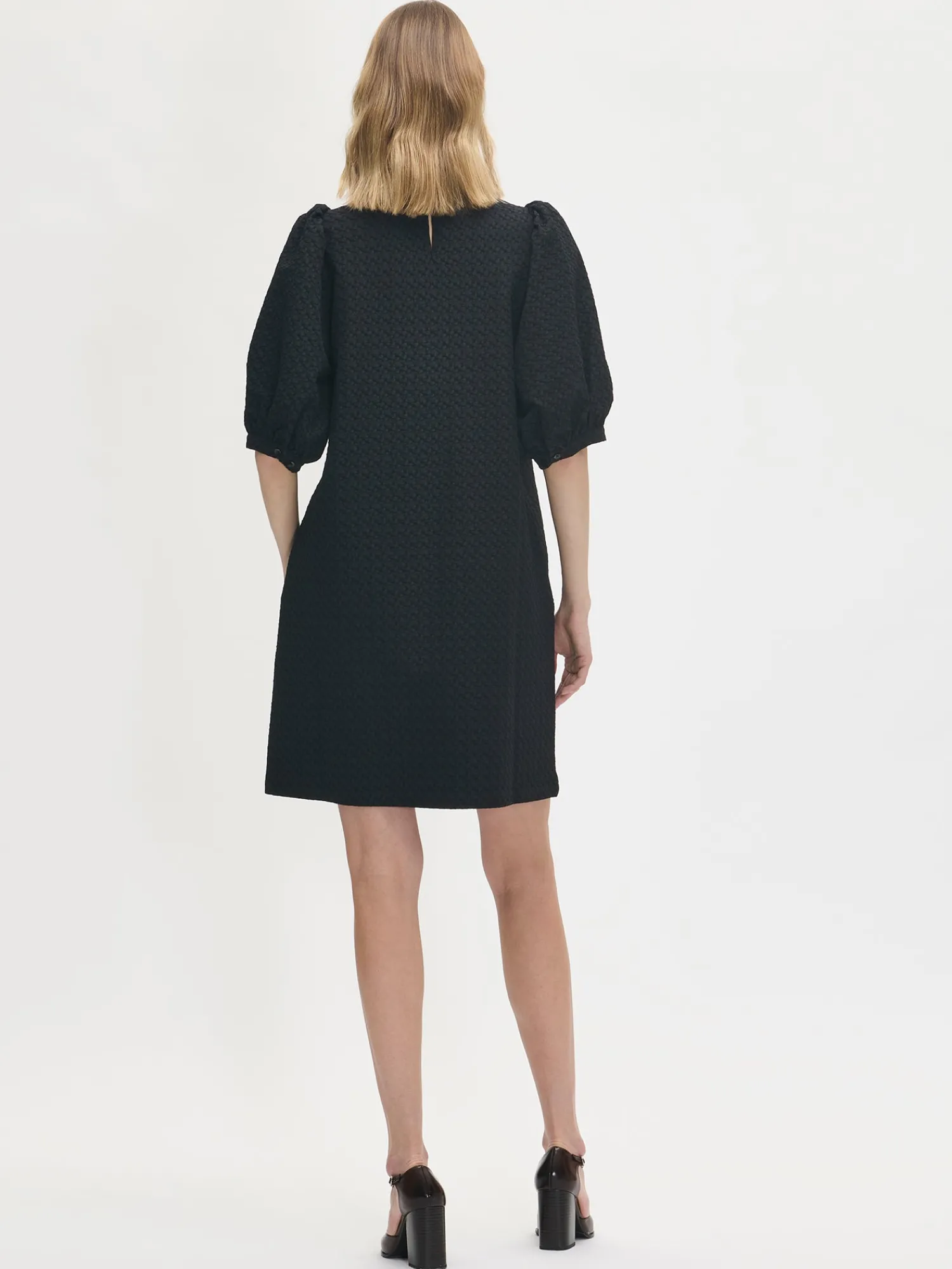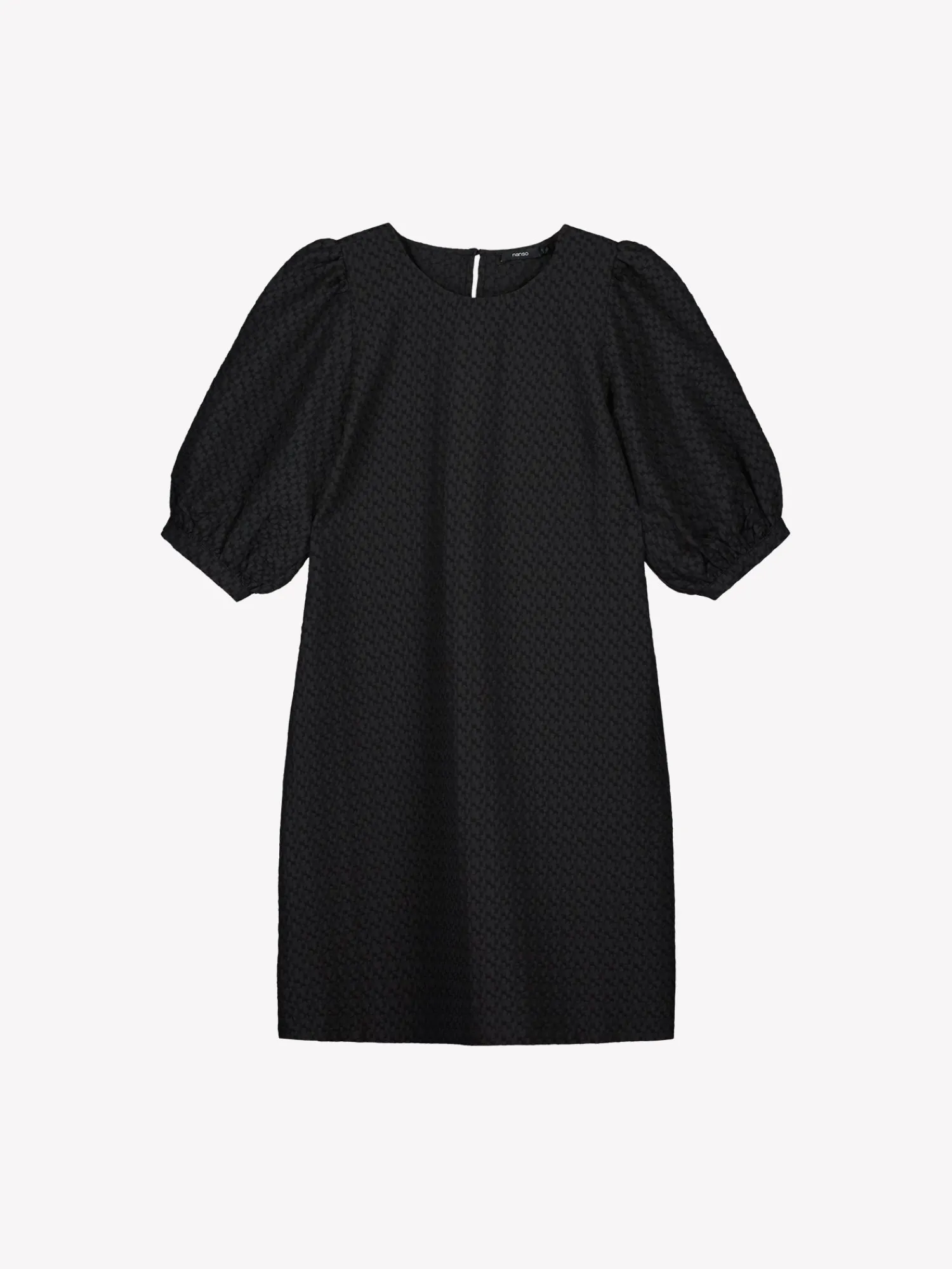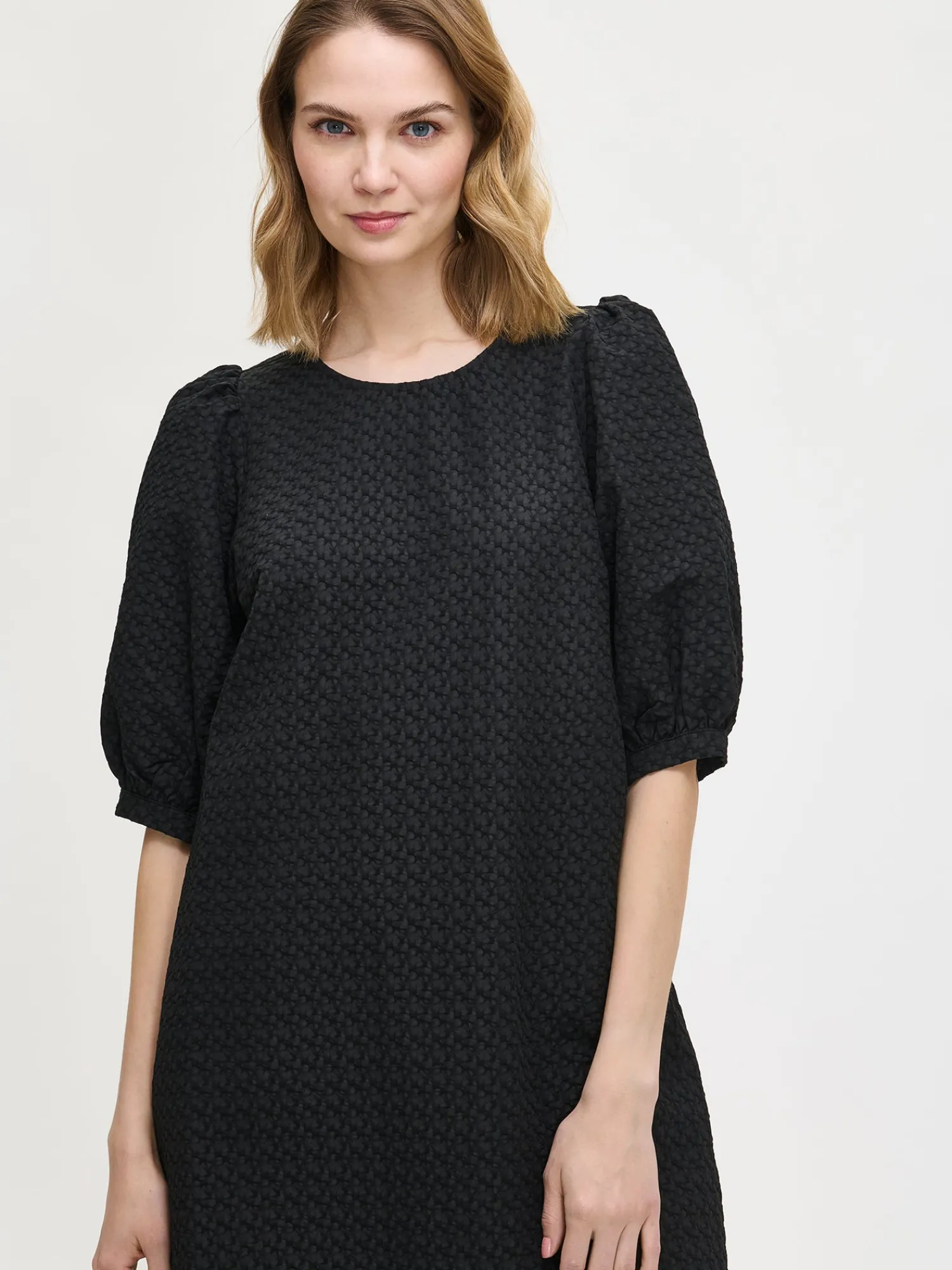 Naisten tyylikäs musta lyhythihainen Reliefi-mekko. Klassisen tyylikäs mekko sopii täydellisesti myös juhlaviin tilaisuuksiin. Lyhyessä mekossa on pyöreä pääntie, jossa takana nappihalkio. Mekon 3/4 pituiset hihat poimuttuvat runsaasti olalla ja hihansuun säädettävän listan yläpuolelta. Mekon sivuissa on taskut. Mekon pituus koossa 38 on noin 95 cm. Materiaali on miellyttävän tuntuista kudottua polyesteri-viskoosi-elastaani, jossa on kaunis pintastruktuuri. Materiaalille on ominaista 3-5 % kutistuminen ensimmäisessä pesussa.