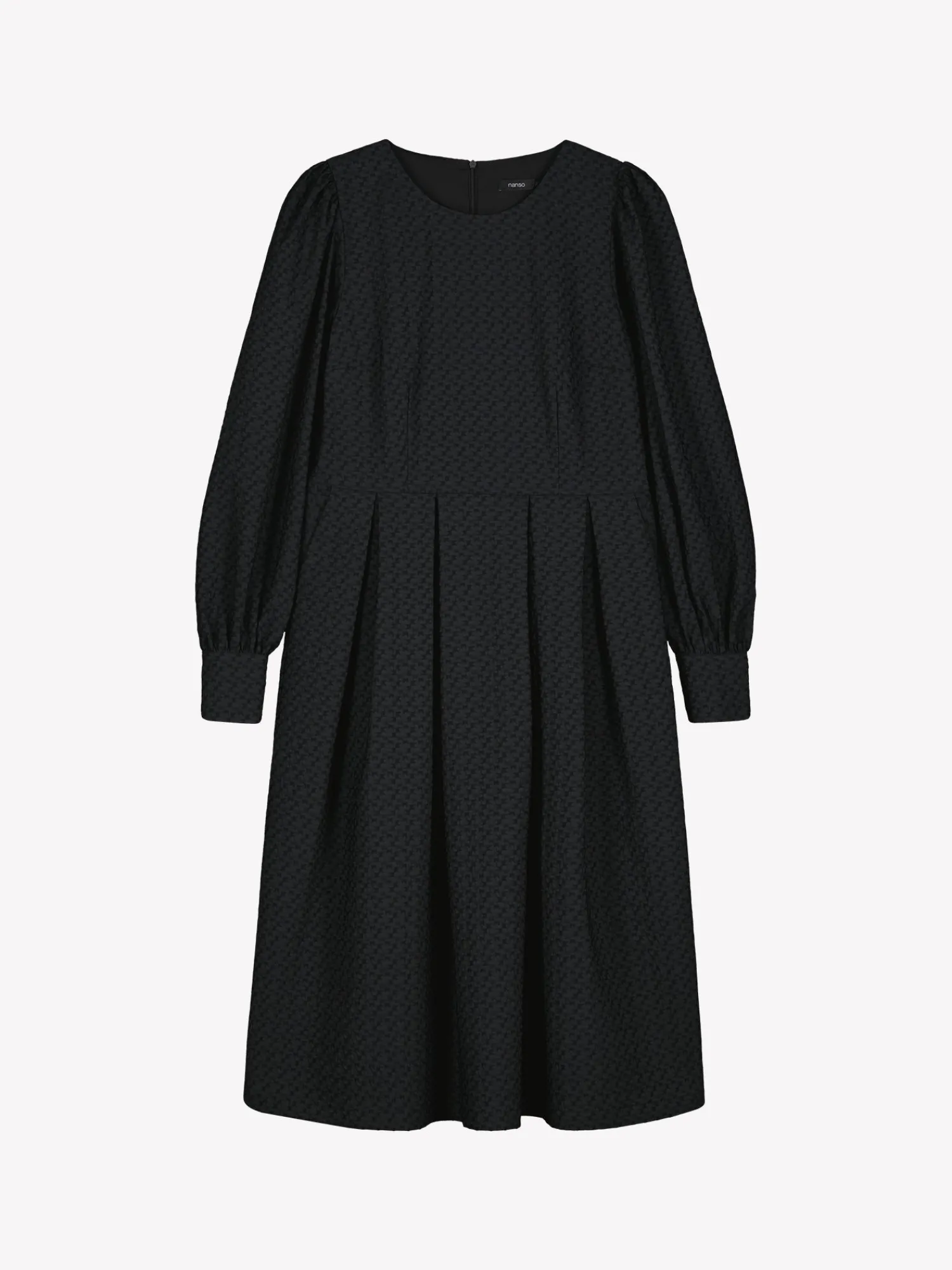 Naisten tyylikäs yksivärinen Reliefi-mekko. Mekossa on pyöreä pääntie, jossa takana vetoketju. Mekon täyspituiset hihat poimuttuvat runsaasti olalla ja hihansuun säädettävän listan yläpuolelta. Mekossa on laskokset vyötäröllä, levenevä helma ja sivuissa on taskut. Mekon pituus koossa 38 on noin 115 cm. Materiaali on miellyttävän tuntuista kudottua polyesteri-viskoosi-elastaani, jossa on kaunis pintastruktuuri. Materiaalille on ominaista 3-5% kutistuminen ensimmäisessä pesussa.