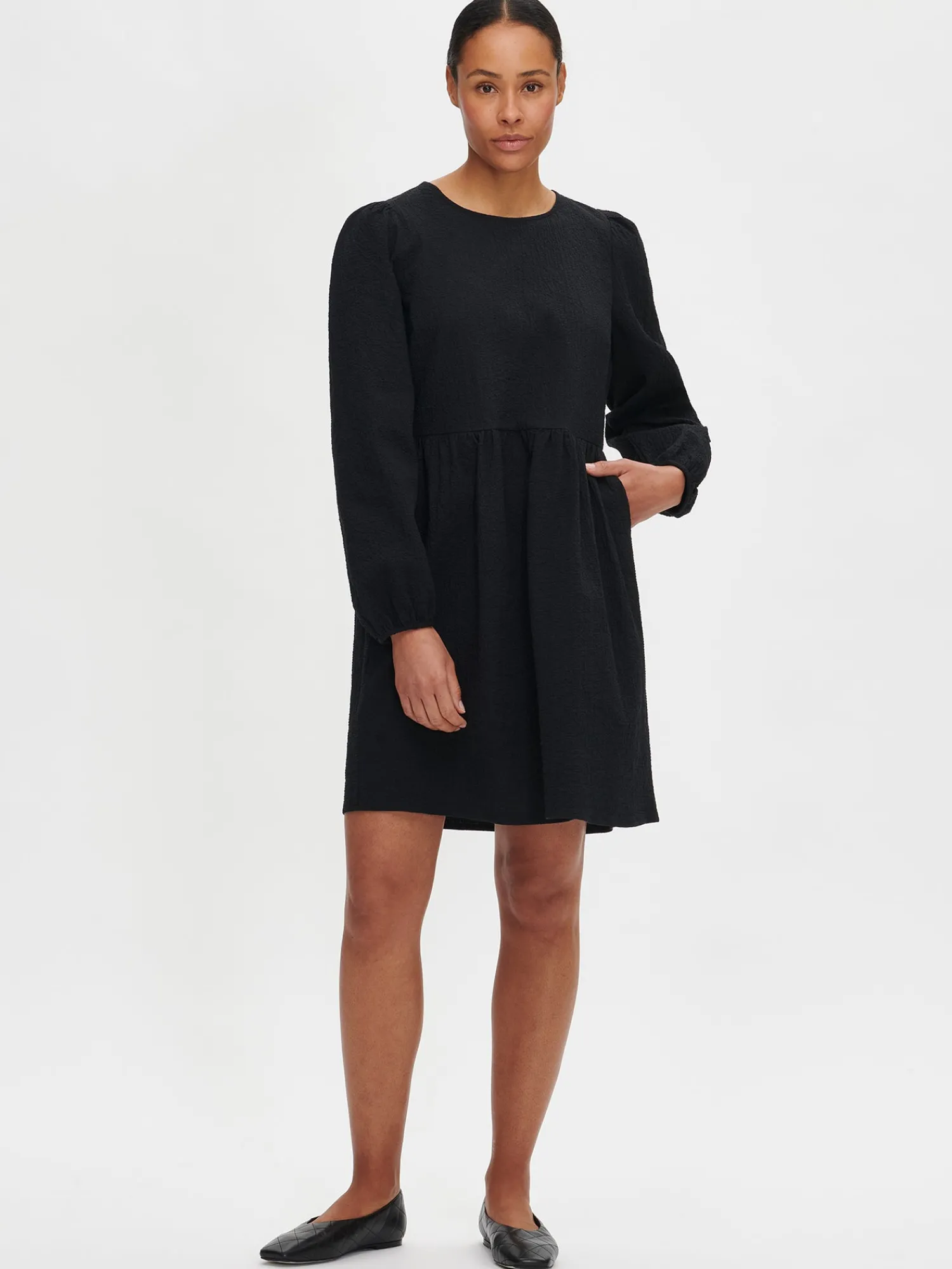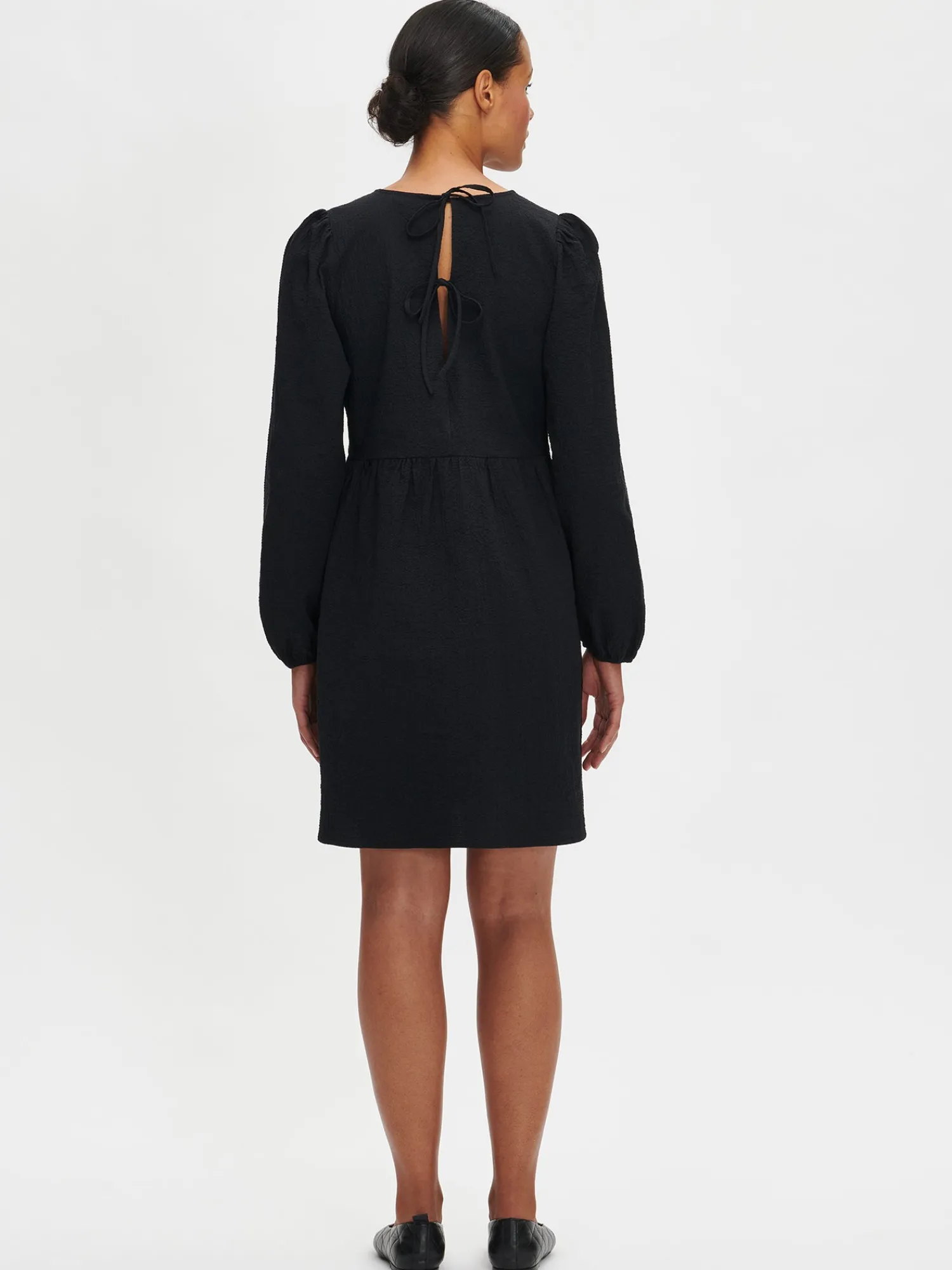 Naisten pitkähihainen musta Rusetti-mekko. Tyylikäs mekko on loistava valinta niin arkeen kuin juhlaan. Mekossa kantilla viimeistelty pyöreä pääntie ja takana yksityiskohtana halkio kahdella rusetilla, joista ylimmäinen on avattava. Täyspitkät hihat poimuttuvat hihansuiden kuminauhakäänteeseen. Mekossa on kaunis poimutus vyötäröllä ja sivutaskut. Mekon pituus koossa M on noin 95 cm. Materiaali on kudottua puuvillakangasta, jossa kaunis seersucker pintastruktuuri. Kankaassa on hieman elastaania antamassa joustoa. Materiaalille on ominaista 3-5% kutistuminen ensimmäisessä pesussa.