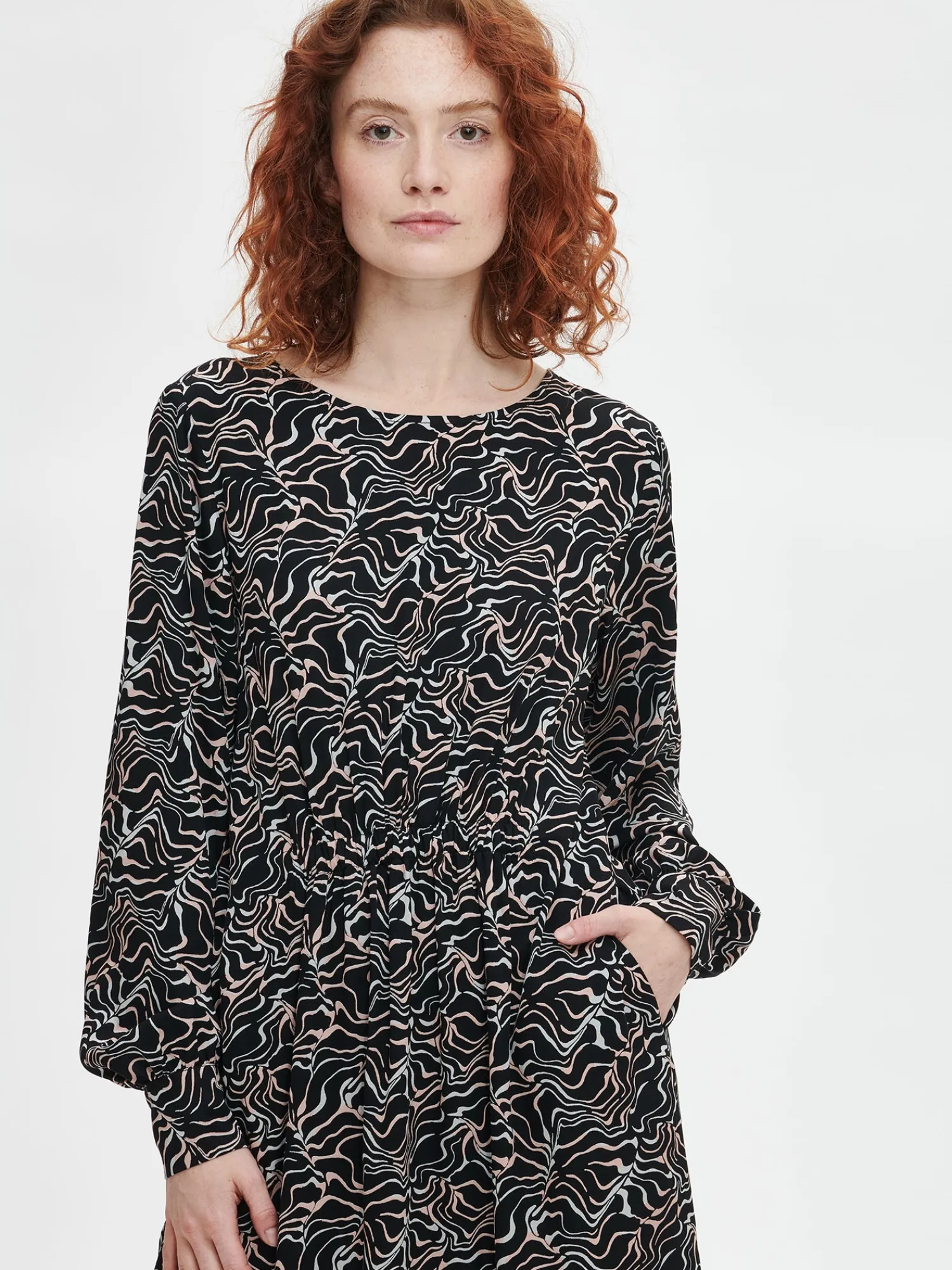 Naisten kuosillinen musta pitkä Sara-mekko. Mekossa on pyöreä pääntie, jossa takana pisaran muotoinen nappihalkio. Mekossa on sivutaskut ja vyötäröllä joustava kuminauha edessä ja takana, joka tuo mekkoon muotoa. Mekossa on täyspitkät hihat, jotka poimuttuvat hihansuun leveän nappikalvosimen yläpuolelle. Mekon pituus koossa 38 on noin 125 cm. Materiaali on kauniisti laskeutuvaa twillisidoksista viskoosikangasta. Materiaalille on ominaista 3-5% kutistuminen ensimmäisessä pesussa.