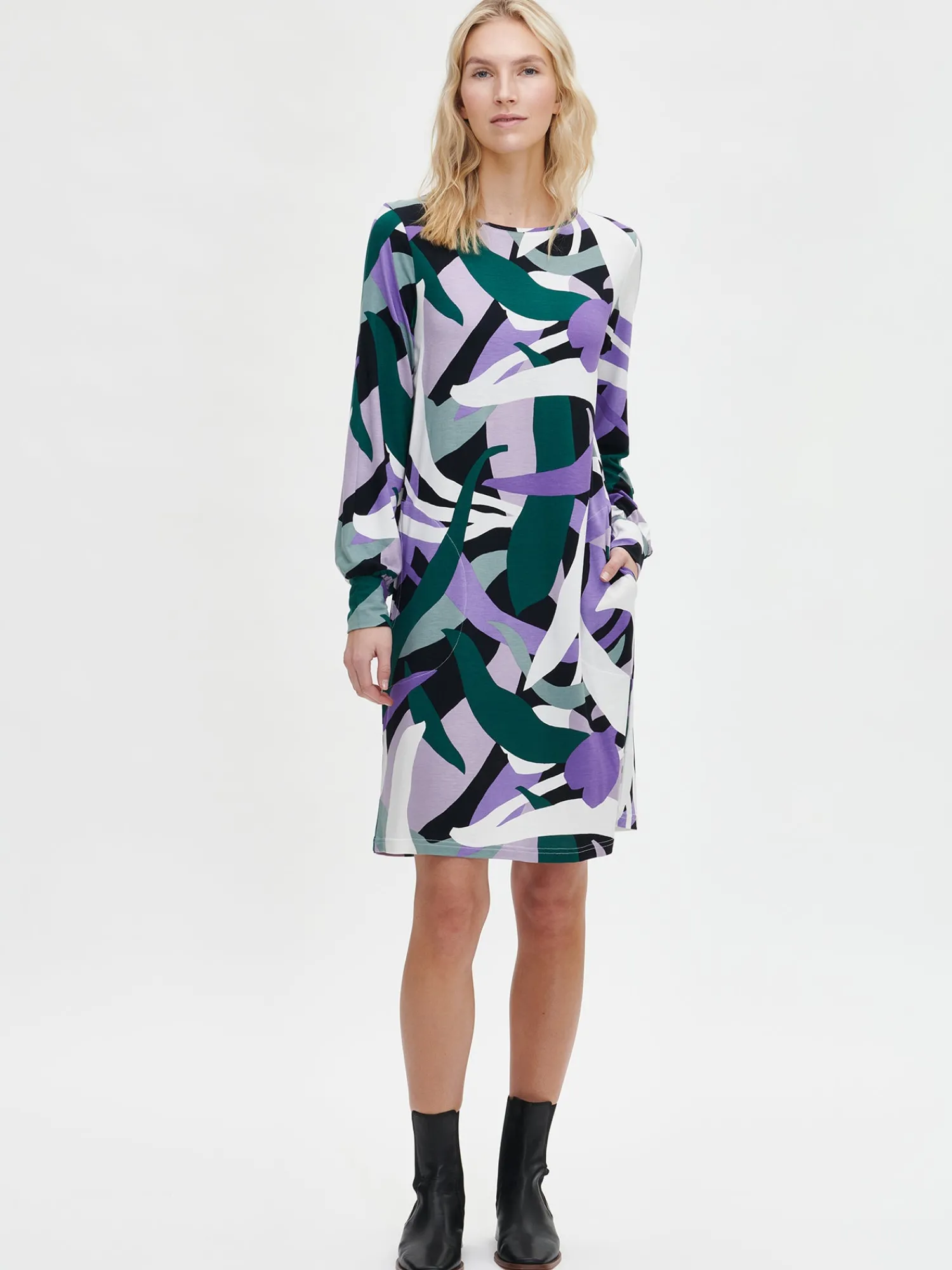 Naisten kuosillinen monivärinen Siimes-mekko. A-linjaisessa mekossa on tereellä viimeistelty ovaali pääntie ja sivuissa taskut. Mekossa on täyspitkät hihat, jotka poimuttuvat kauniisti hihansuun leveän rannekkeen yläpuolelle. Mekon pituus koossa M on noin 95 cm. Kauniisti laskeutuvan mekon materiaali on laadukasta ja miellyttävän tuntuista viskoosi-elastaani-neulosta. Viskoosineulos on sähköistymätöntä ja helppohoitoista. Tuote on valmistettu LENZING™ ECOVERO™ -viskoosista. Materiaalille on ominaista 3-5% kutistuminen ensimmäisessä pesussa.
