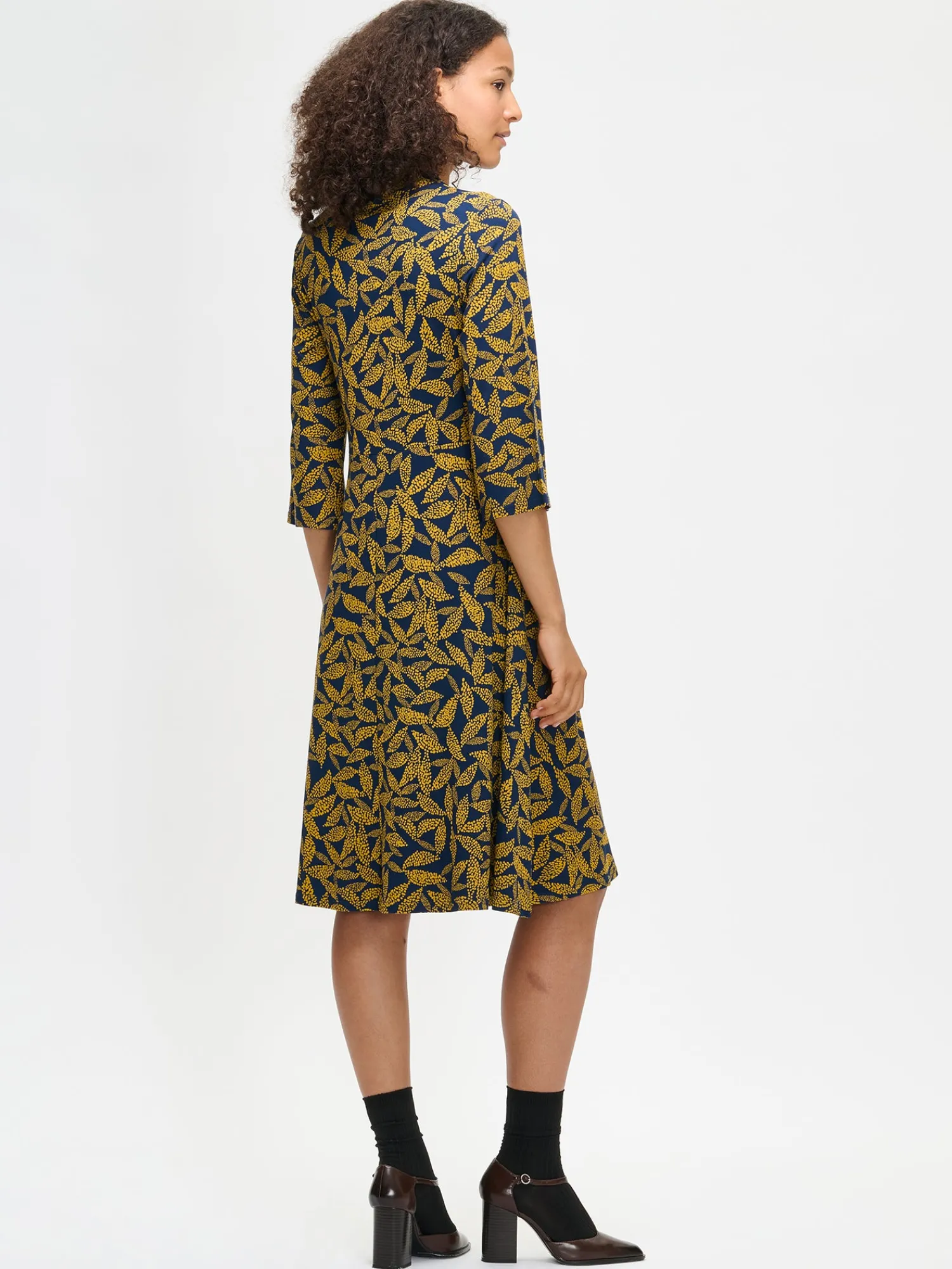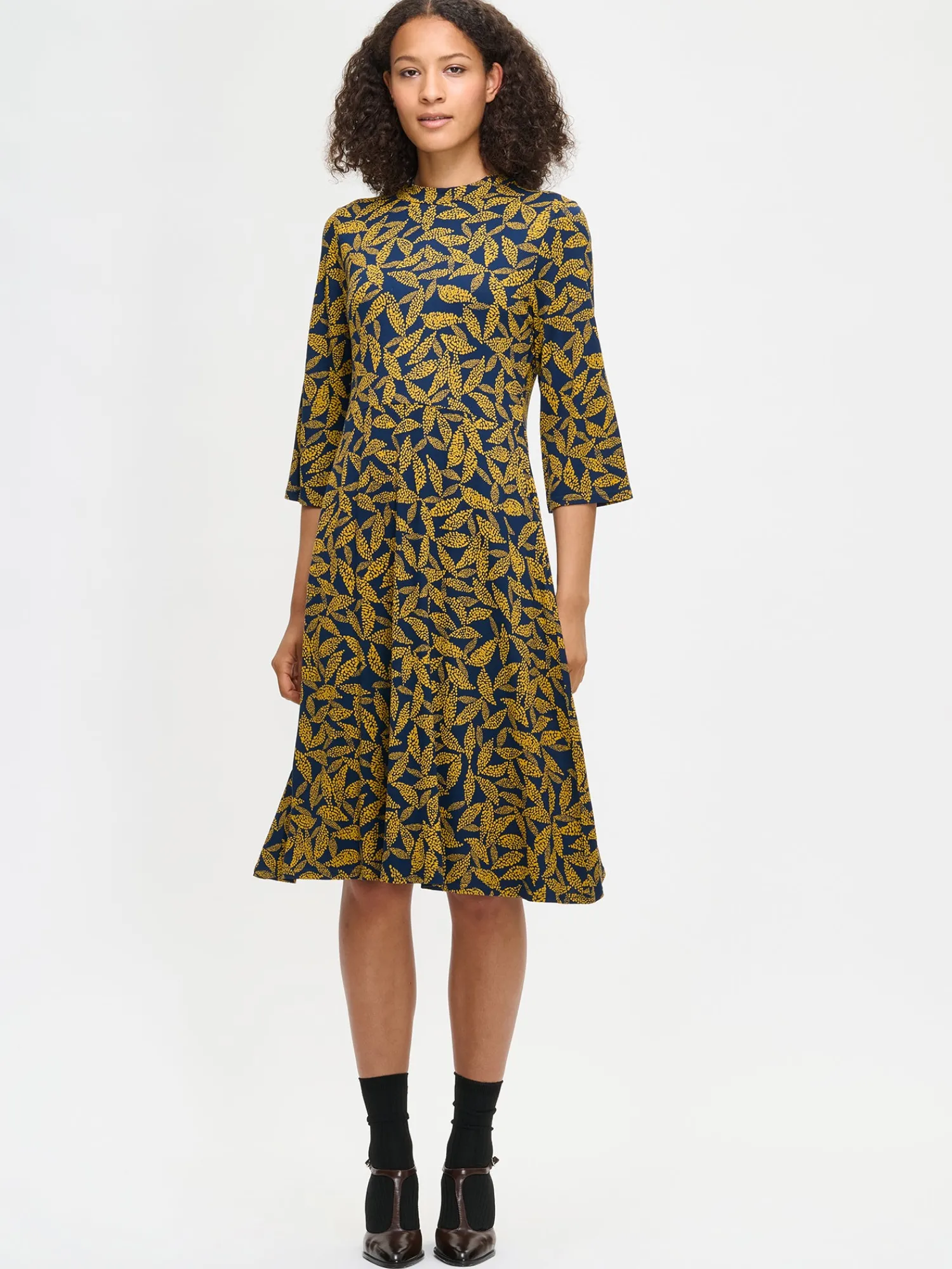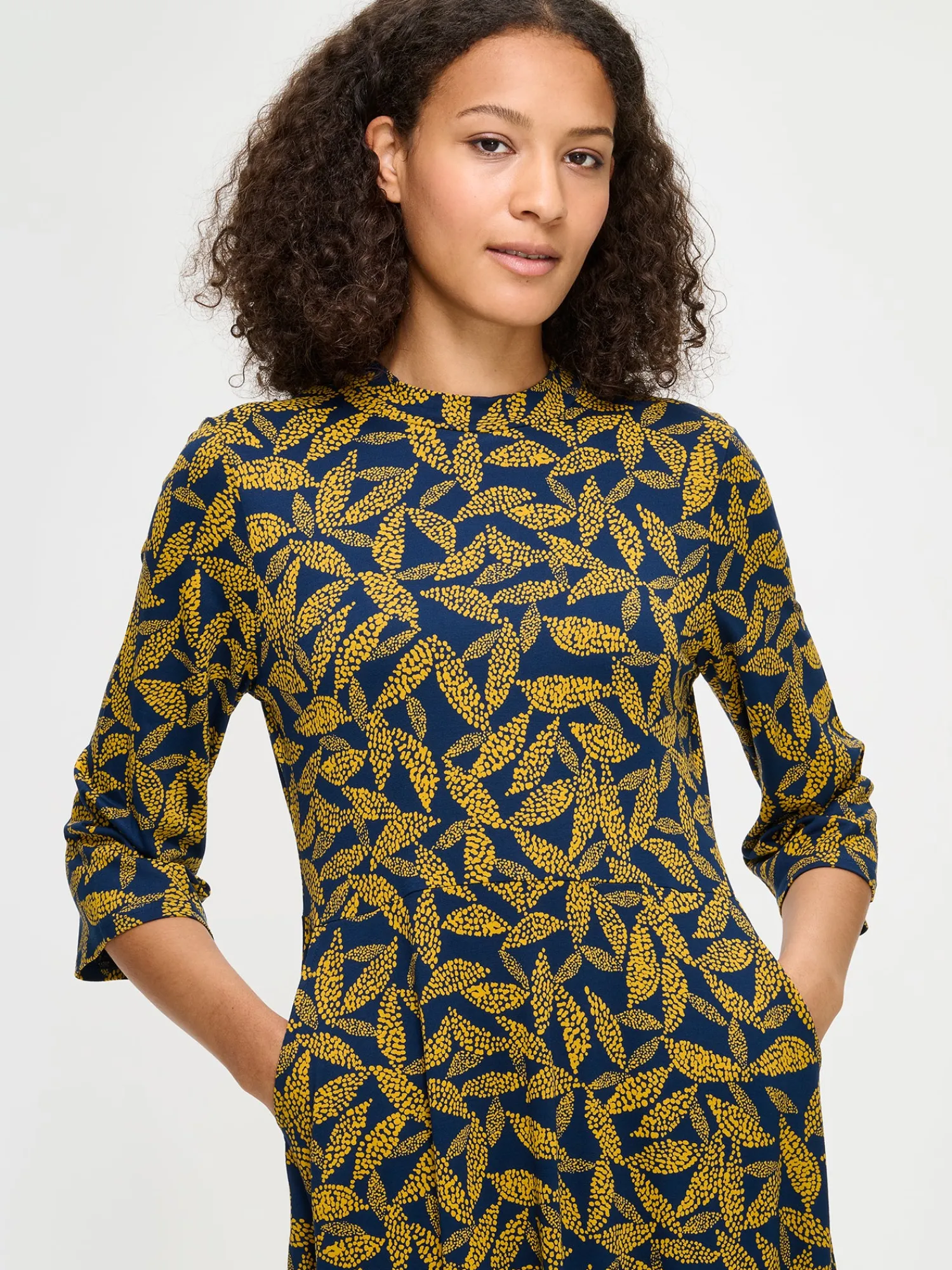 Naisten kuosillinen keltainen Triine-mekko. Mekossa on pieni pystykaulus, sivuissa taskut ja 3/4 pituiset suorat hihat. Mekko on yläosasta istuva ja helmassa on hieman kellotusta. Mekon pituus koossa M on noin 110 cm. Kauniisti laskeutuvan mekon materiaali on laadukasta ja miellyttävän tuntuista, ohutta viskoosi-elastaani-neulosta. Viskoosineulos on sähköistymätöntä ja helppohoitoista. Tuote on valmistettu LENZING™ ECOVERO™ -viskoosista. Materiaalille on ominaista 3-5% kutistuminen ensimmäisessä pesussa.