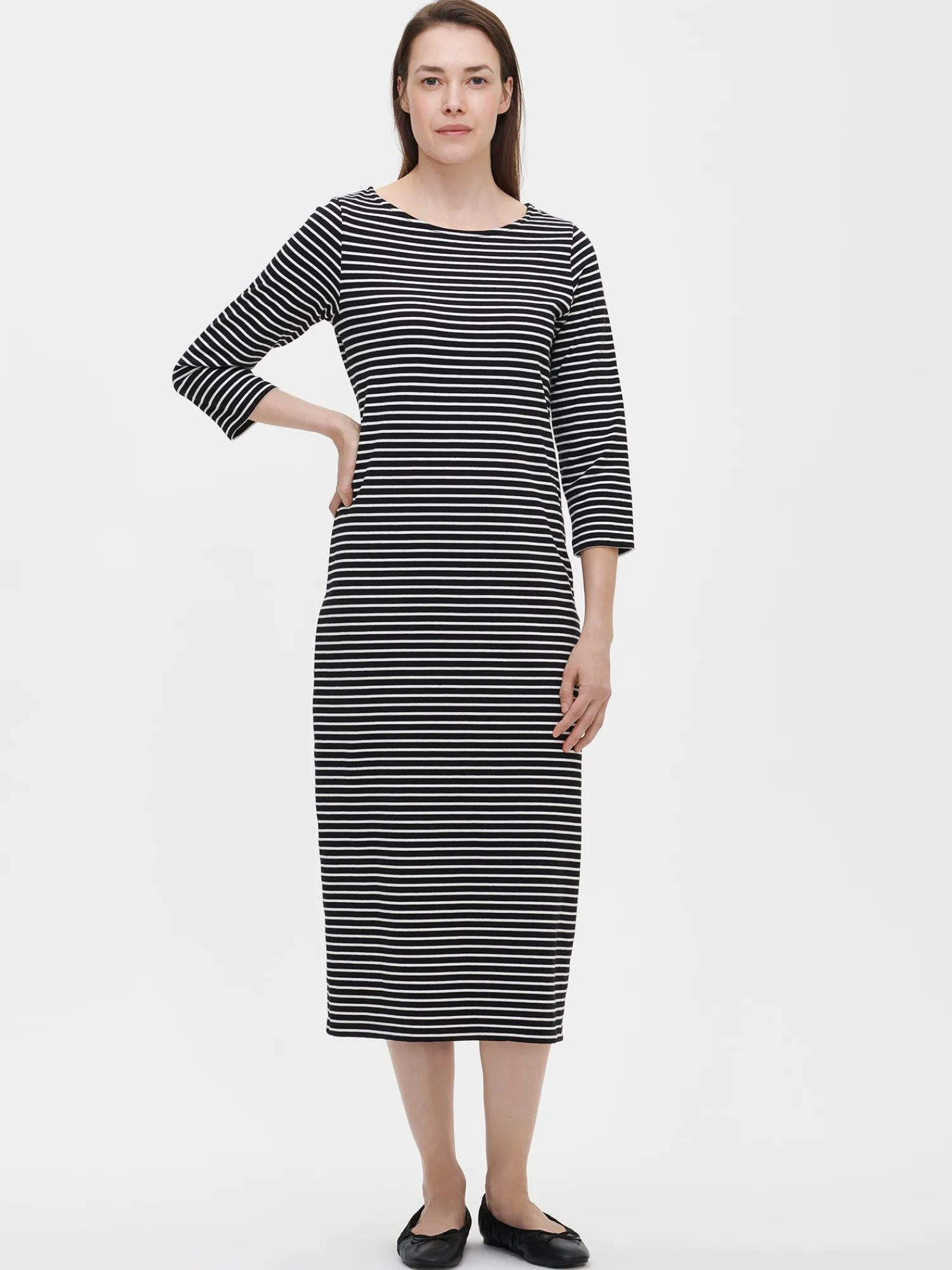 Naisten raidallinen mustavalkoinen Vaaka-mekko. Istuva mekko on tyylikäs valinta arkeen. Mekon voi kerrostaa lämpimän neulepaidan kanssa viileämmällä säällä. Istuvassa mekossa on kantilla viimeistelty venepääntie ja 3/4 pituiset hihat. Mekon pituus koossa M on noin 130 cm. Materiaali on miellyttävän tuntuista ja helppohoitoista puuvillaneulosta. Materiaalille on ominaista 3-5% kutistuminen ensimmäisessä pesussa. Pesun jälkeen muotoile tuote kosteana.