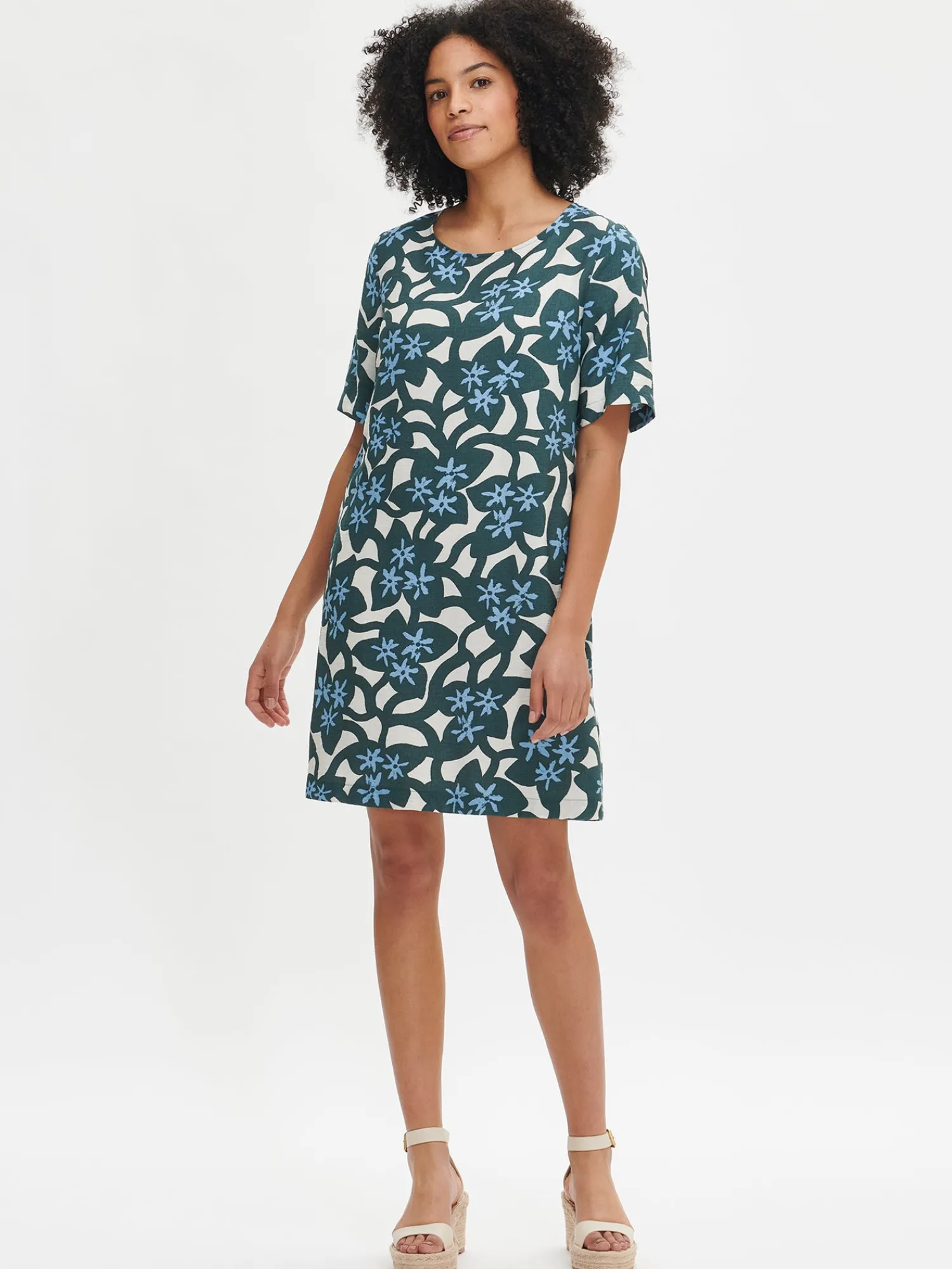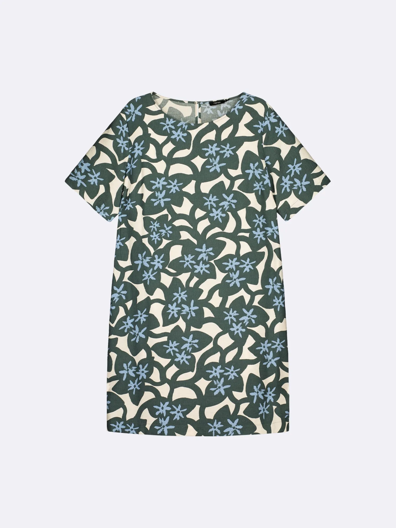 Naisten suoralinjainen kuosillinen vihreä Verna-mekko. Ihana värikäs kesämekko on mukava vaate niin arkeen kuin lomalle. Mekossa on kantilla viimeistelty ovaali pääntie, jonka takana on nappihalkio. Mekon väljät hihat ovat 2/4 pituiset ja sivuissa on taskut. Mekon pituus koossa 38 on noin 95 cm. Materiaali on kaunista eläväpintaista kudottua viskoosi-polyamidikangasta.