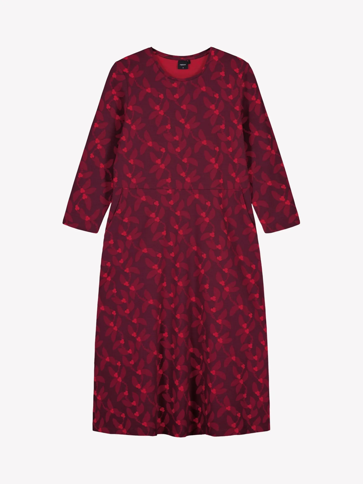 Naisten kuosillinen punainen Vieno-mekko. Mekossa on tereellä viimeistelty ovaali pääntie, sivuissa taskut ja 3/4 pituiset hihat. Mekon helma kellottuu kauniisti. Mekon pituus koossa M on noin 110 cm. Materiaali on miellyttävän tuntuista ja helppohoitoista puuvilla-elastaani-neulosta.