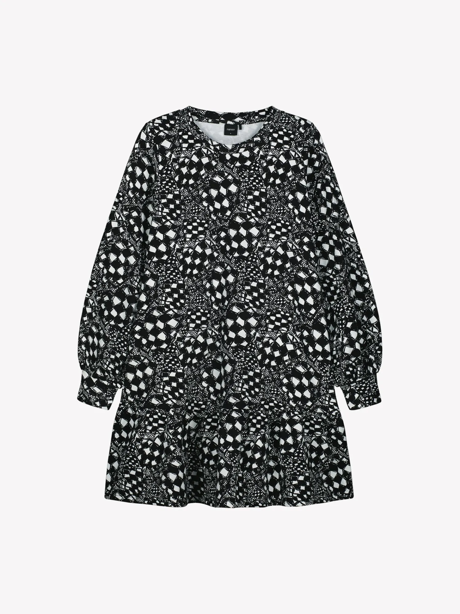 Naisten rento mustavalkoinen Virkkuu-mekko. Malliltaan rennon tyylikäs mekko on mukava päällä, ja siksi se on ehdoton suosikkivaate. Lyhyessä mekossa on pyöreä pääntie, sivuissa taskut, helmassa poimutus ja kauniisti hihansuihin poimuttuvat täyspitkät hihat. Mekon pituus koossa M on noin 90 cm. Materiaali on miellyttävän tuntuista, paksumpaa interlock-neulosta.