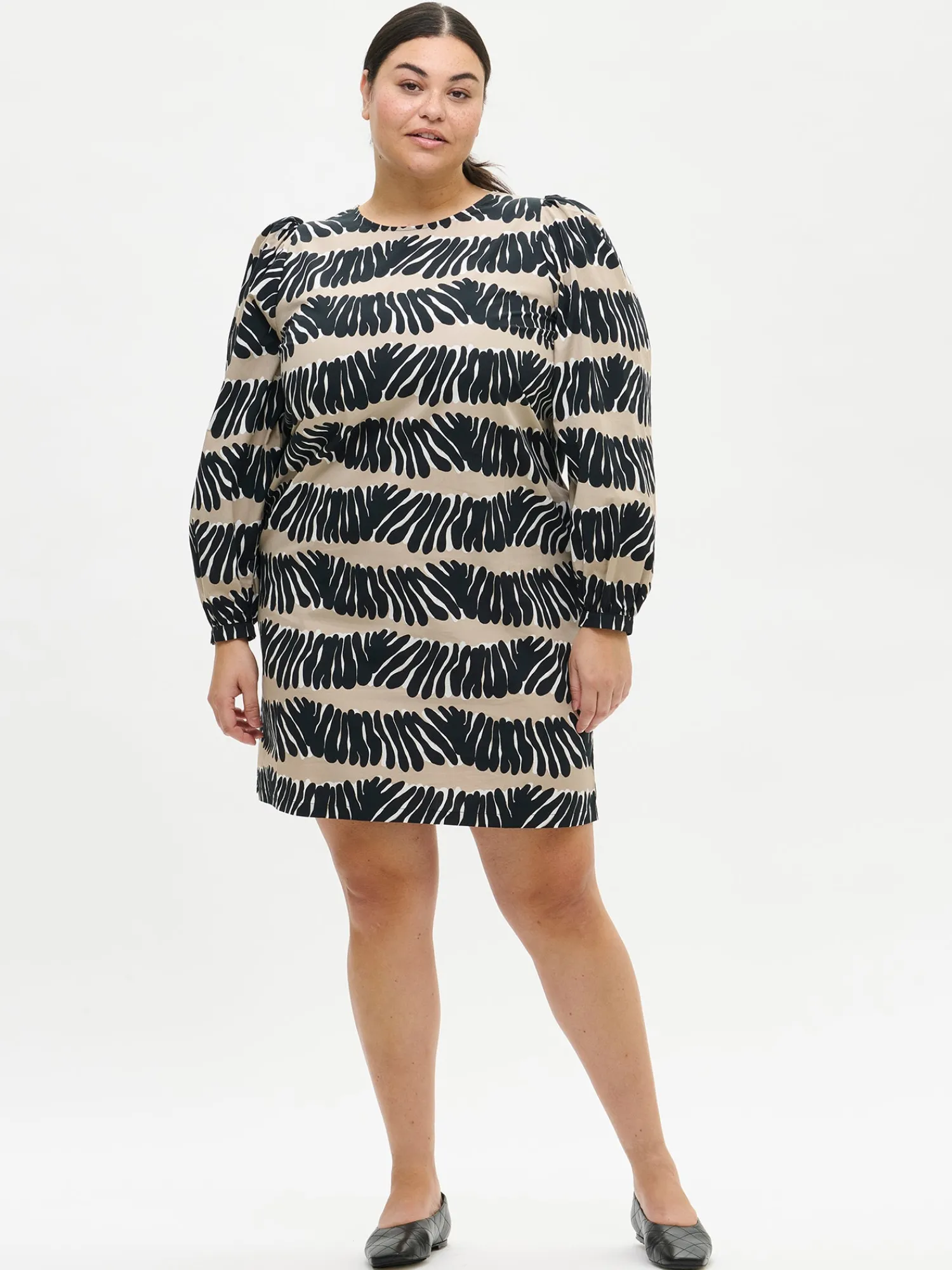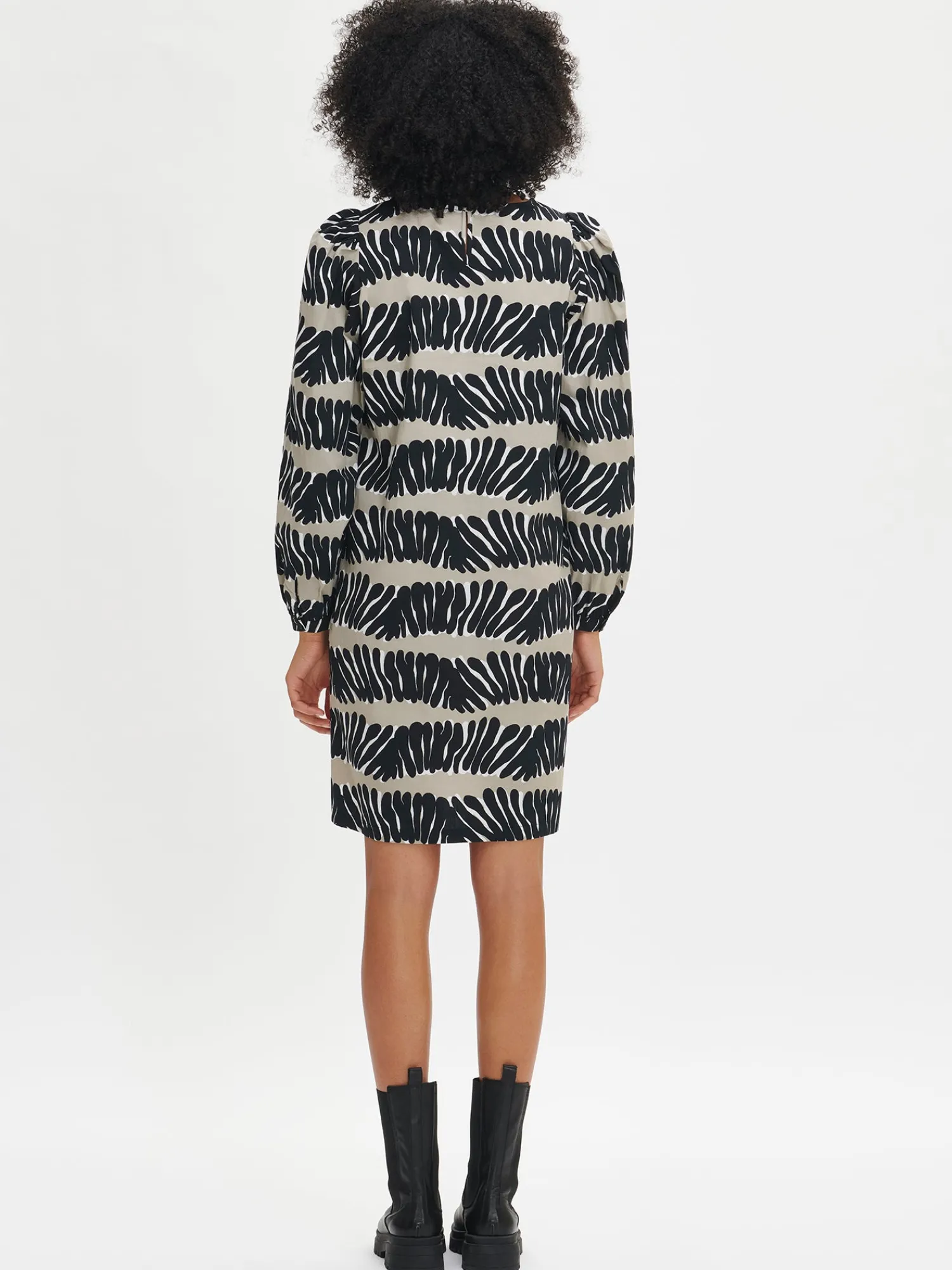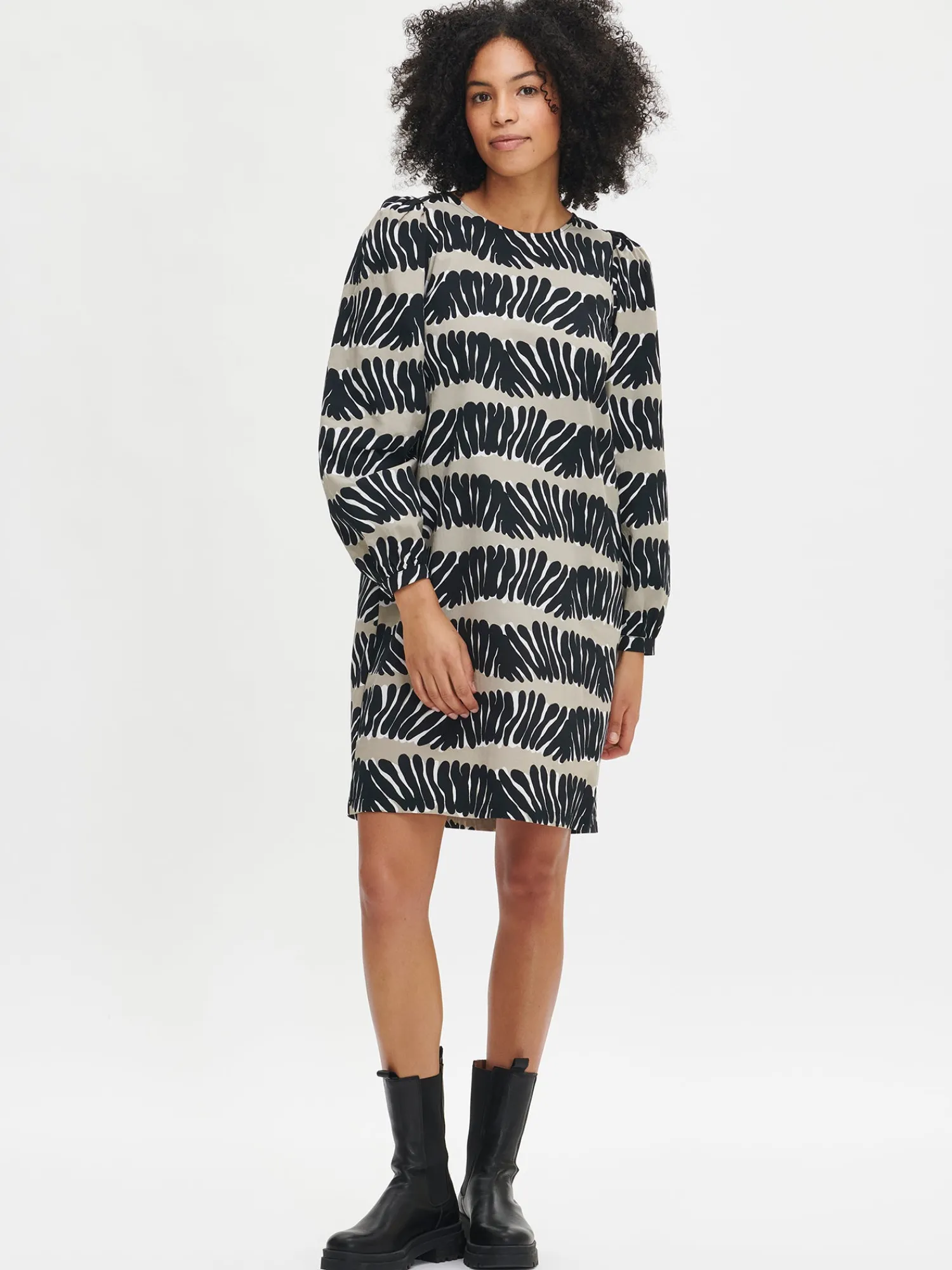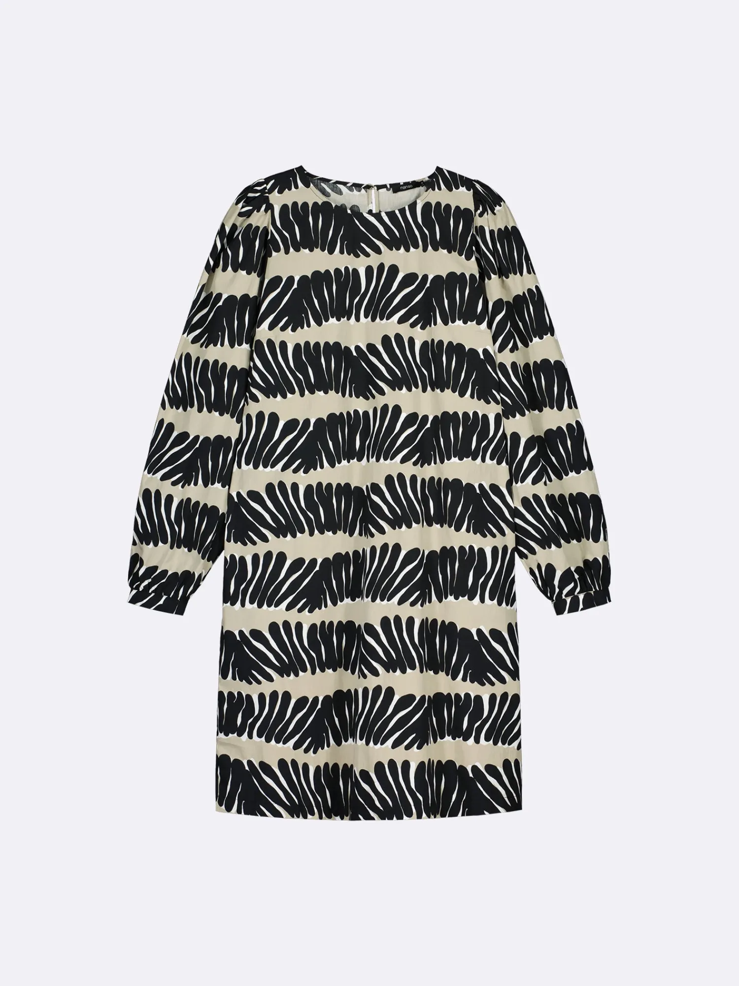 Naisten kuosillinen beige Vuono-mekko. Mekossa pyöreä pääntie, jossa takana halkio ja nappikiinnitys. Täyspitkät hihat poimuttuvat olalla ja hihansuun kaitaleen yläpuolella. Mekon sivuissa on taskut. Mekon pituus koossa 38 on noin 98 cm. Materiaali on kevyttä, mutta ryhdikästä puuvilla-popliinia. Materiaalille on ominaista 3-5% kutistuminen ensimmäisessä pesussa.