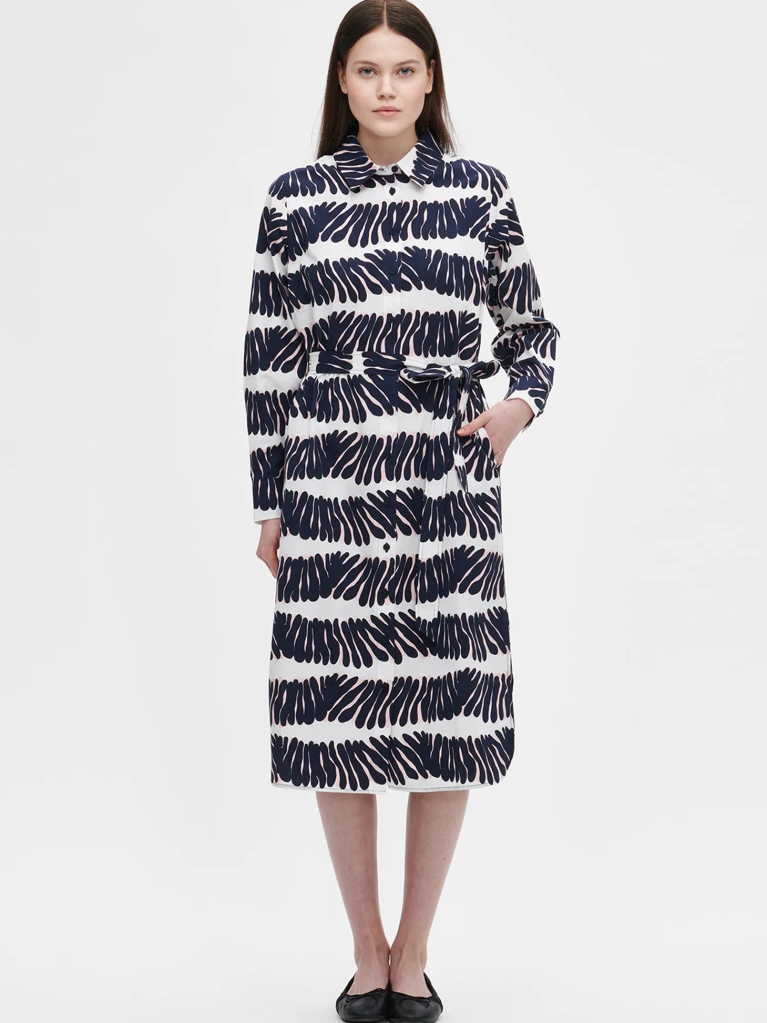 Naisten kuosillinen tummansininen Vuono-mekko. Tyylikäs paitamekko on täydellinen arkeen. Mekossa on edessä napitus, rintamuotolaskokset, klassinen paitapuserokaulus ja takana laskos. Mekossa on täyspitkät hihat, joiden hihansuissa on nappikalvosimet. Vyötäröllä on irroitettava vyö. Mekon helma on pyöristetty ja sivuissa on halkiot. Mekon pituus koossa 38 on noin 120 cm. Materiaali on kevyttä, mutta ryhdikästä puuvilla-popliinia.